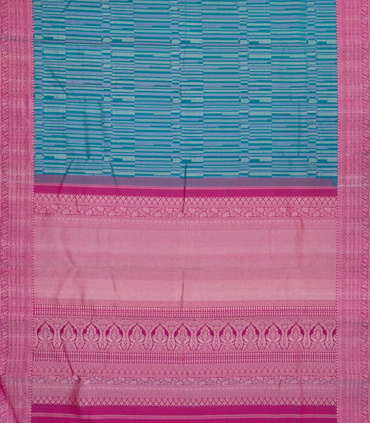 Cyan Handloom Kanchipuram Silk Saree With Stripes & Contrast Border-KA13596