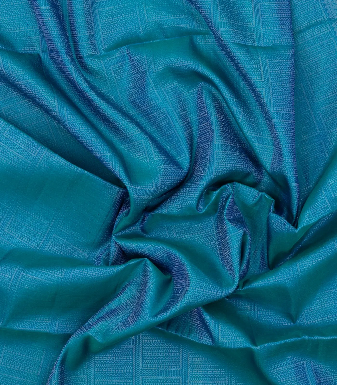 This handwoven soft silk saree is filled with small motifs in cyan body along with contrast border and pallu