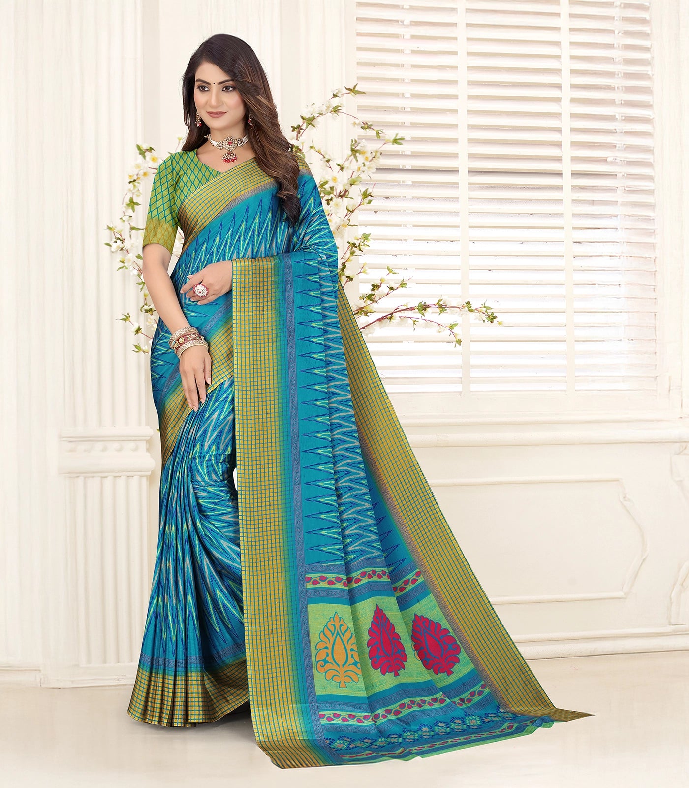 This woven synthetic turkey saree is printed with geometric motifs in cyan body along with border and pallu