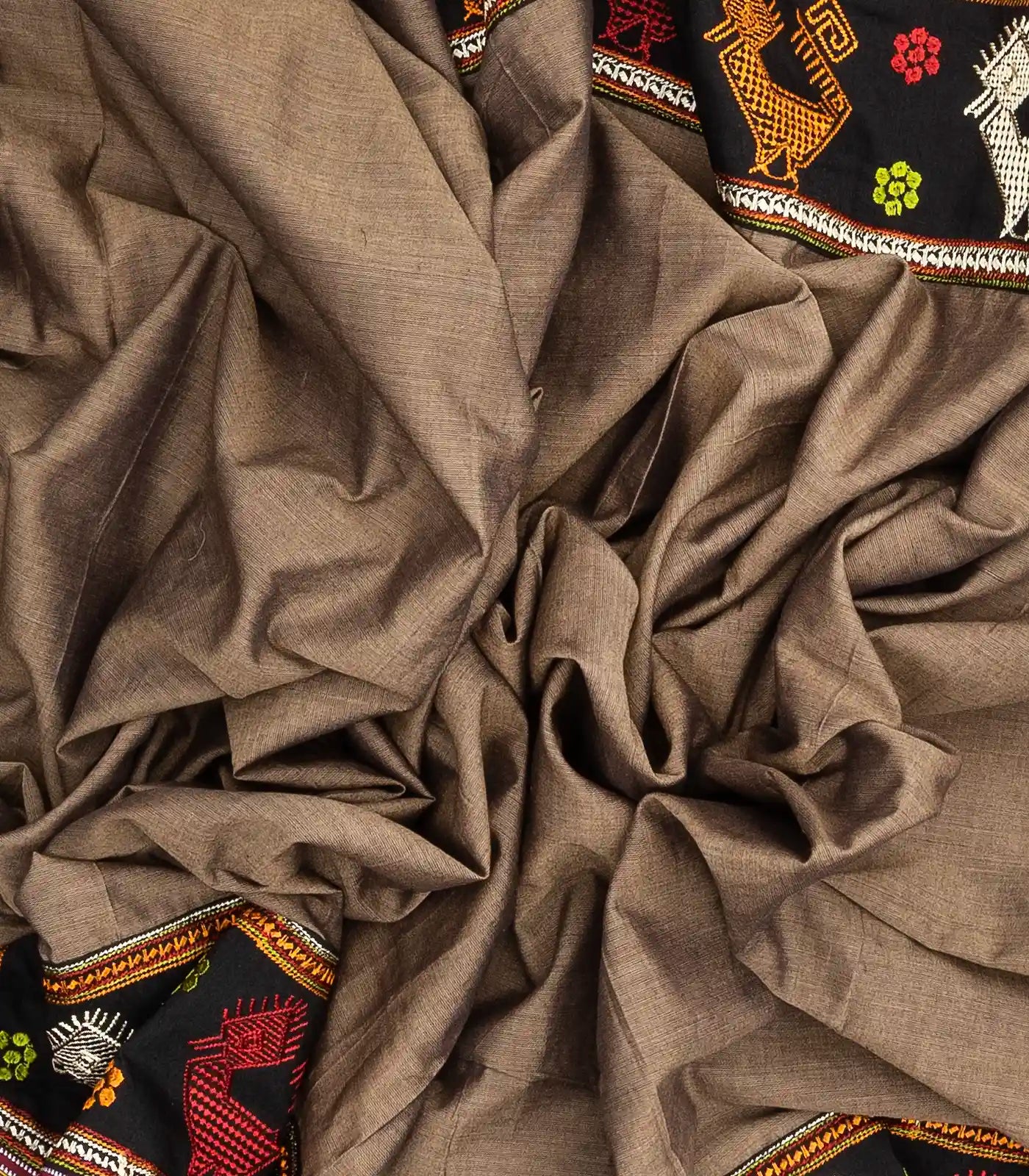 This woven cotton saree is filled with plain dark beige body along with contrast kasuti hand embroidery motifs in border and pallu