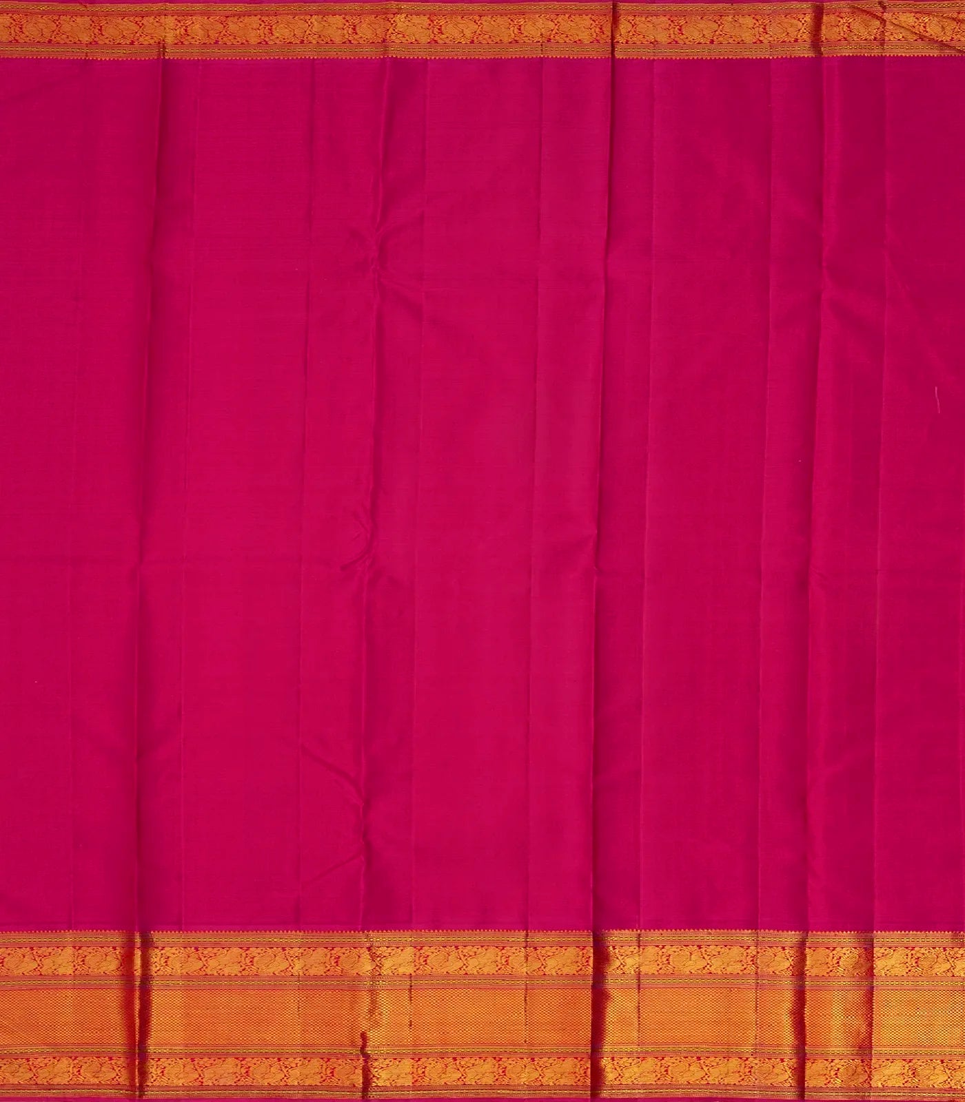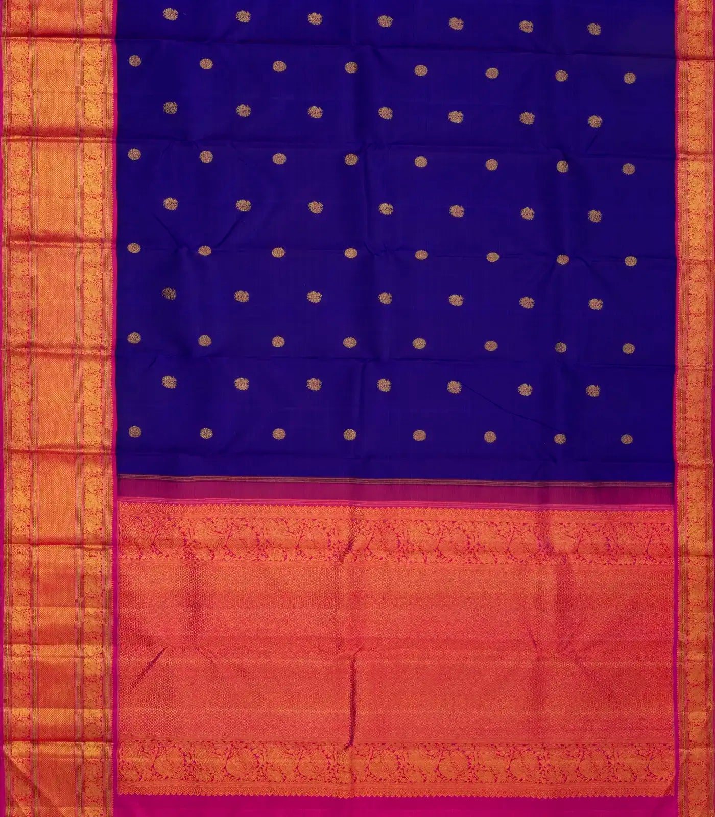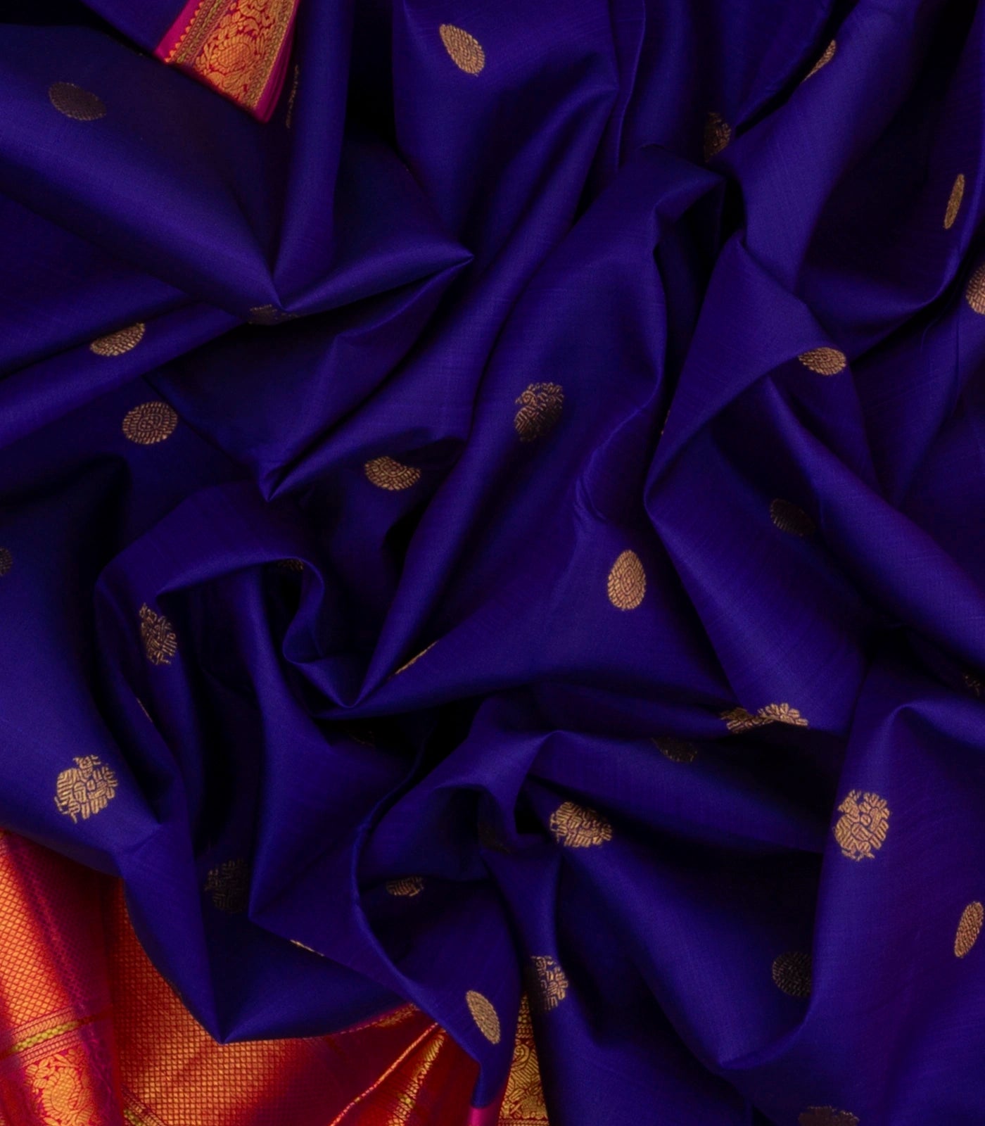 This handwoven korvai kanchipuram silk saree is filled with zari buttas in dark blue body along with contrast pink border and pallu