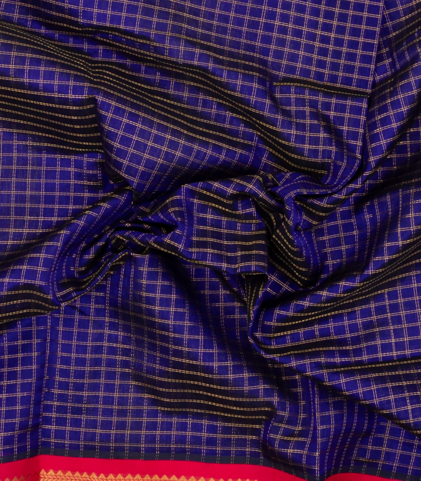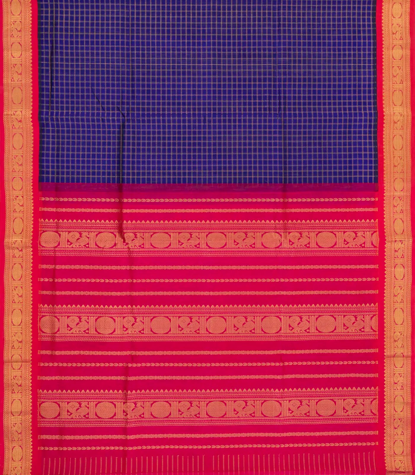Dark Blue Handloom Korvai Silk Cotton Saree With Checks & Contrast Border-SC3873