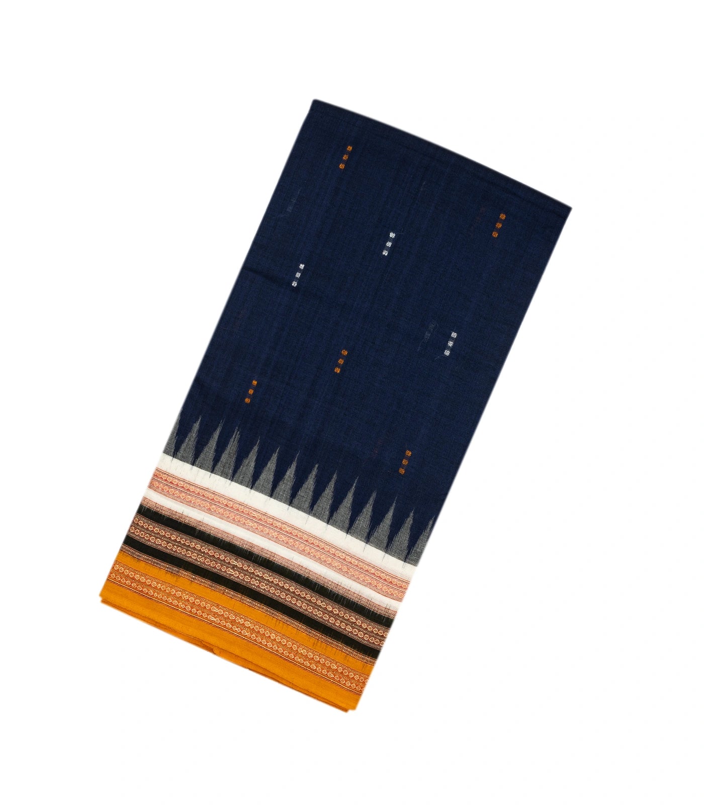 This handwoven orissa cotton saree is filled with button motifs in dark blue body along with contrast mustard border and tie & dye motifs in pallu