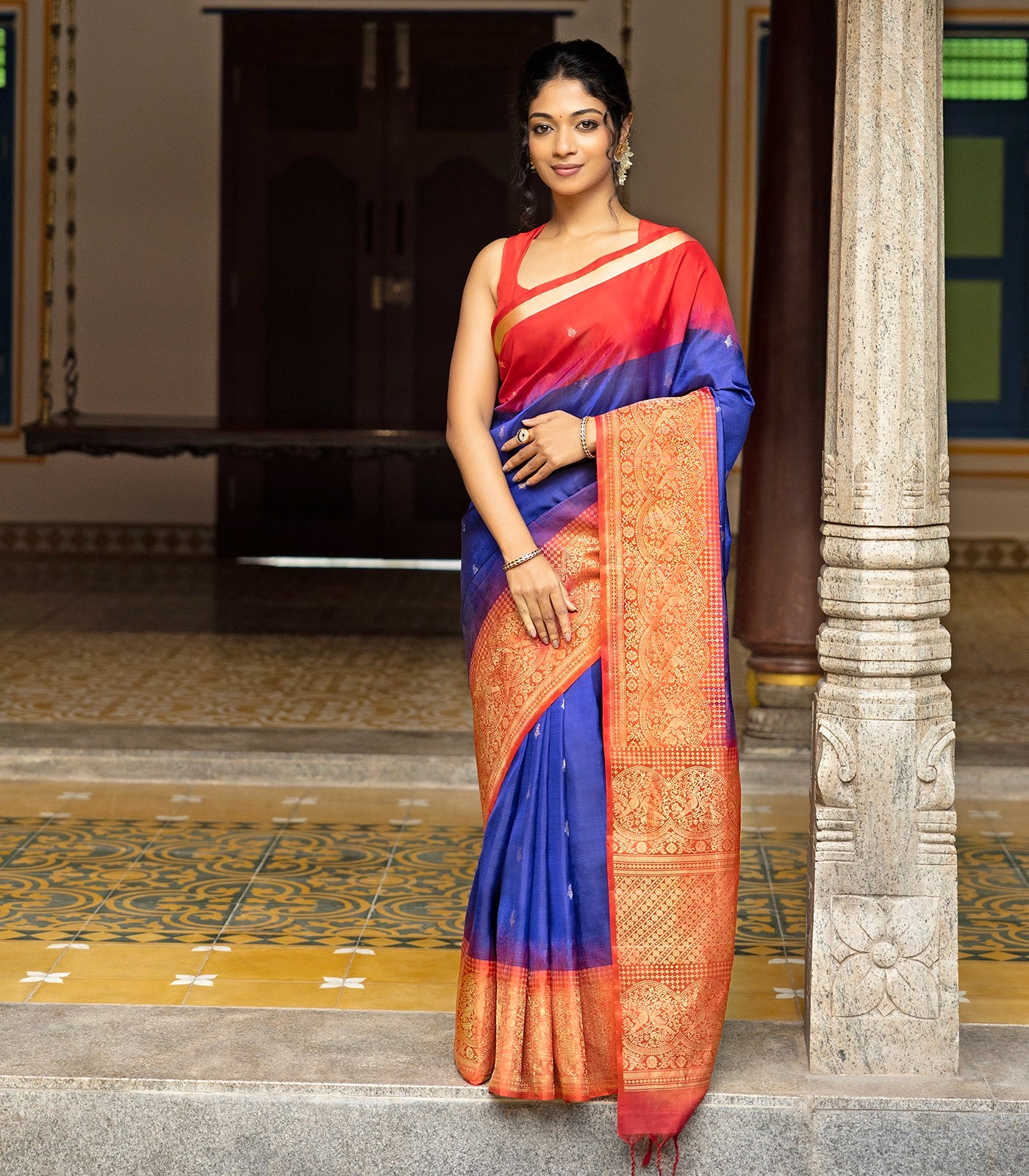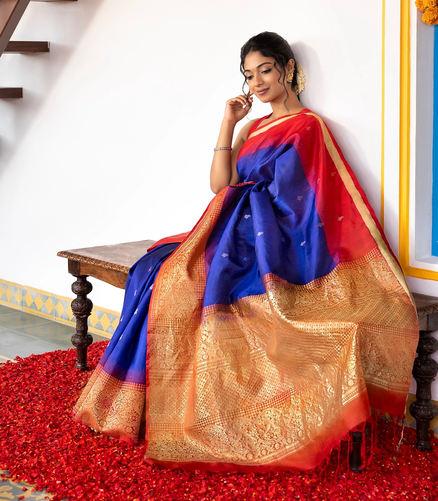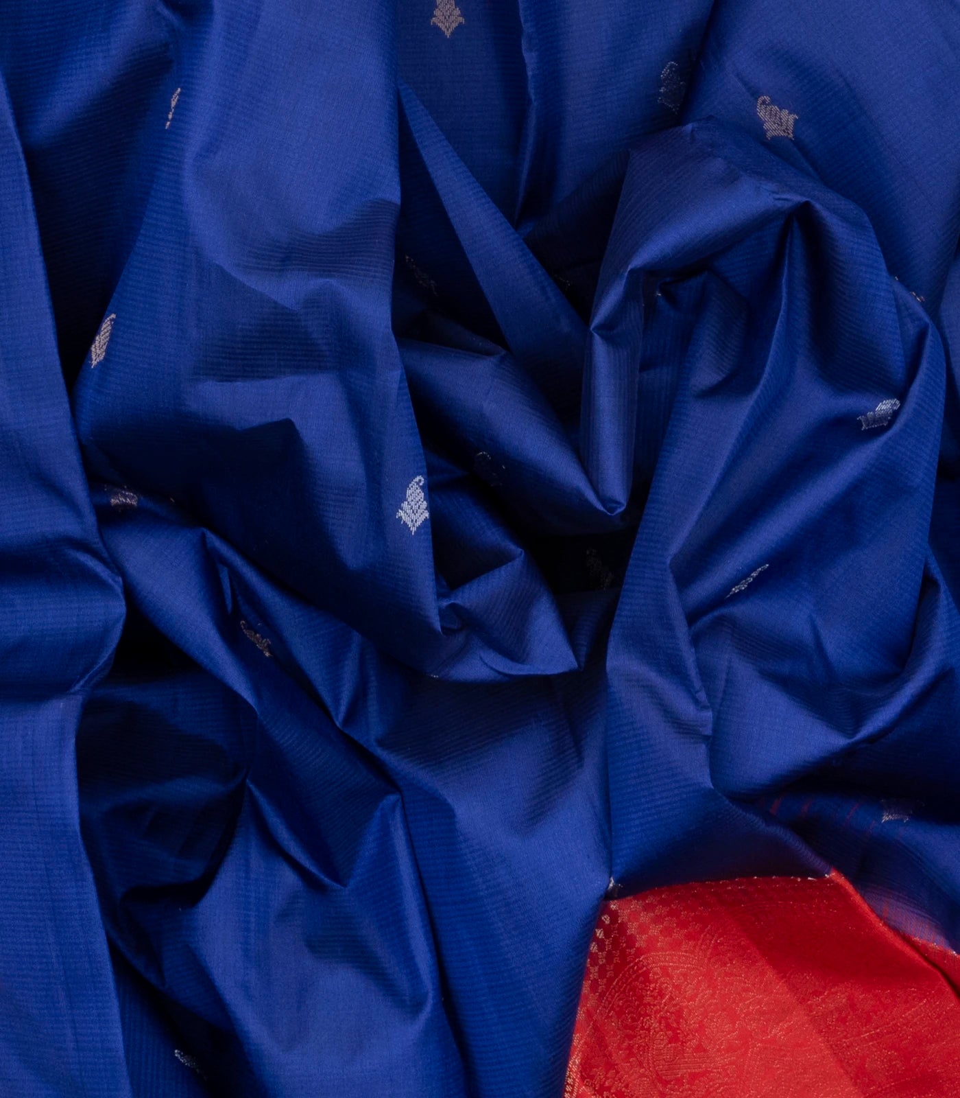 This handwoven soft silk saree is filled with mango buttas in dark blue body along with contrast red border and pallu