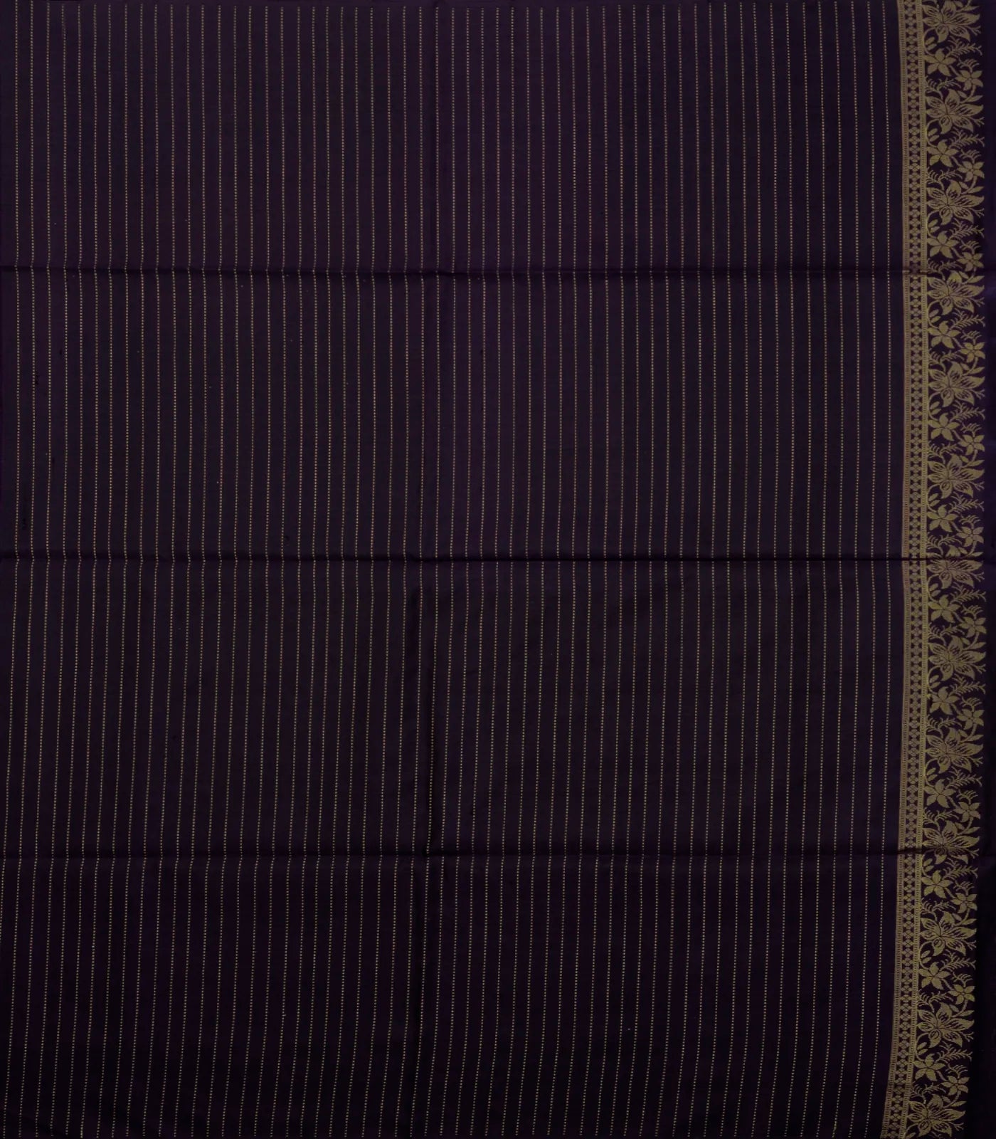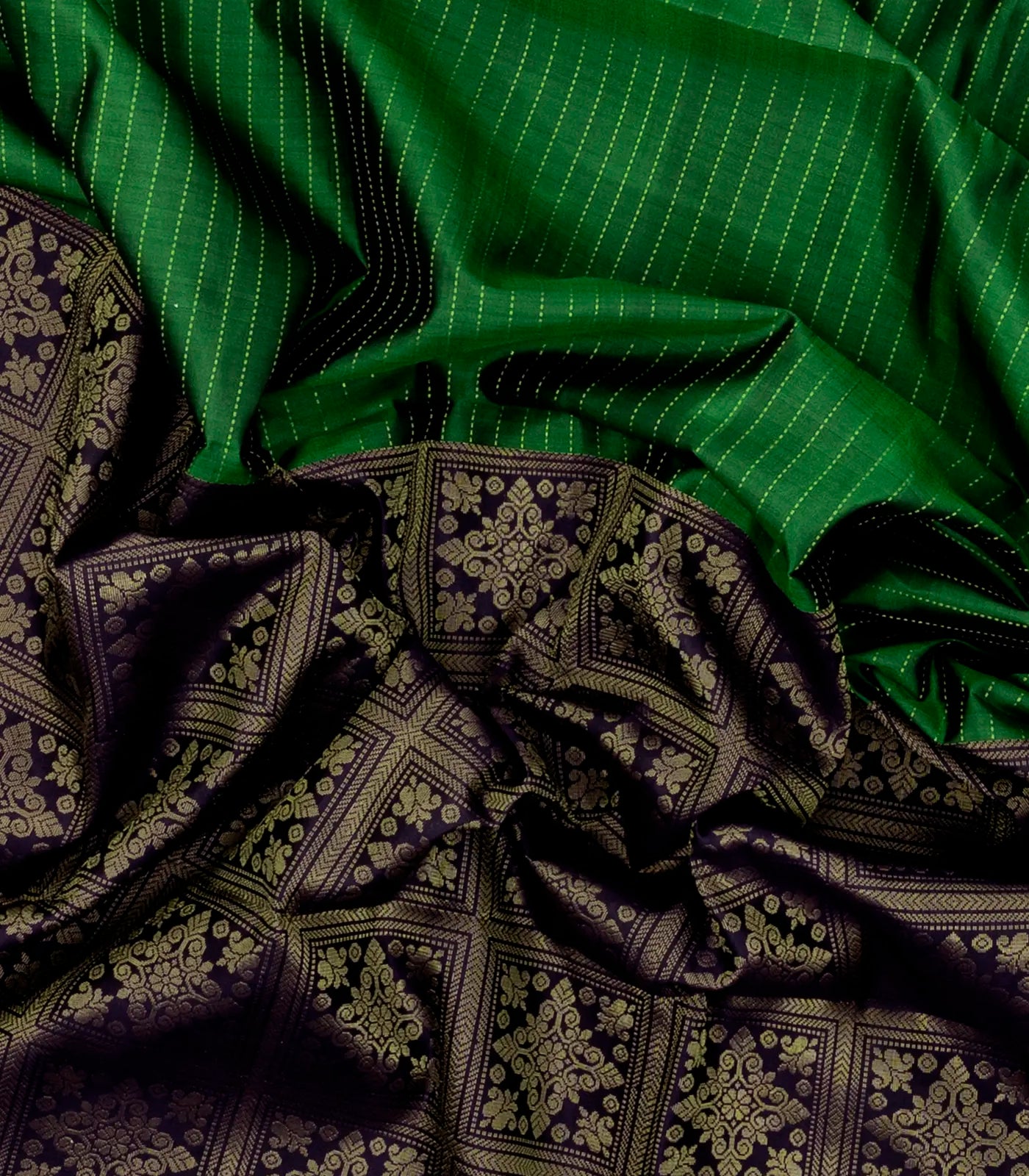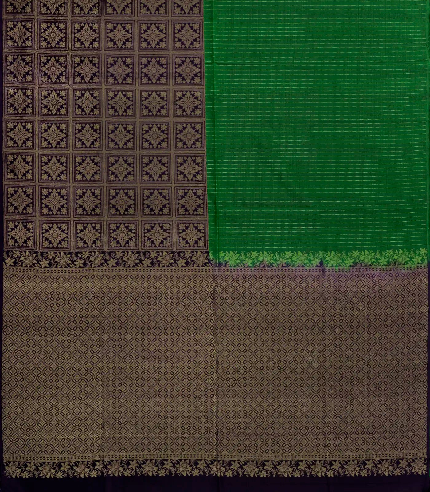 This handwoven soft silk saree is filled with floral motifs & stirpes in black & dark green body along with pallu