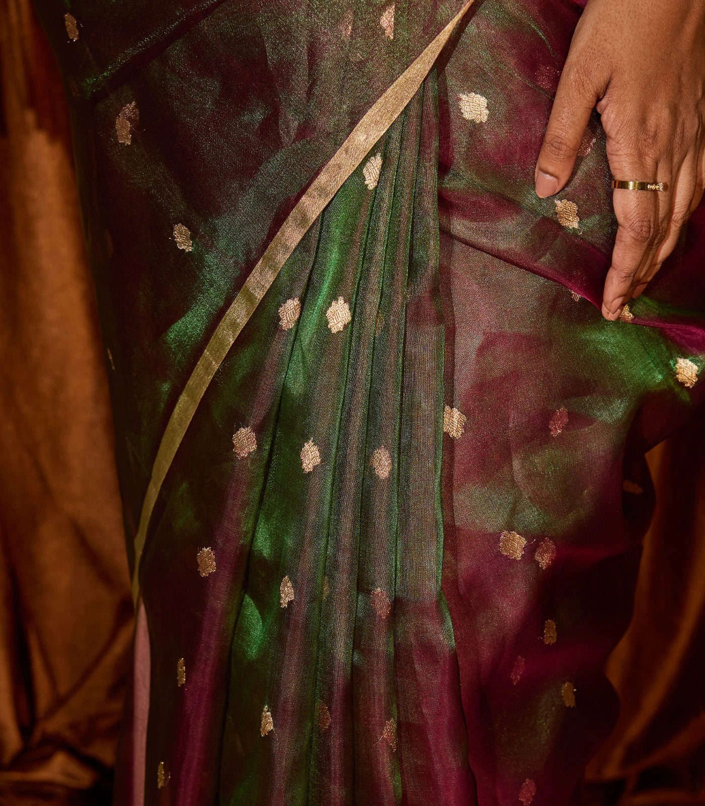 This handwoven banarasi tissue silks saree filled with floral motifs in dark green body along with pallu