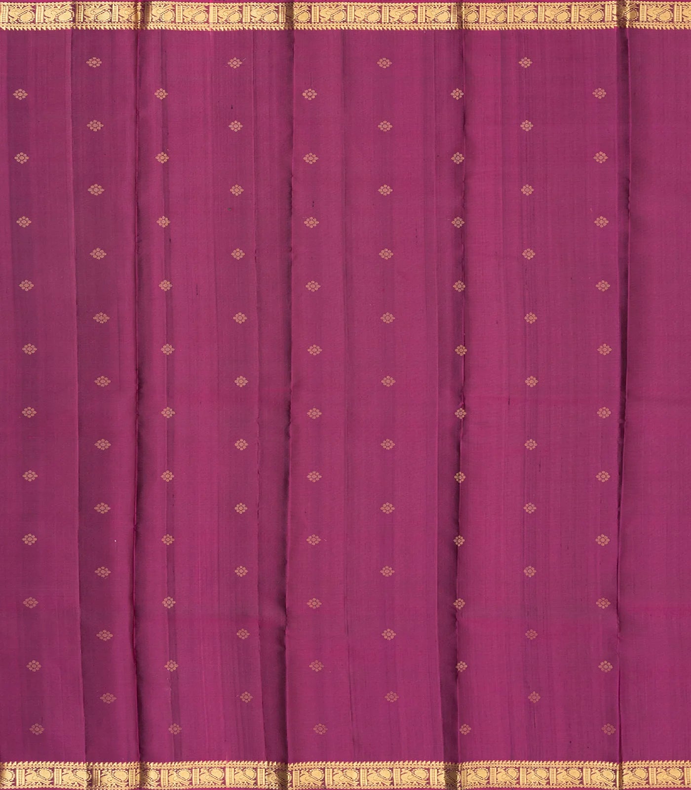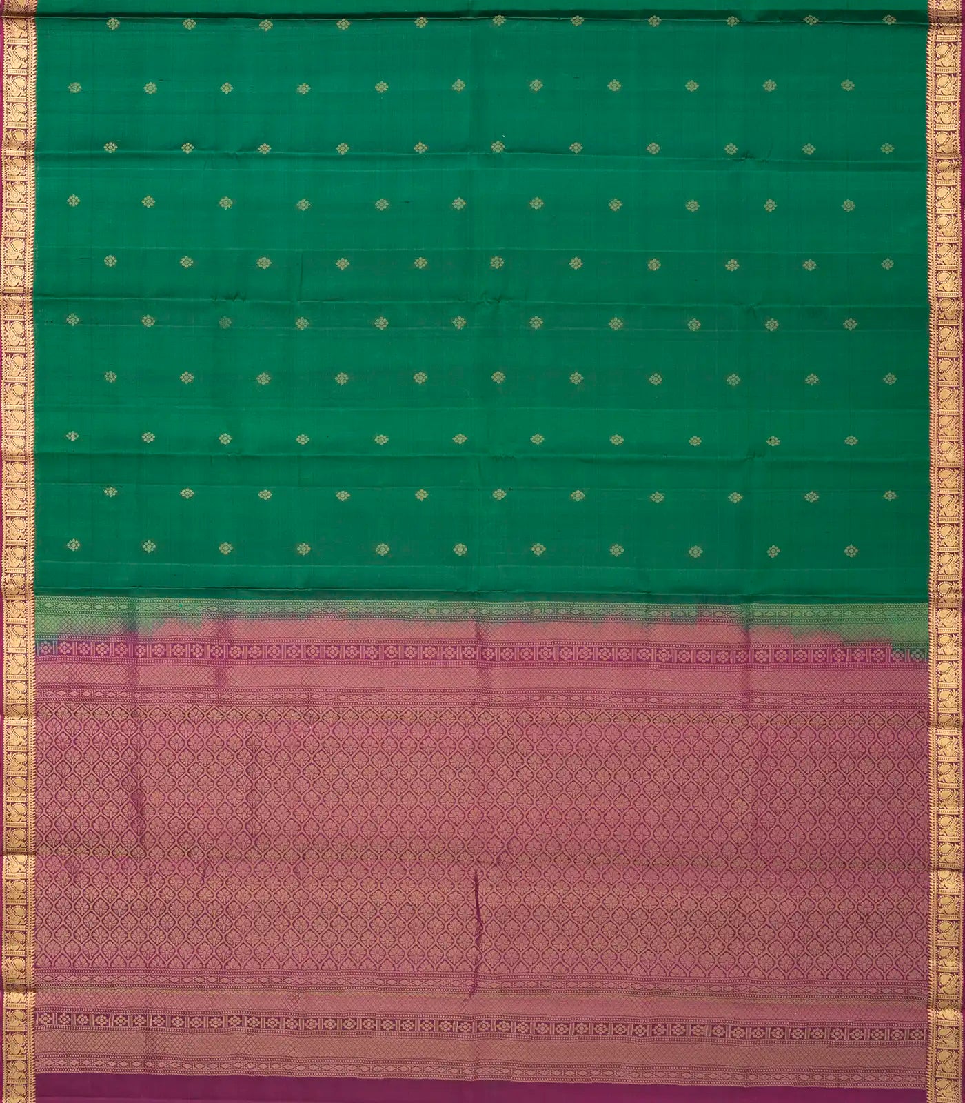 This handwoven soft silk saree is filled with floral buttas in dark green body along with contrast border and pallu