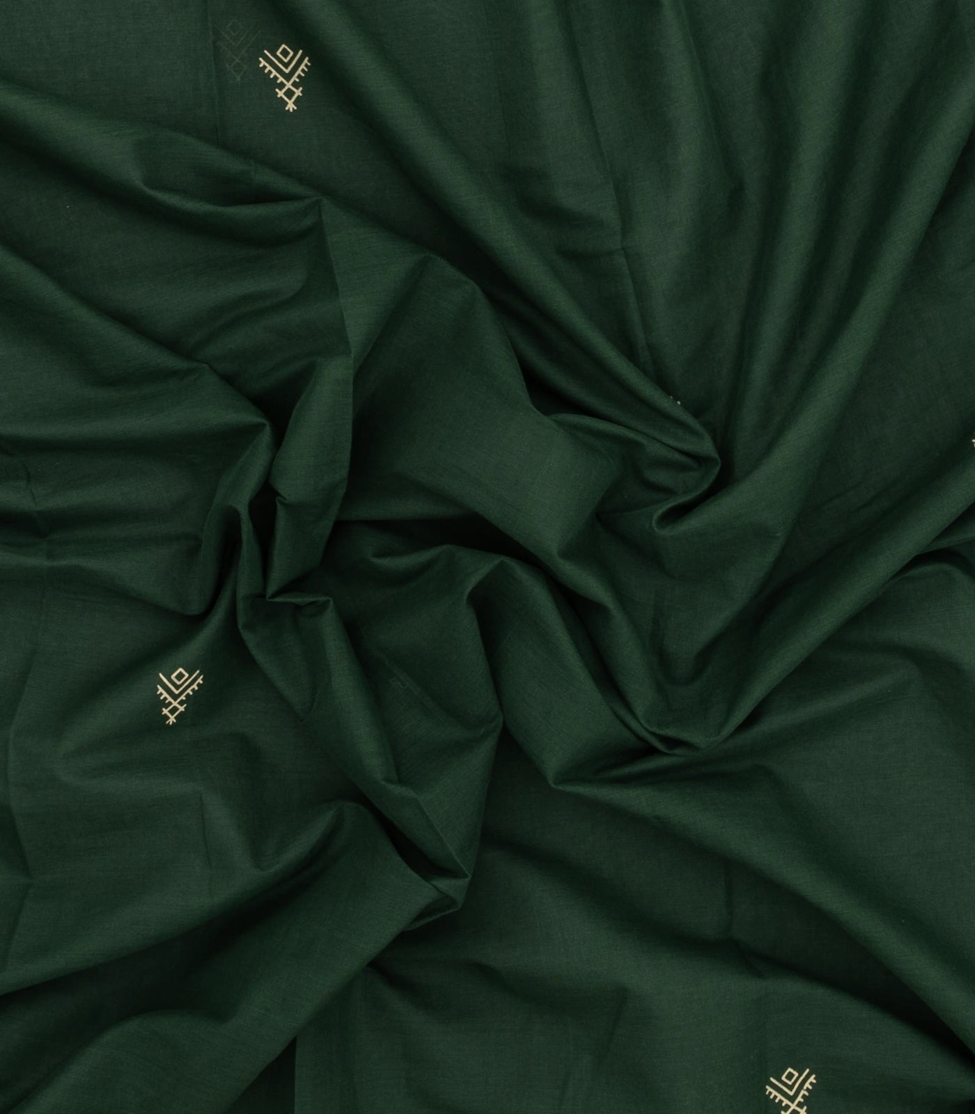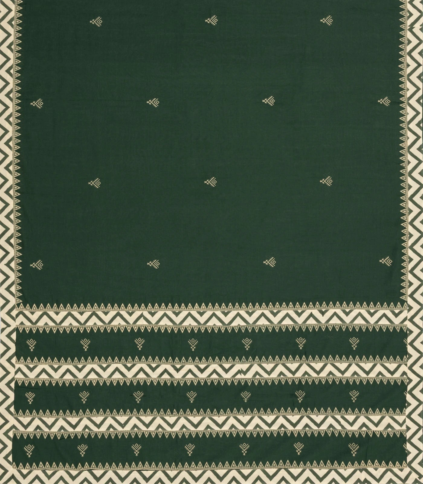 This woven chirala cotton saree is filled with geometric motifs in dark green body along with printed floral motifs in border and pallu