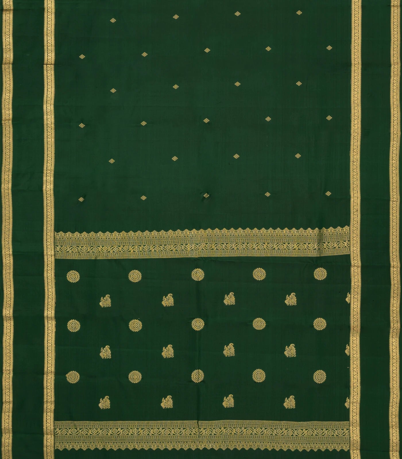 This woven pure silk saree is filled with diamond buttas in dark green body along with zari border and pallu