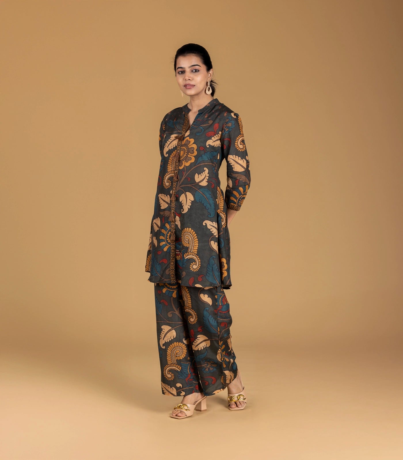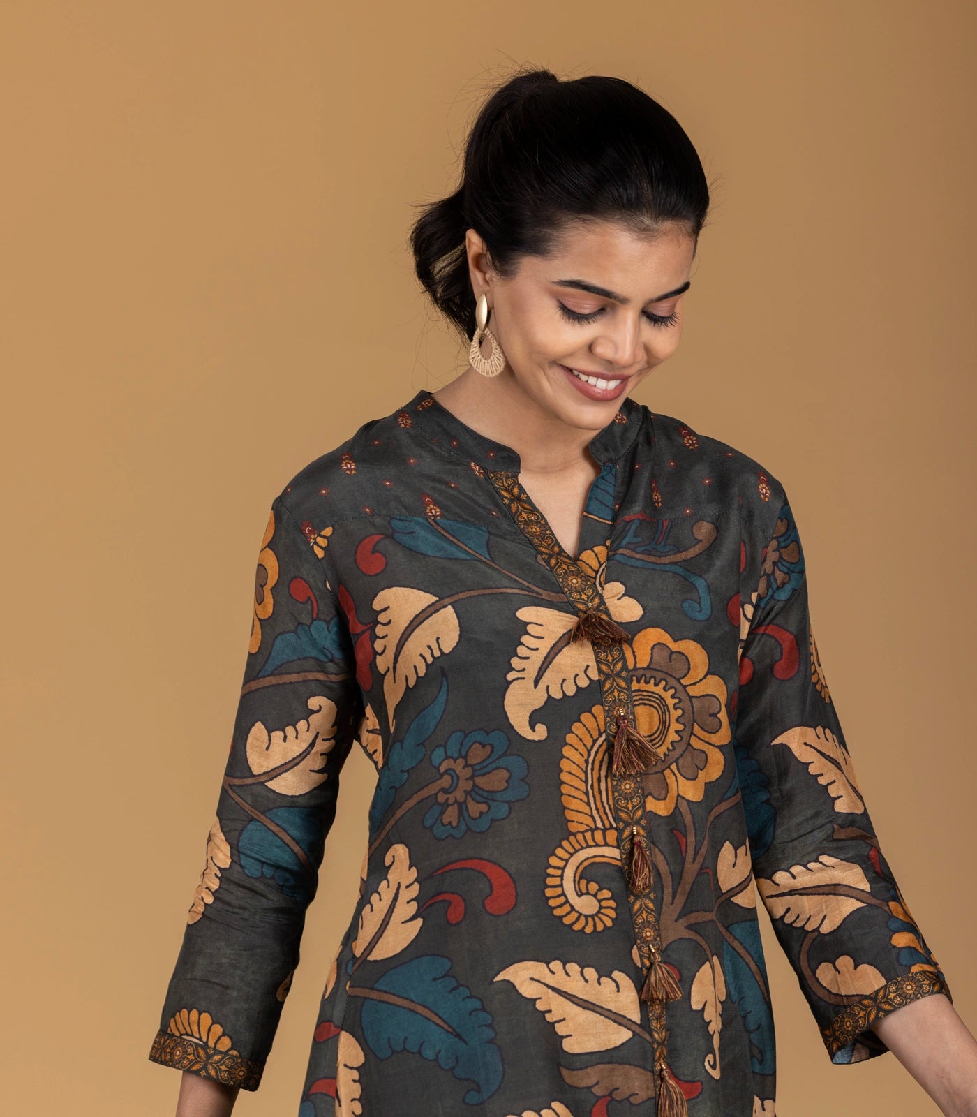 ● Stylised mandarin collar neckline tassel detailing in centre front ● 3/4th sleeves ● A-line silhouette ● Paired with printed straight fit trouser