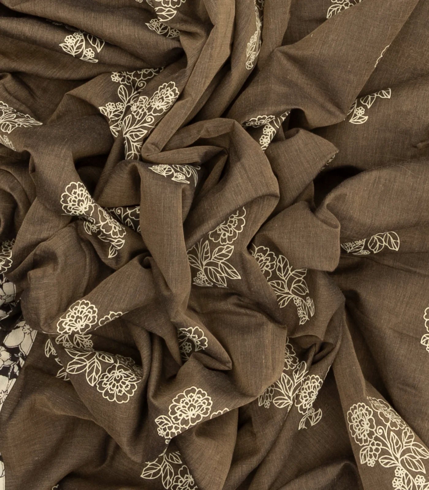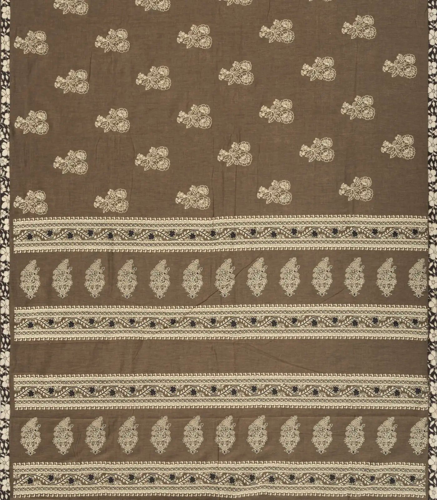 This woven chirala cotton saree is filled with printed floral motifs in dark grey body along with printed selvage