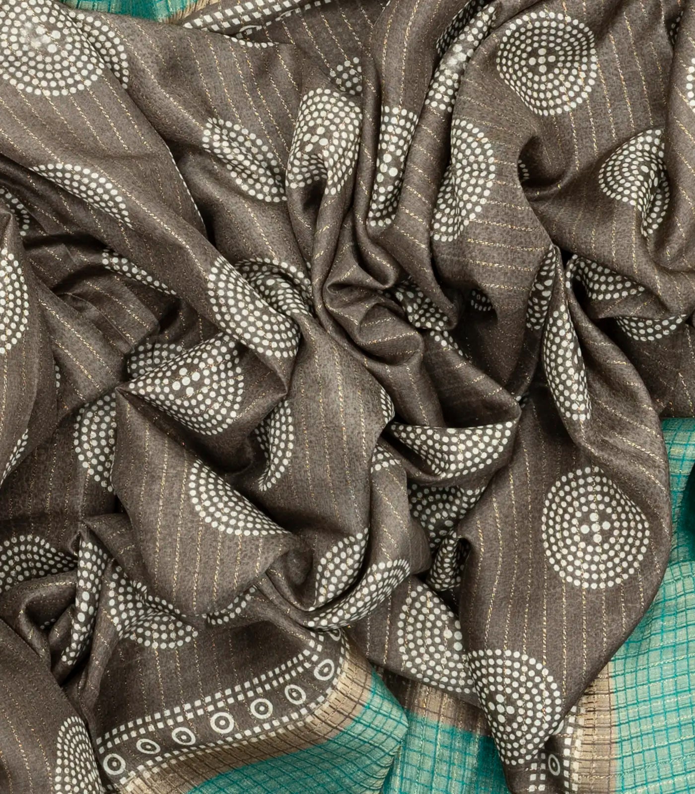 This woven synthetic dola saree is filled with printed motifs in dark grey body along with contrast border and pallu