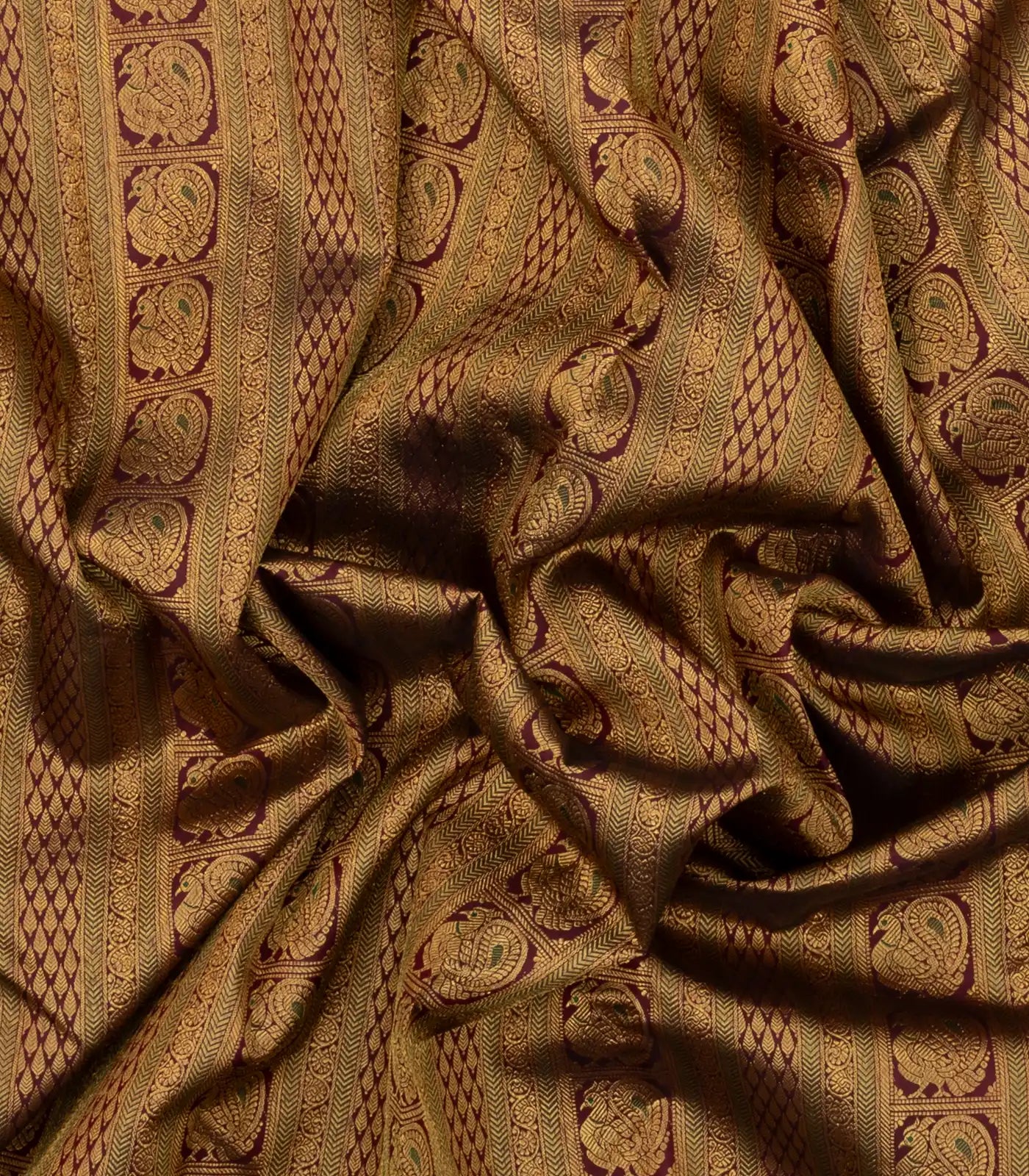 This handwoven kanchipuram silk saree is filled with meena annam motifs in dark maroon body along with zari border and pallu