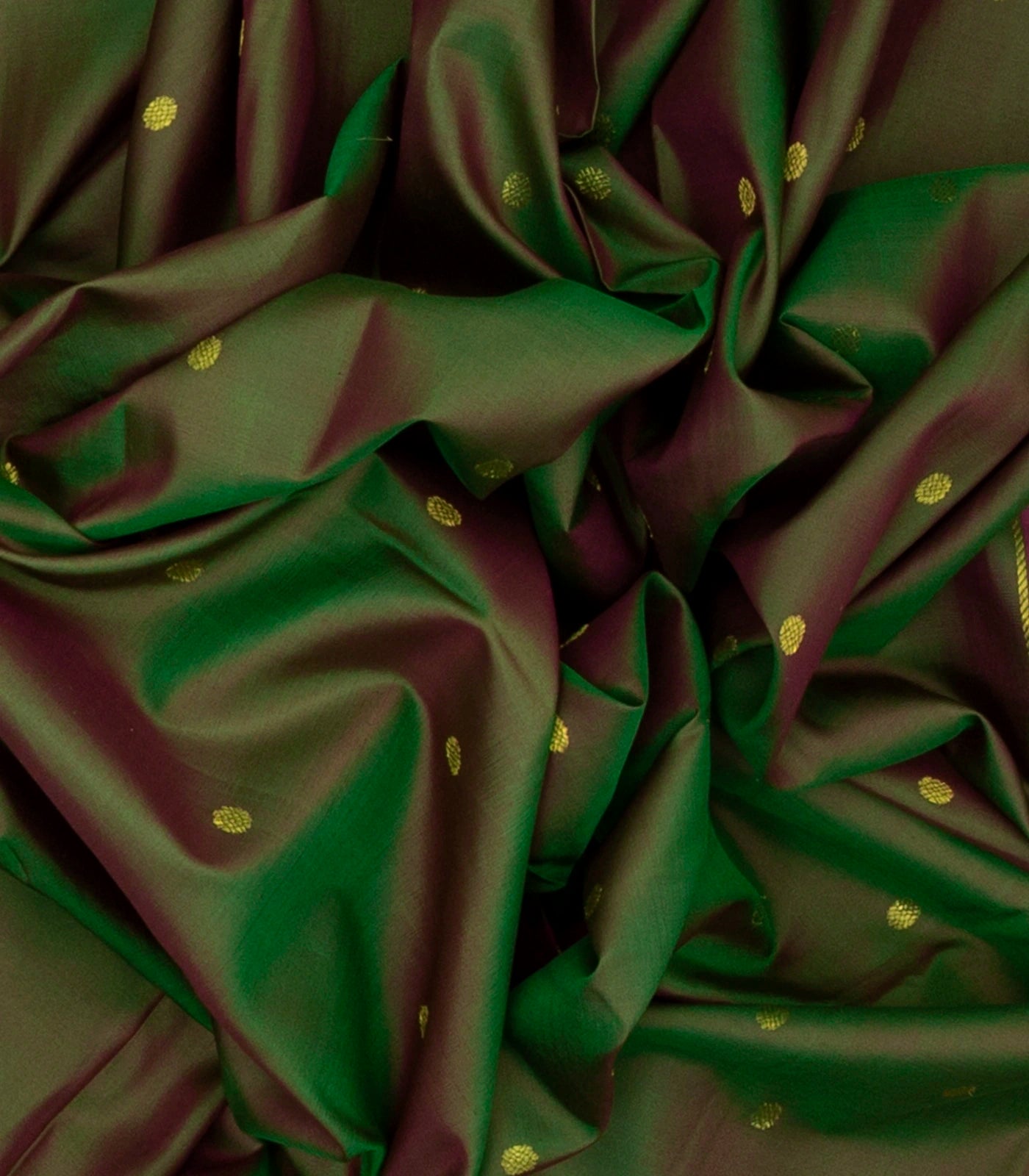 This handwoven kanchipuram silk saree is filled with chakaram buttas in dark olive body along with contrast border and pallu