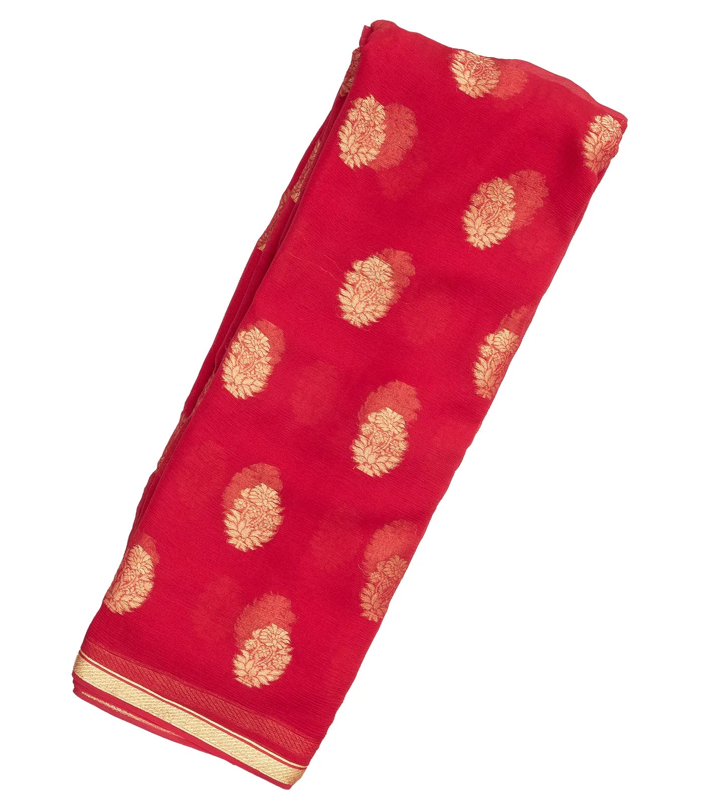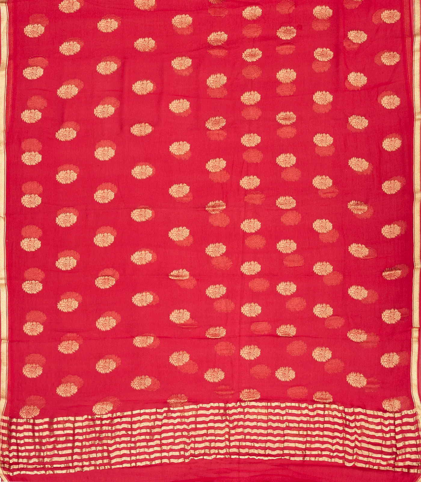 This woven mysore crepe silk saree is filled with floral zari buttas in dark peach body along with pallu