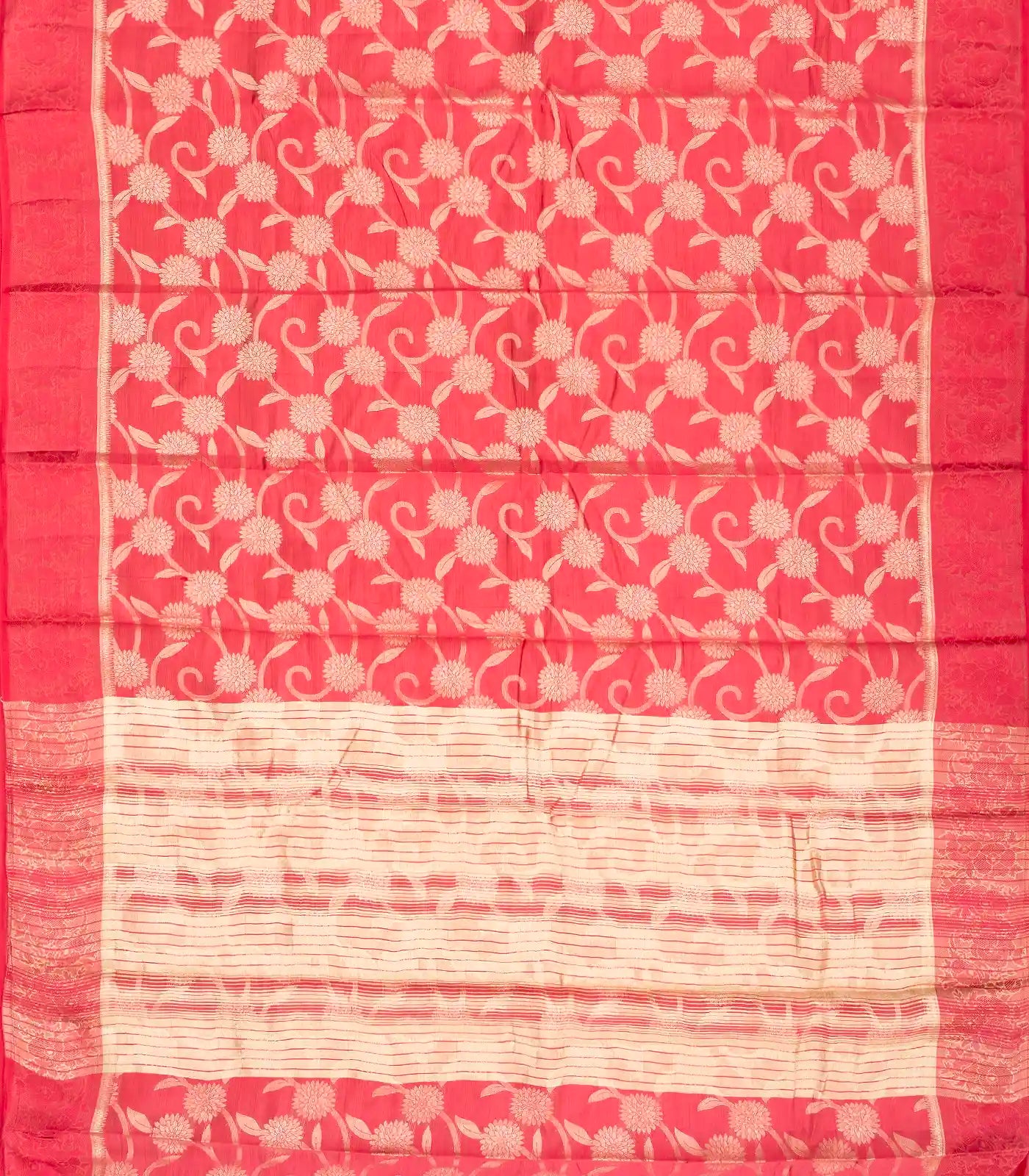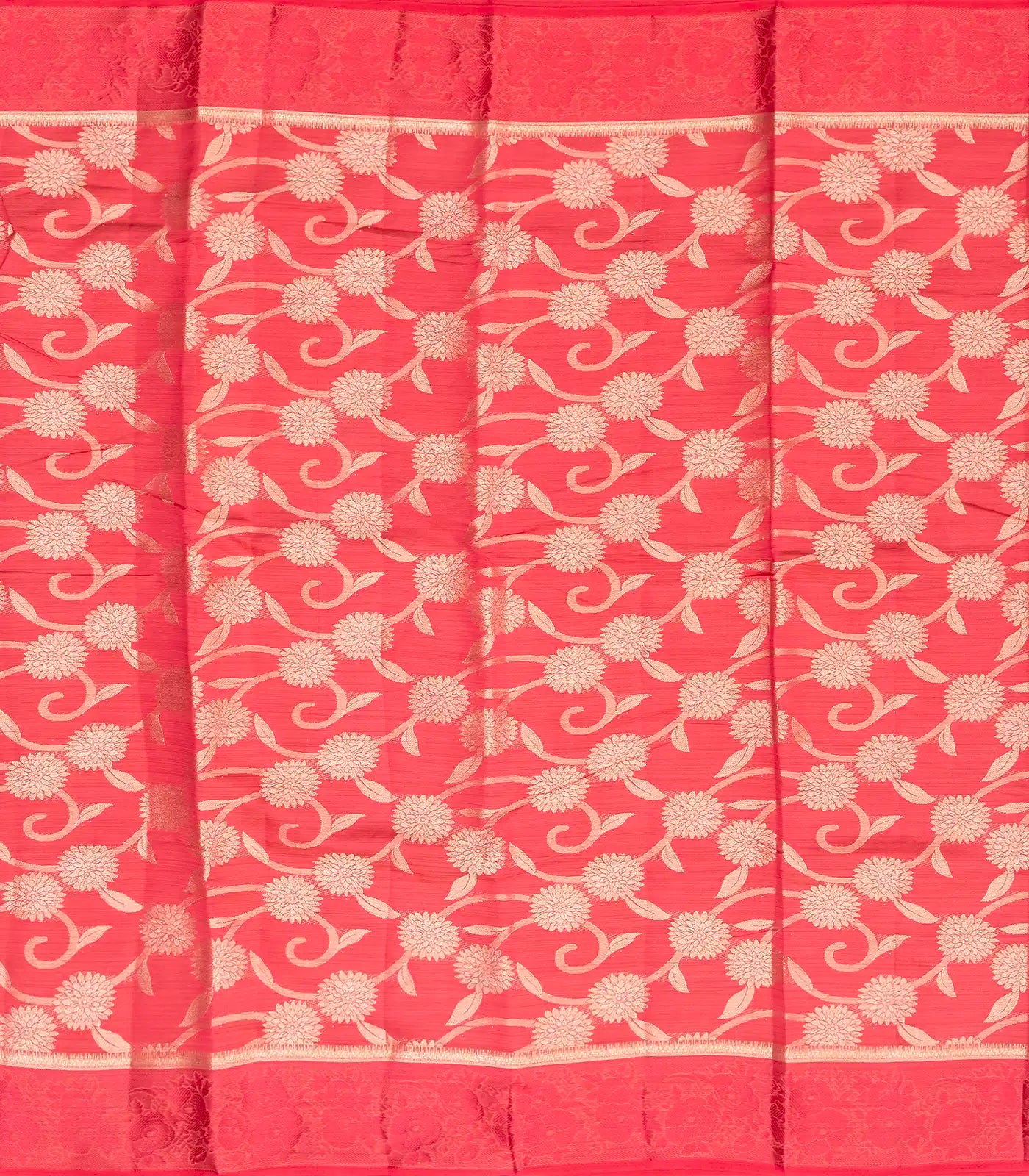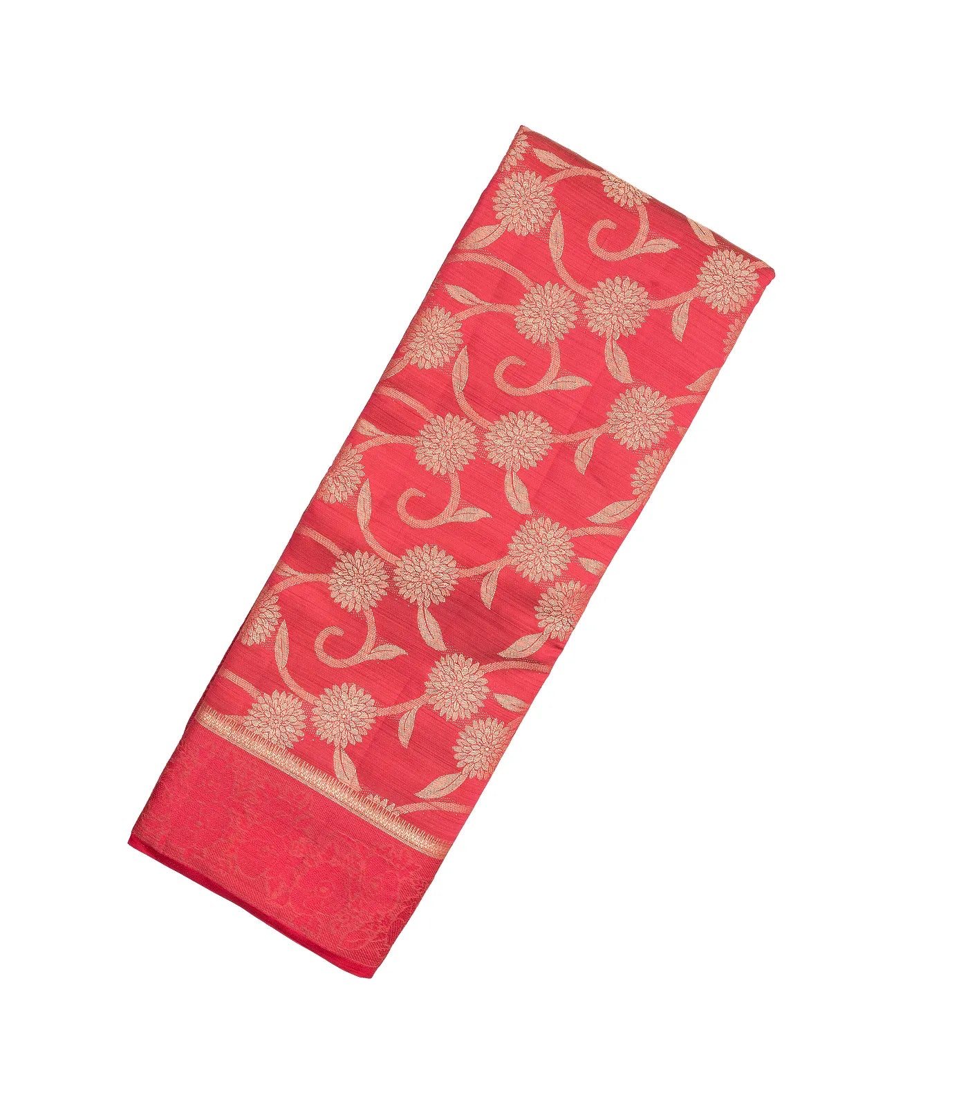 This woven synthetic tussar silk saree is filled with floral vine motifs in dark peach body along with border and pallu