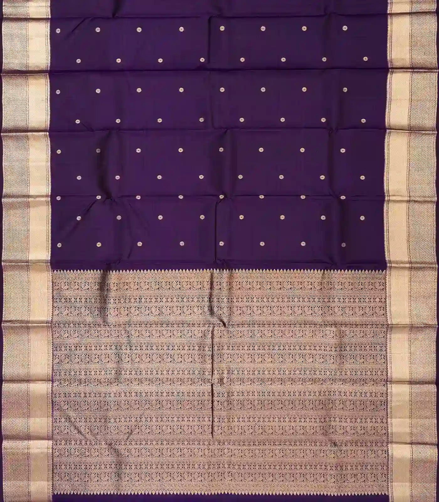 This handwoven kanchipuram silk saree is filled with floral buttas in dark purple body along with border and pallu