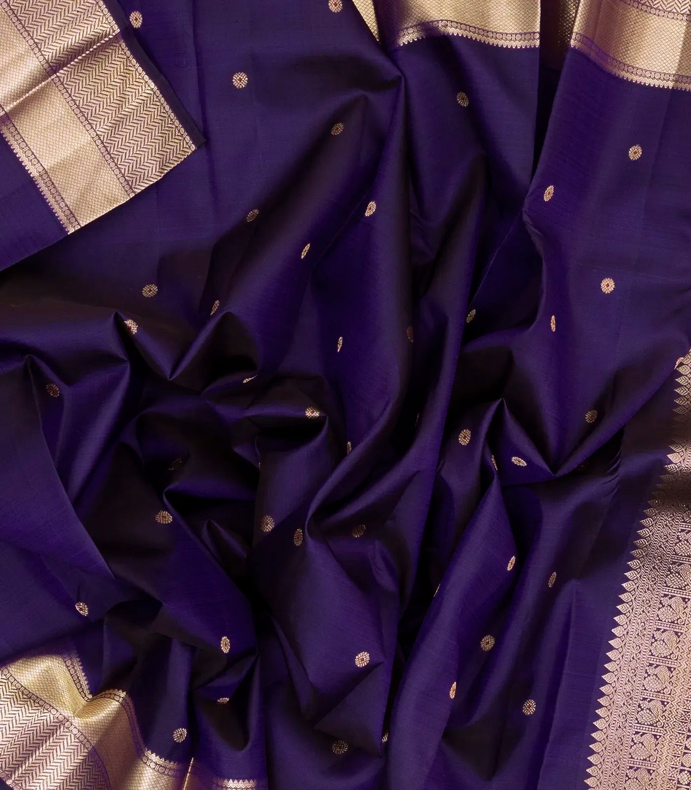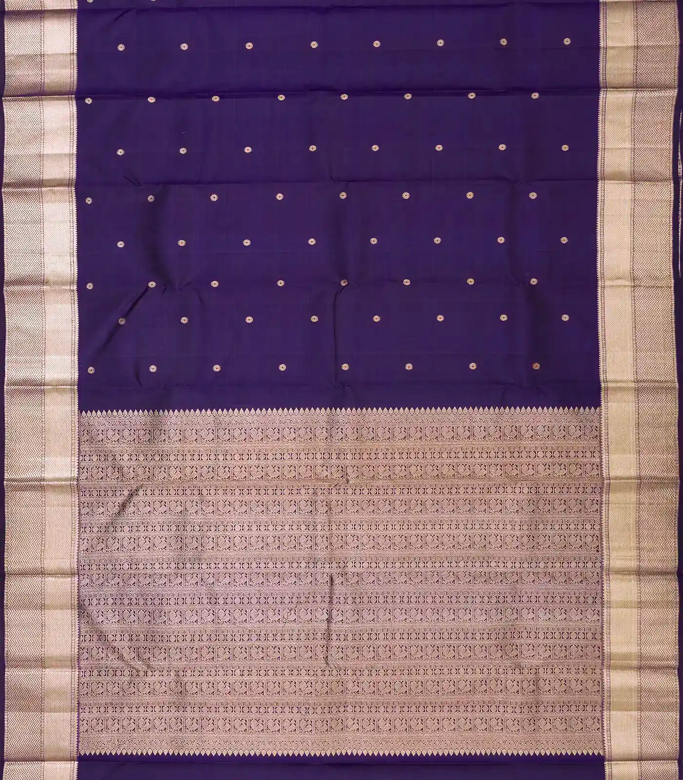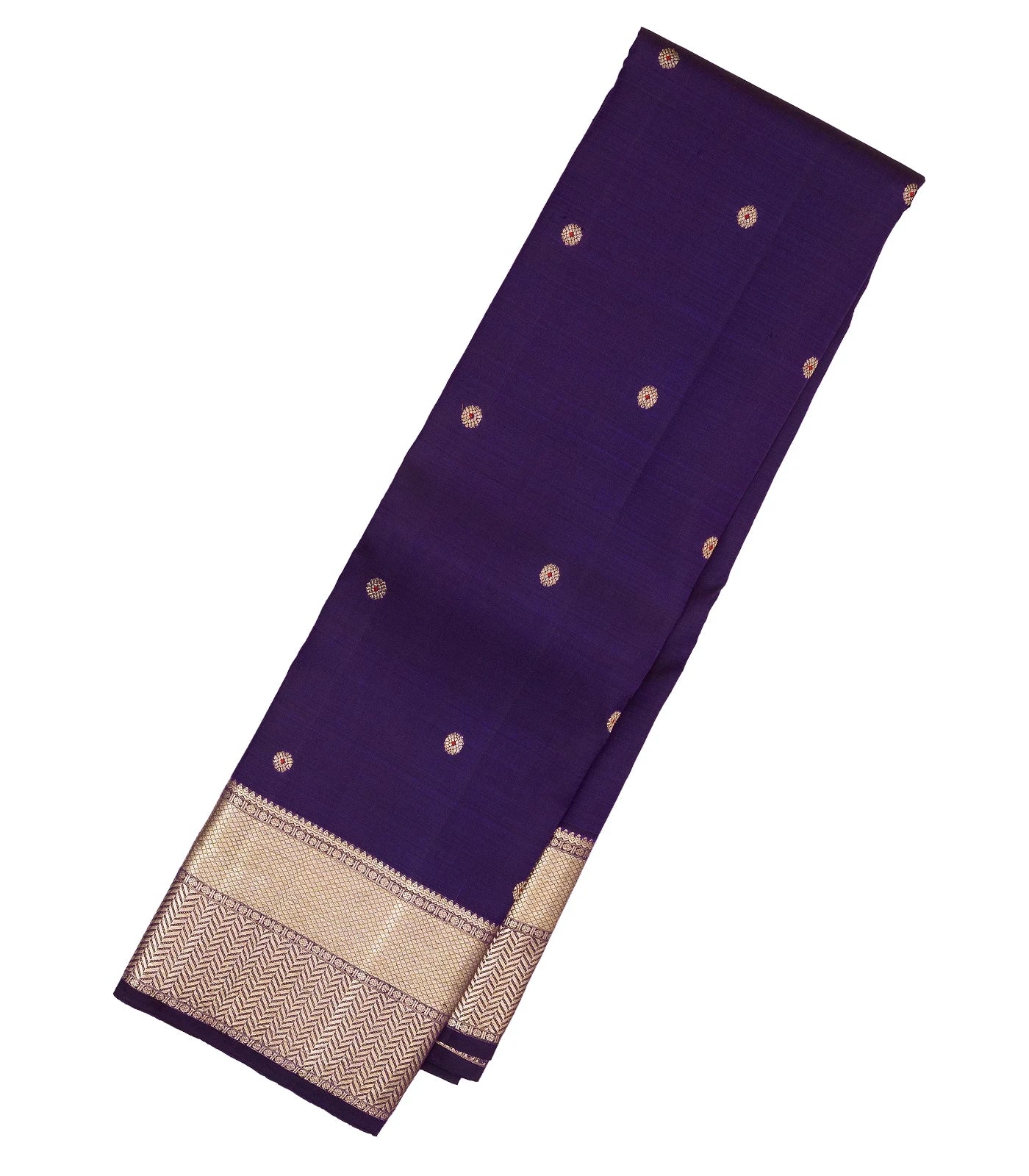 This handwoven kanchipuram silk saree is filled with meena buttas in dark purple body along with zari border and pallu