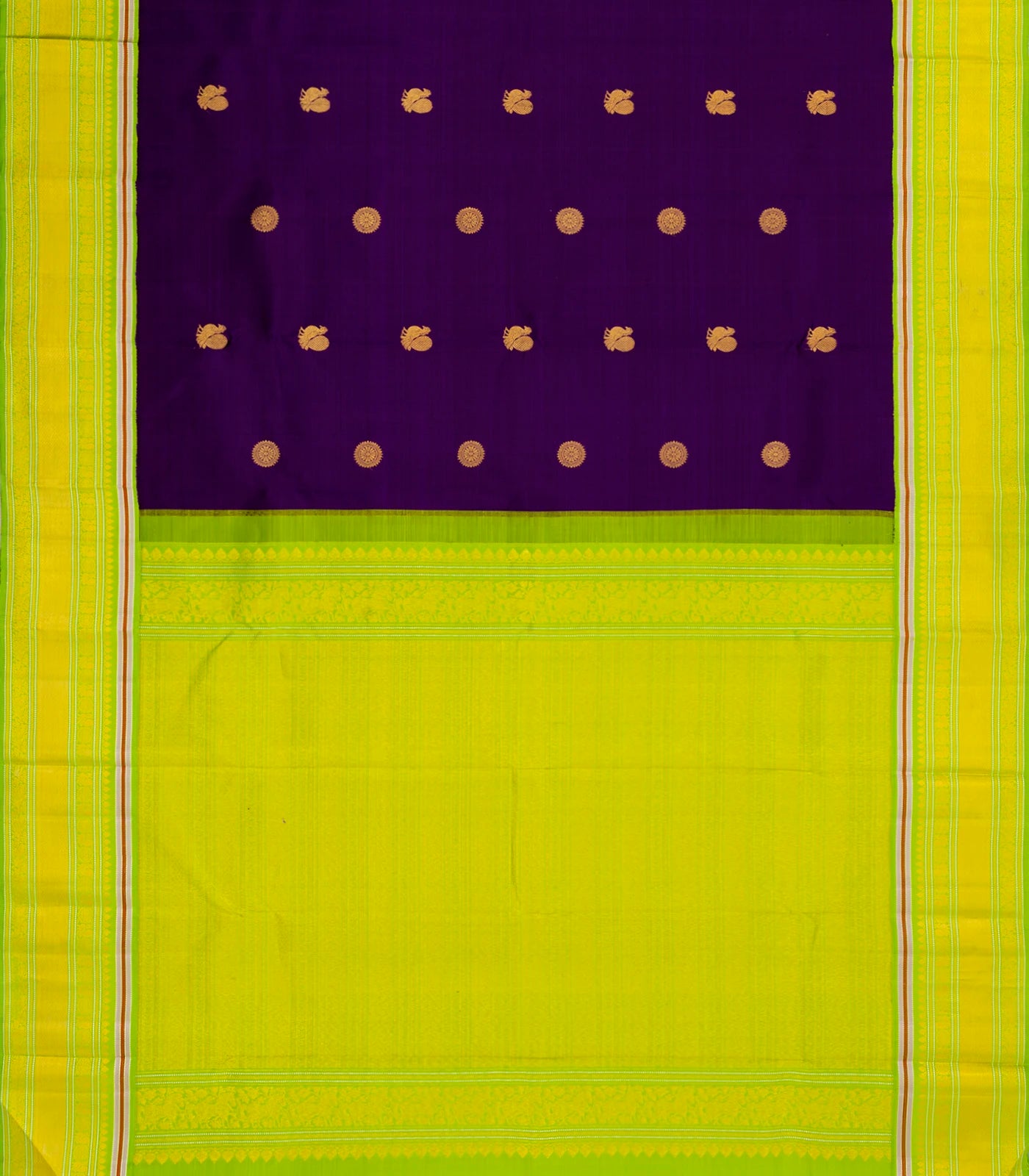This handwoven korvai kanchipuram silk saree is filled with annam buttas in dark purple body along with contrast border and pallu