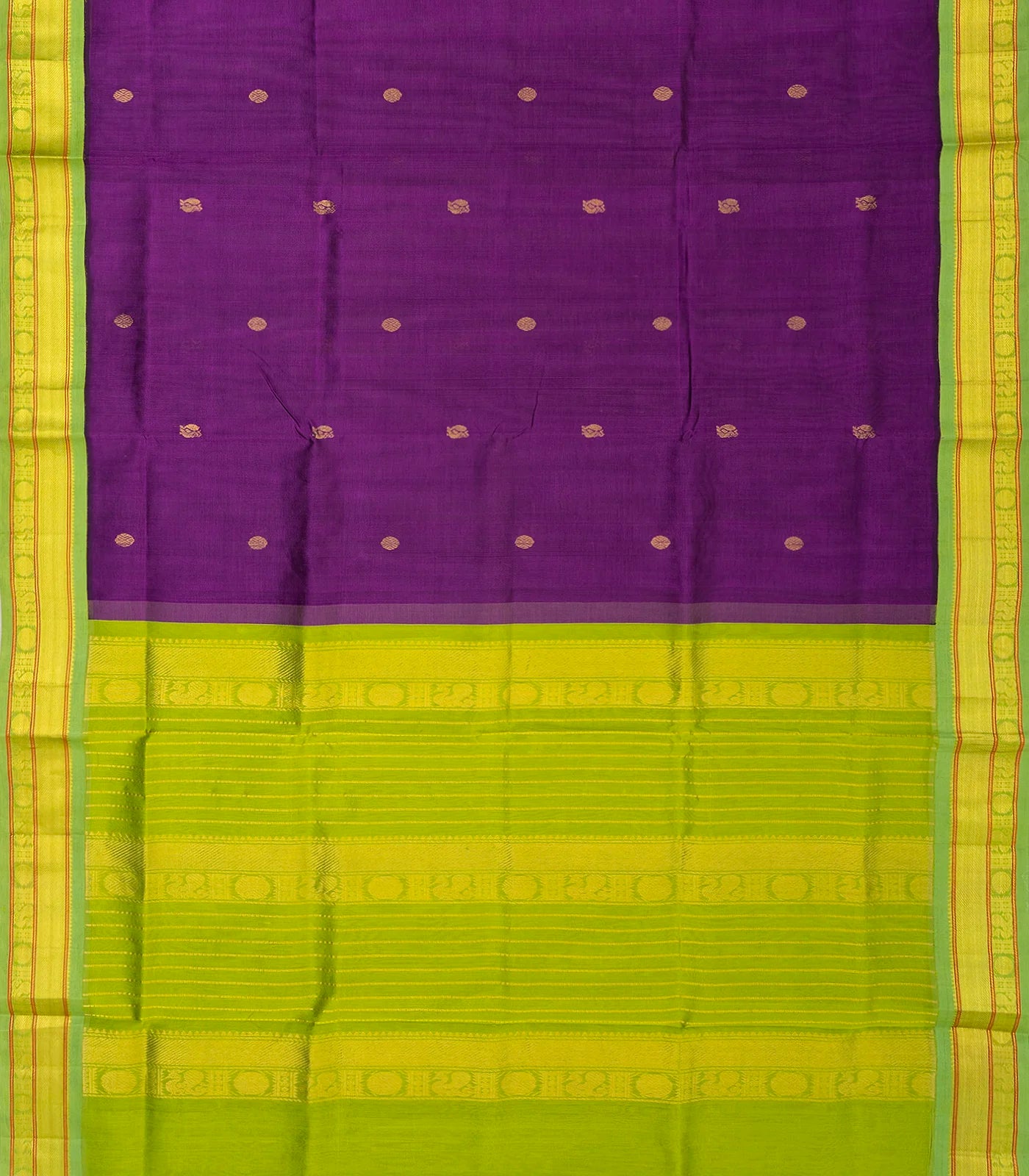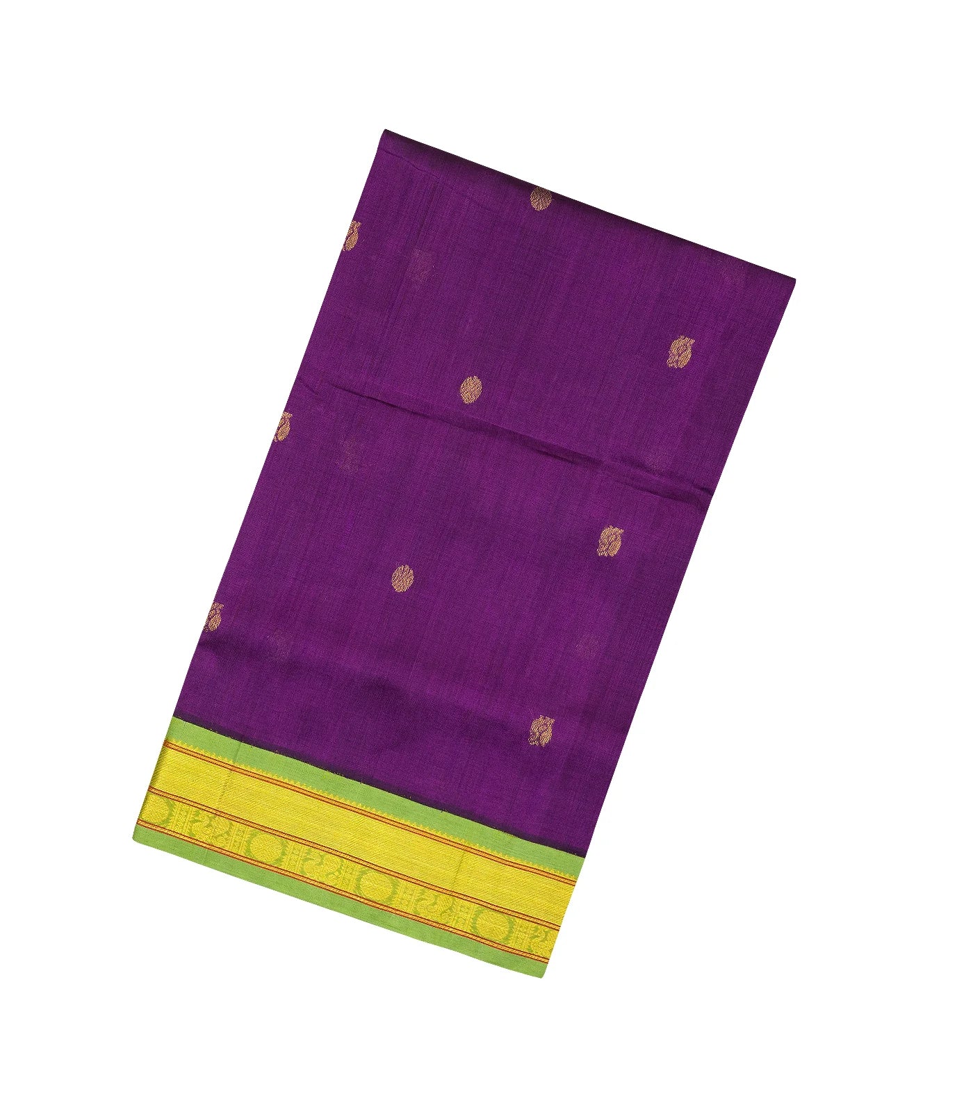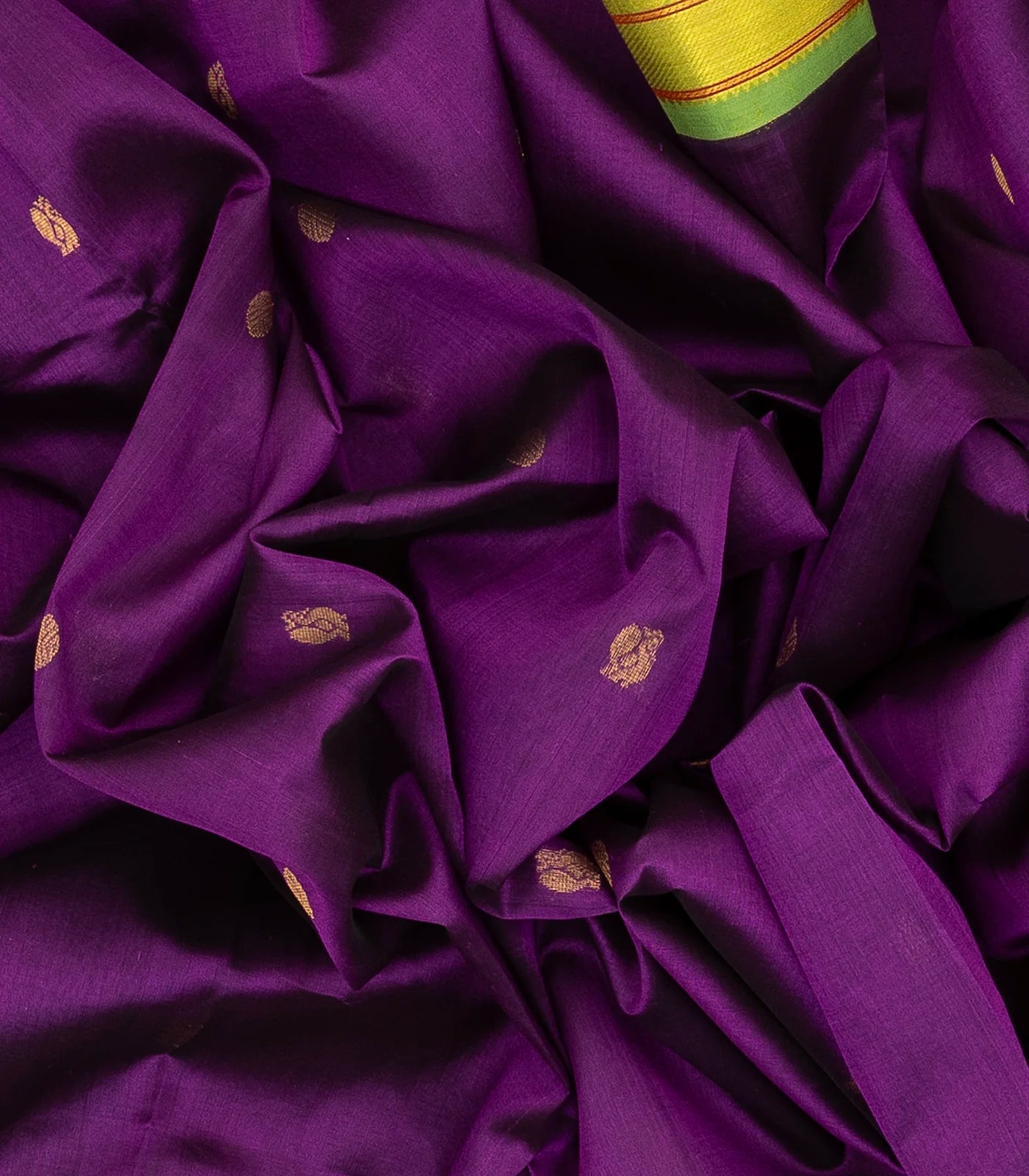 This handwoven korvai silk cotton saree is filled with buttas in dark purple body along with contrast zari border and pallu
