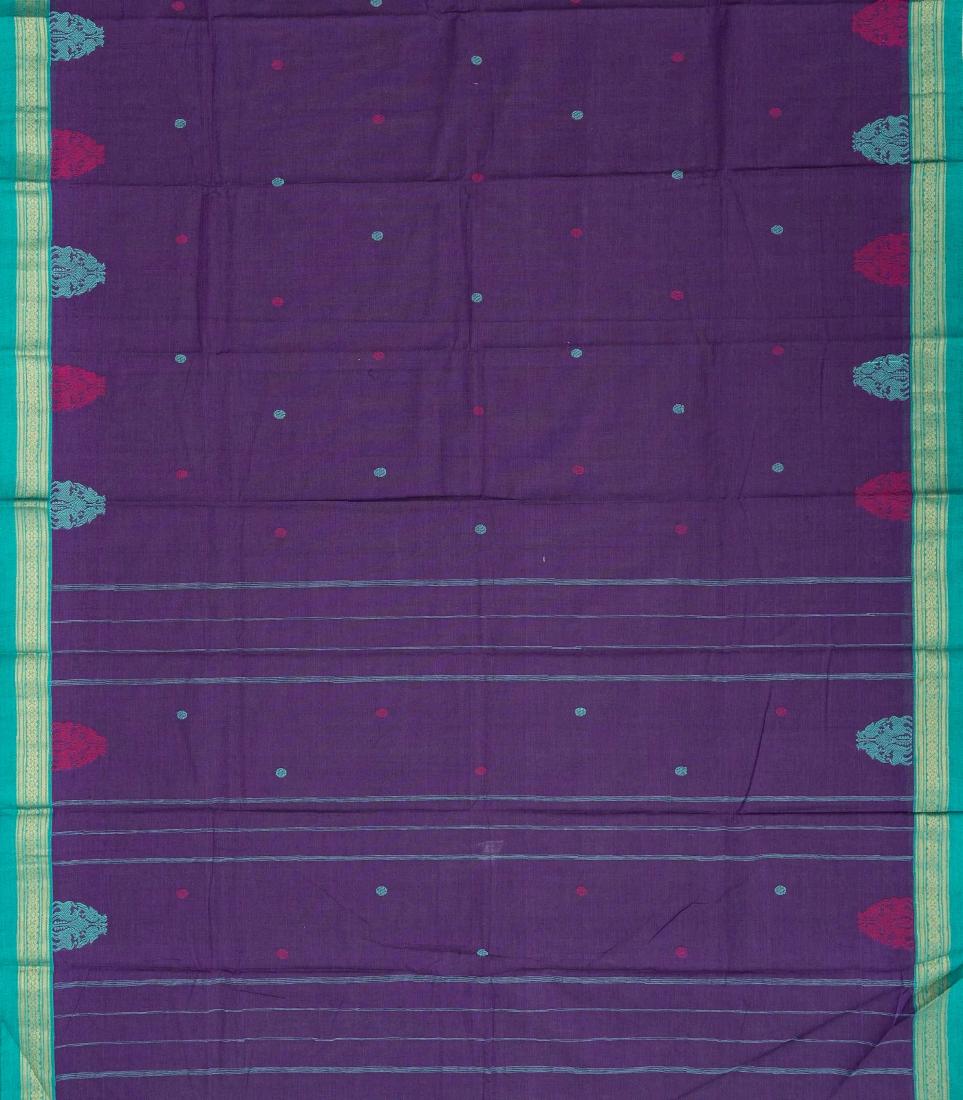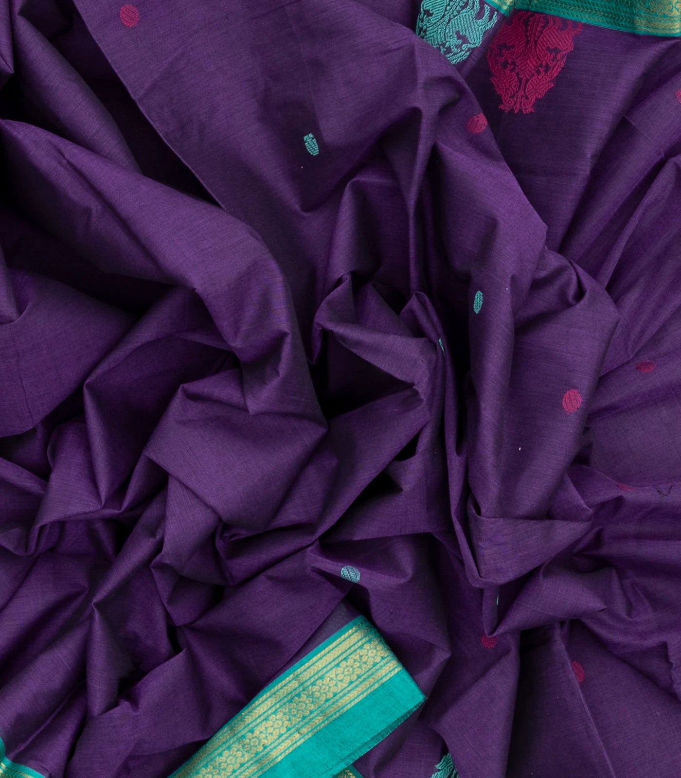 This woven chettinad cotton saree is filled with buttas in dark purple body along with contrast border and pallu