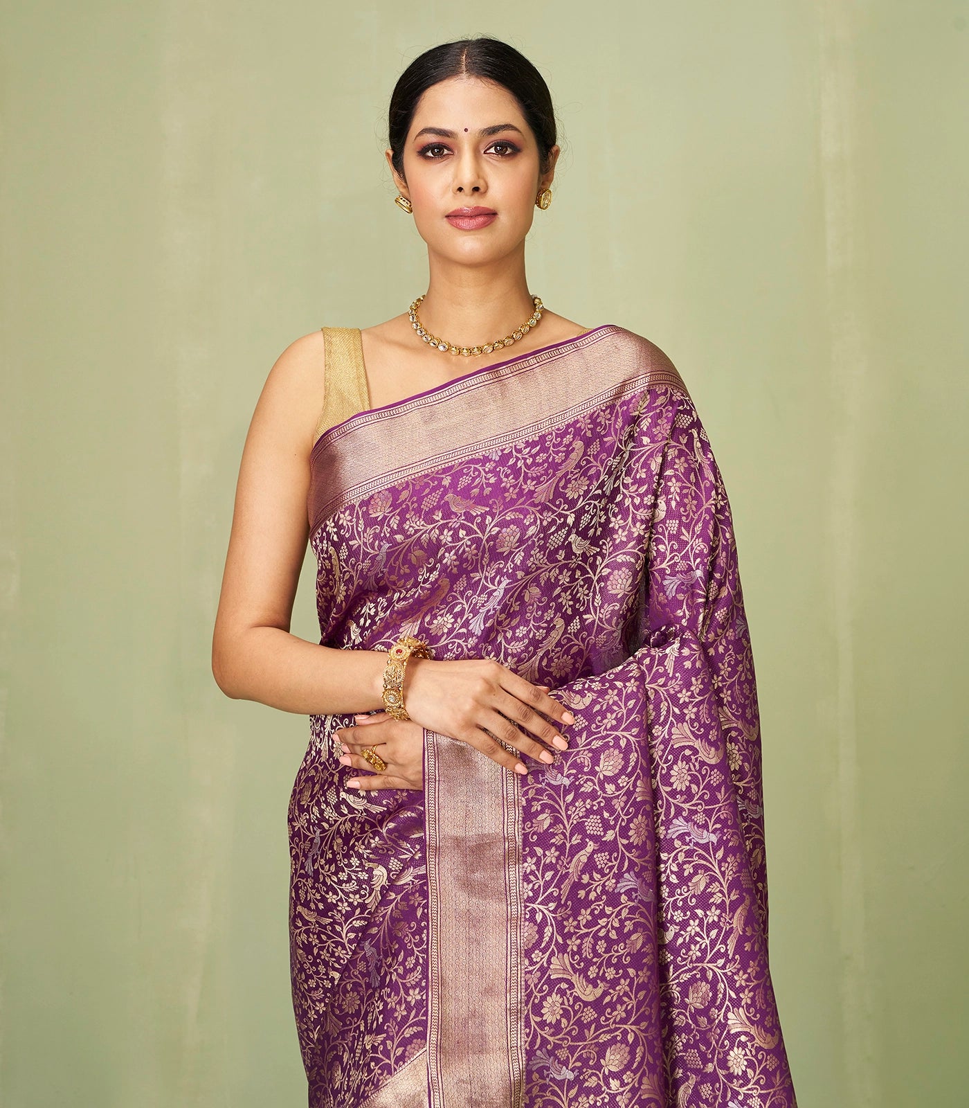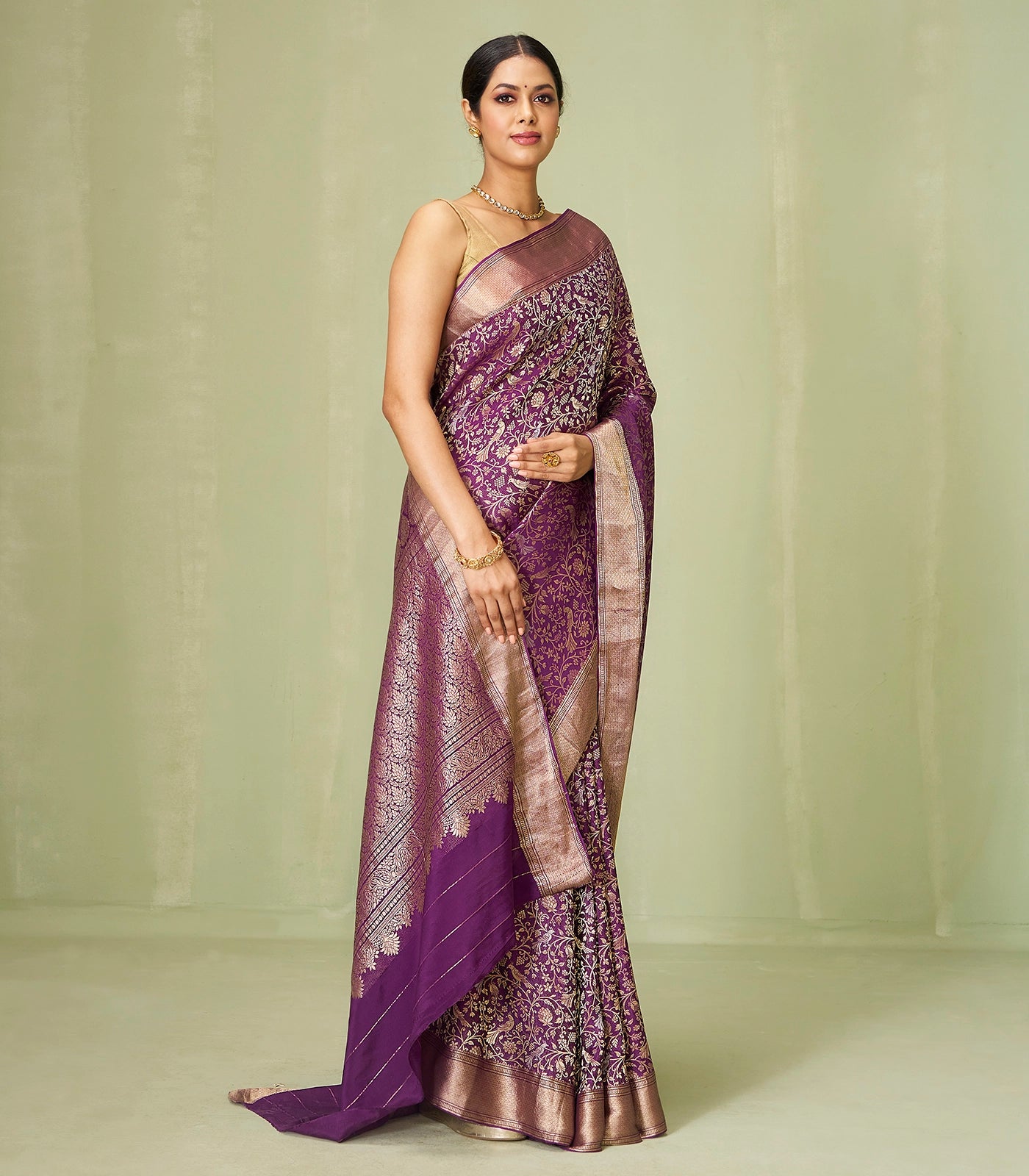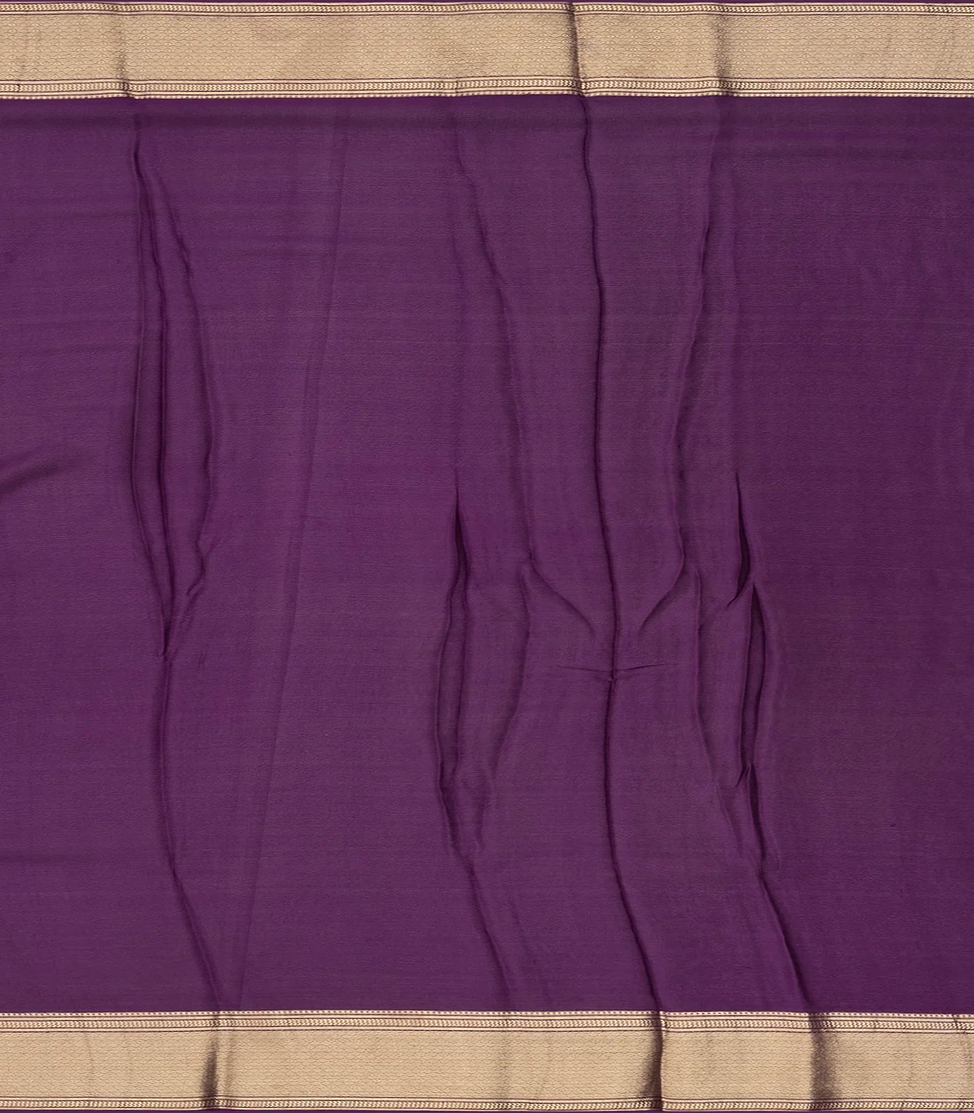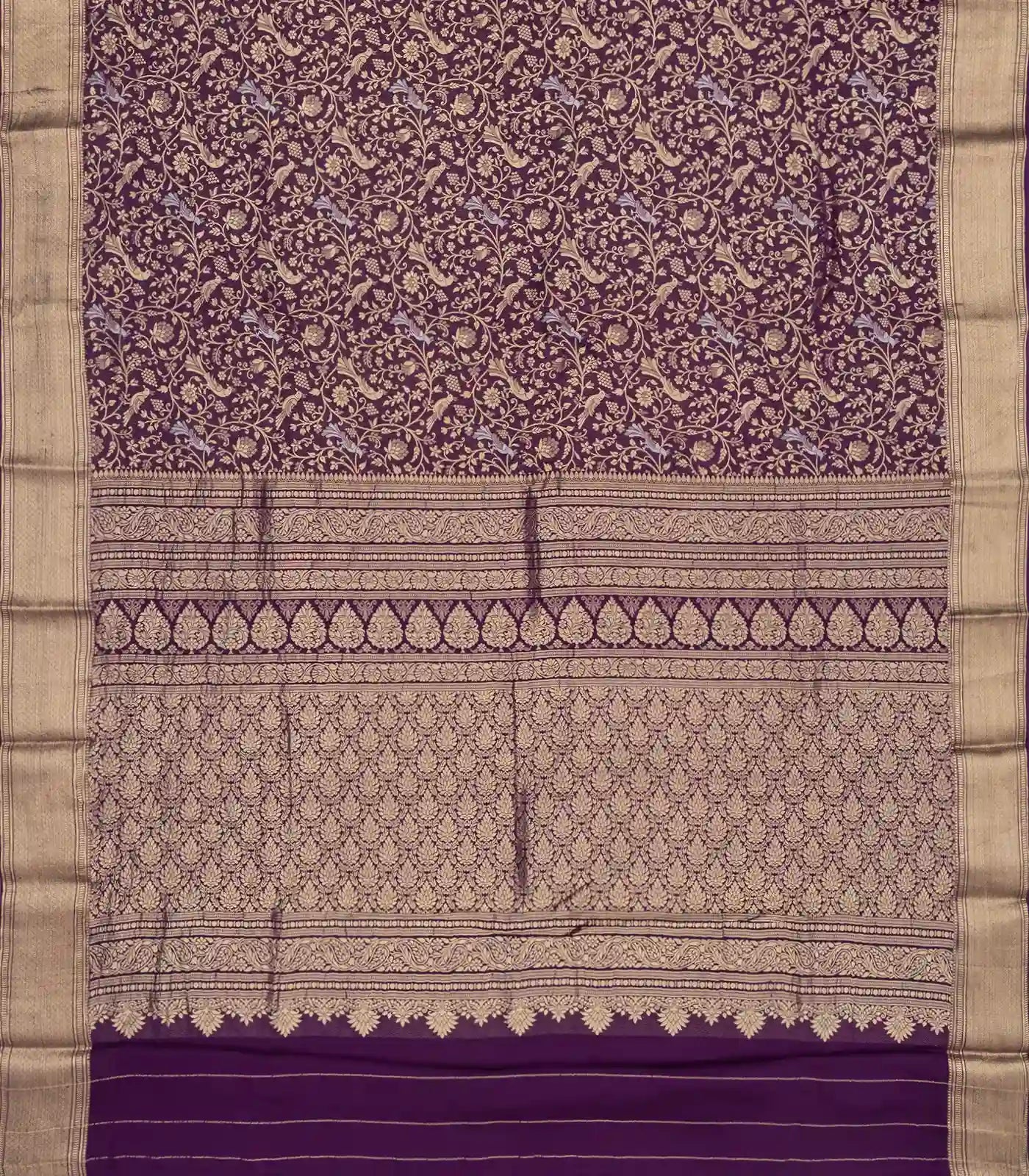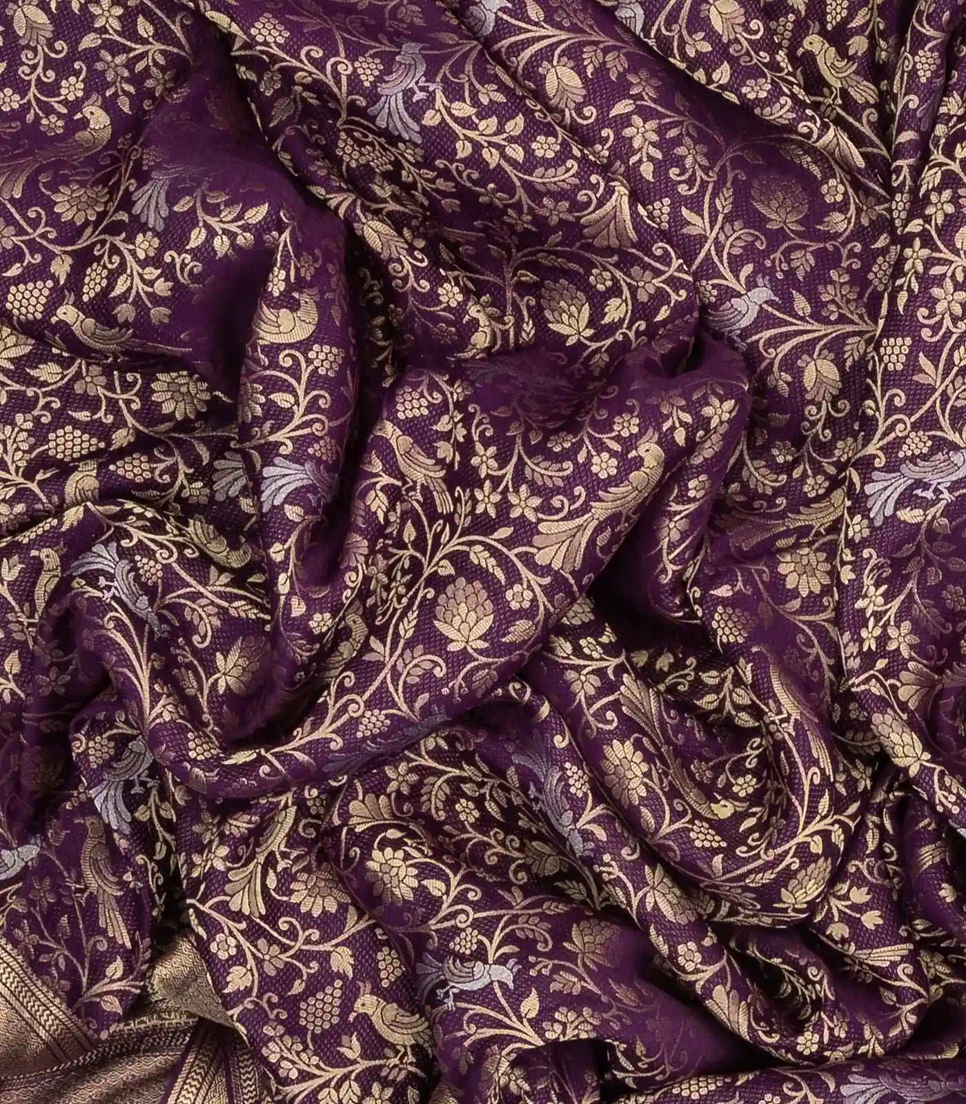 This woven mysore crepe silk saree is filled with peacock motifs in dark purple body along with border and pallu