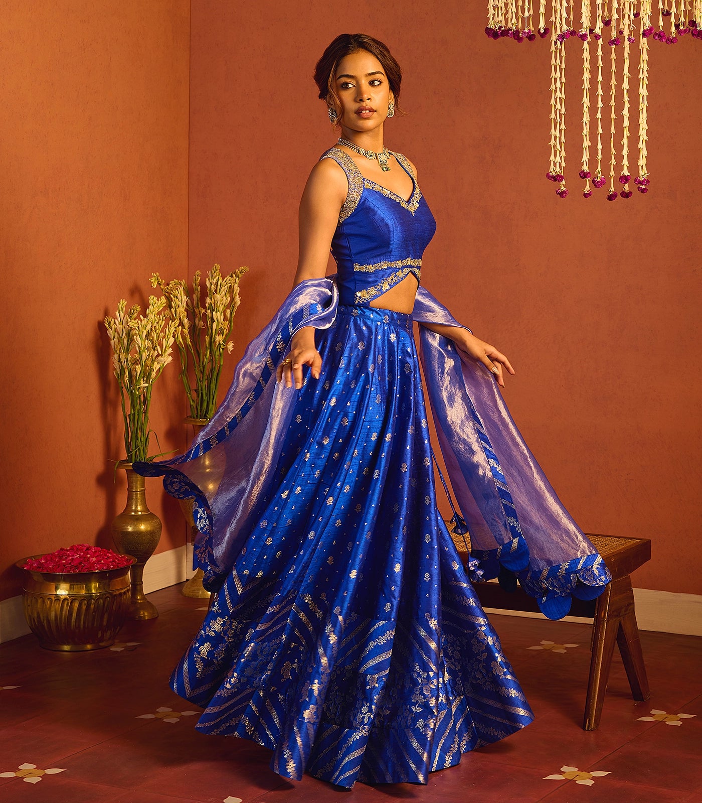 A tapestry of tradition and artistry, this royal blue pure raw silk Banarasi lehenga showcases fine weaving and intricate craftsmanship. The 12-panelled skirt features gold zari butta motifs, flowing into three ornate borders of diagonal stripes and floral jaal patterns that add rhythm and grandeur. Paired with a hand-embroidered blouse, adorned with silver and gold zardozi, sequins, and beads on the shoulder, neckline, and waist, and finished with a sculpted V-cut hemline for definition. The look is completed with a silver tissue dupatta, adding a graceful, luminous touch. A portrait of regal elegance. Woven in silk, detailed by hand, and made to be remembered. Blouse and Skirt Fabric: Pure Banarasi Raw silk fabric Dupatta : Silver tissue organza Wash care : Dry clean only.
