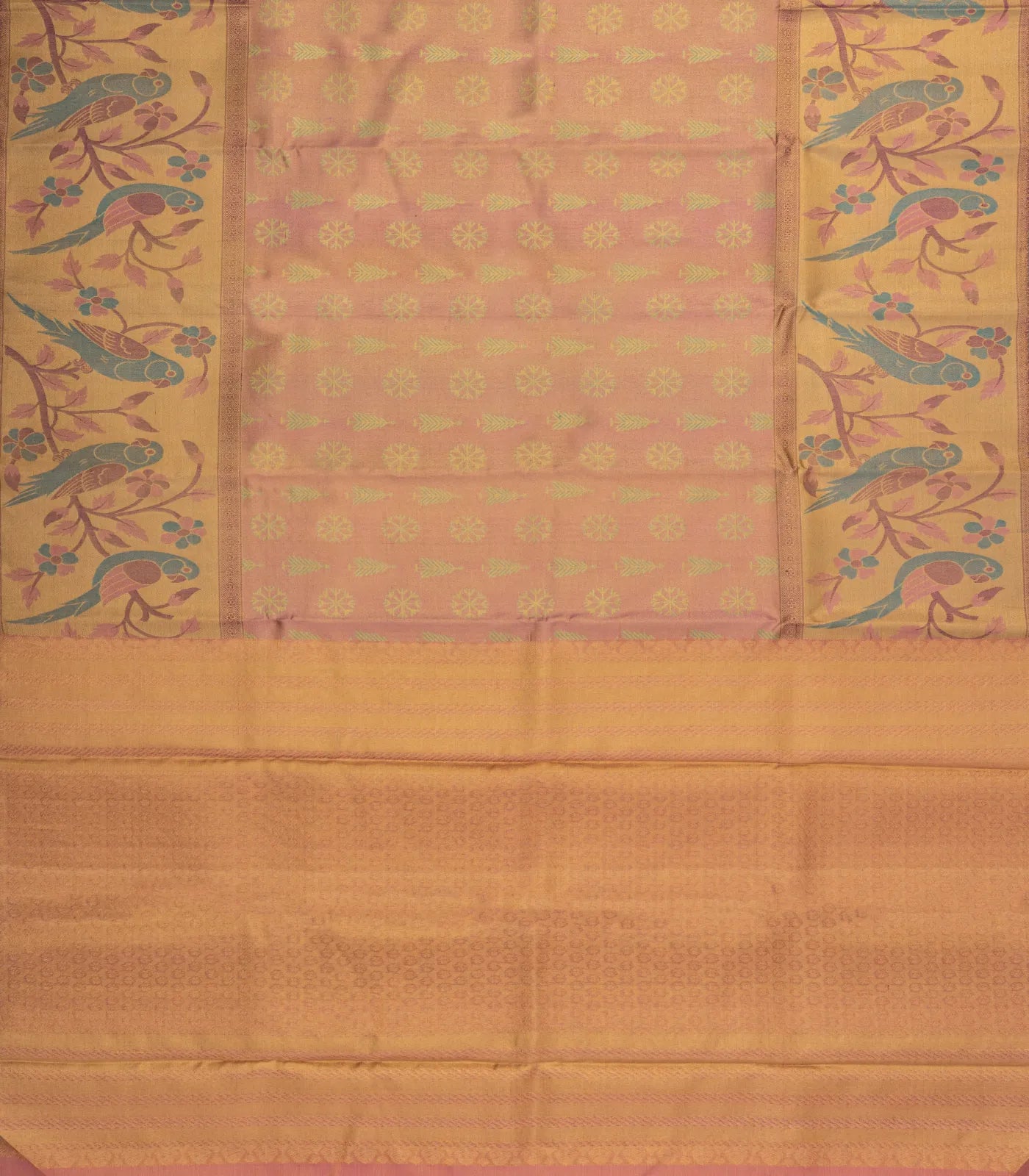 Dusty Peach Handloom Kanchipuram Silk Saree With Meena Parrot Motifs - KA14648