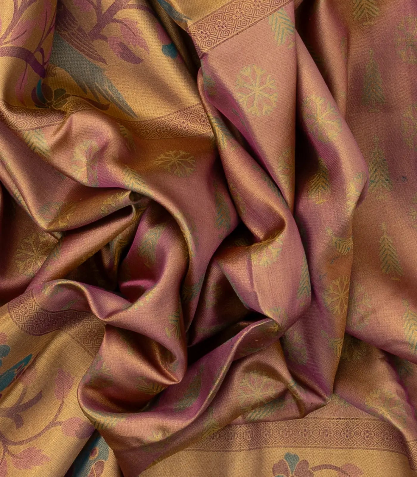 This handwoven kanchipuram silk saree is filled with frozen motifs in dusty peach body along with border and pallu