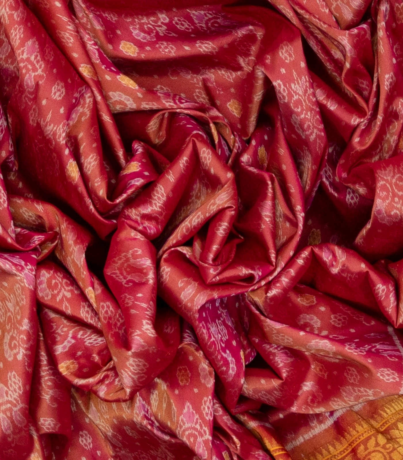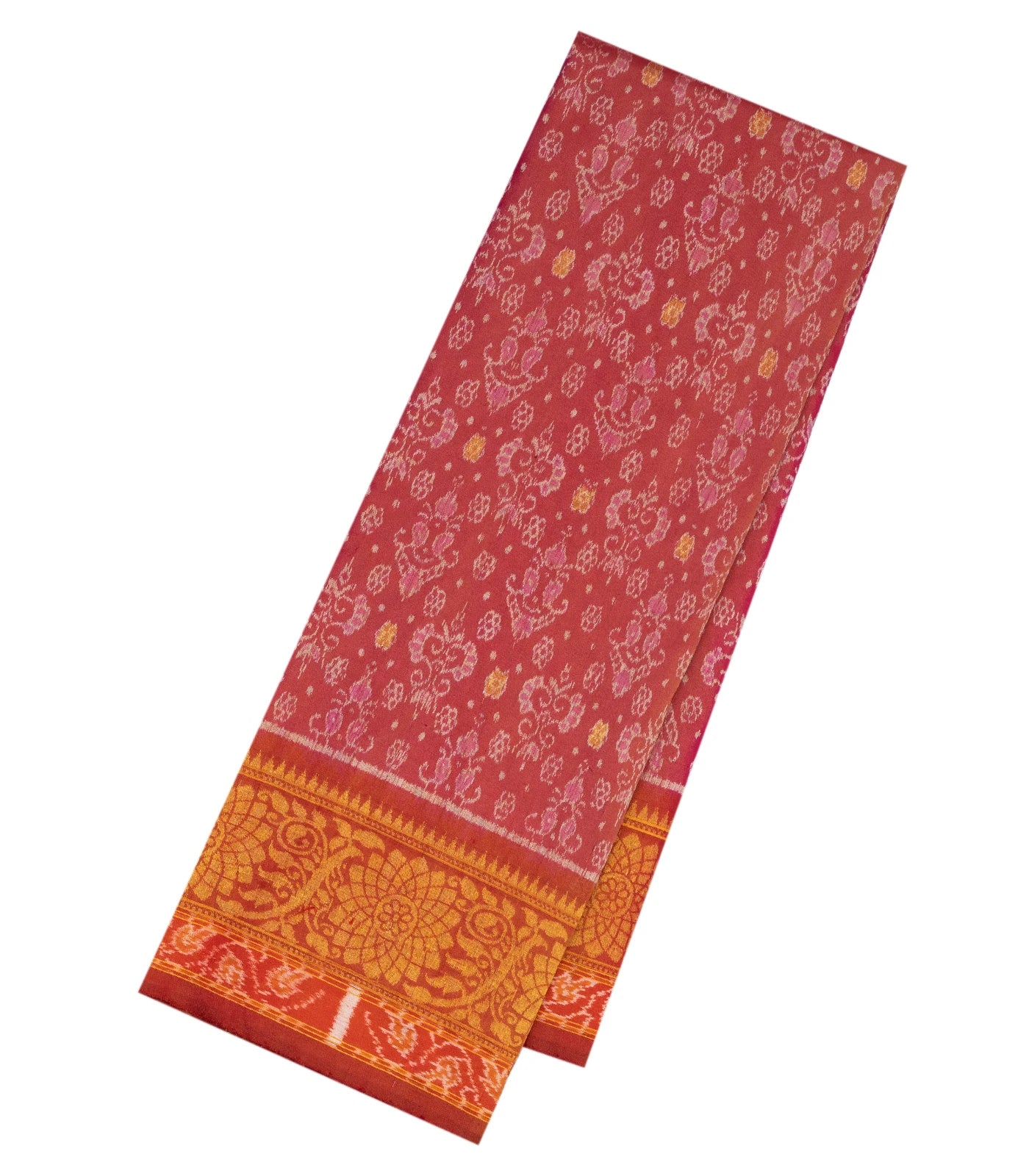 This handwoven Orissa silk saree is filled with tie & dye floral motifs in dusty pink body along with contrast floral zari motifs in border and pallu