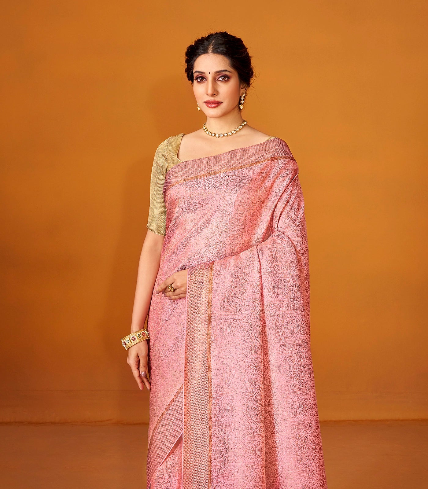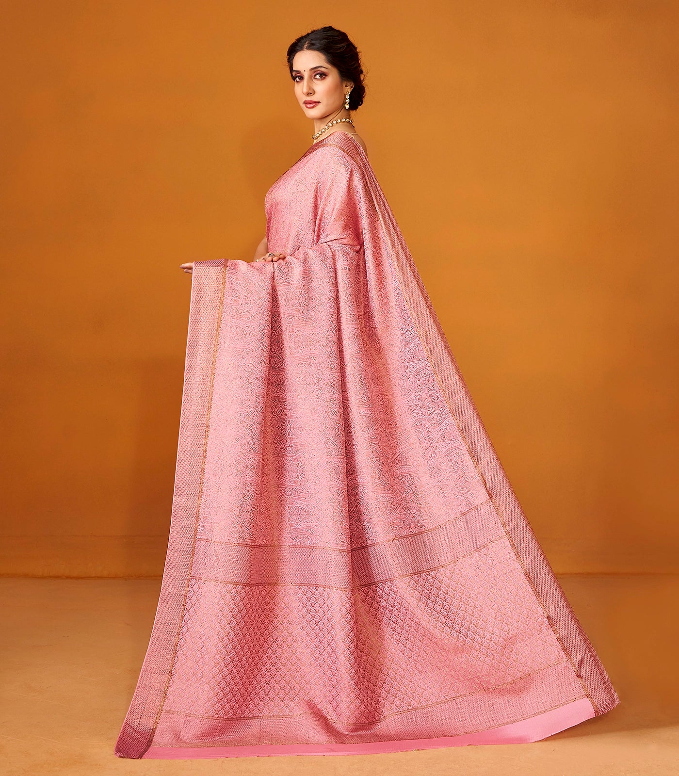 This woven mysore crepe silk saree is filled with floral motifs in dusty pink body along with border and pallu
