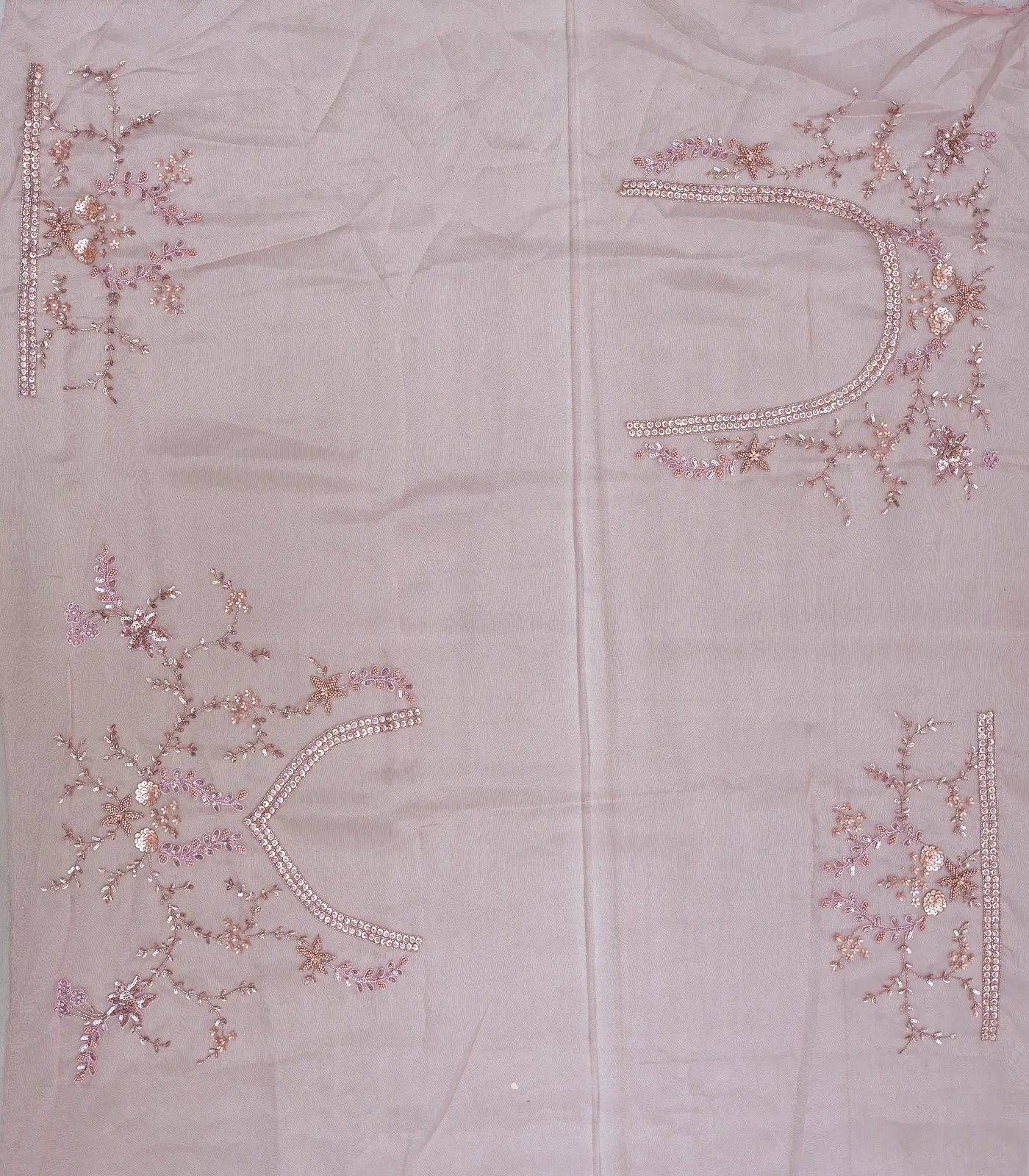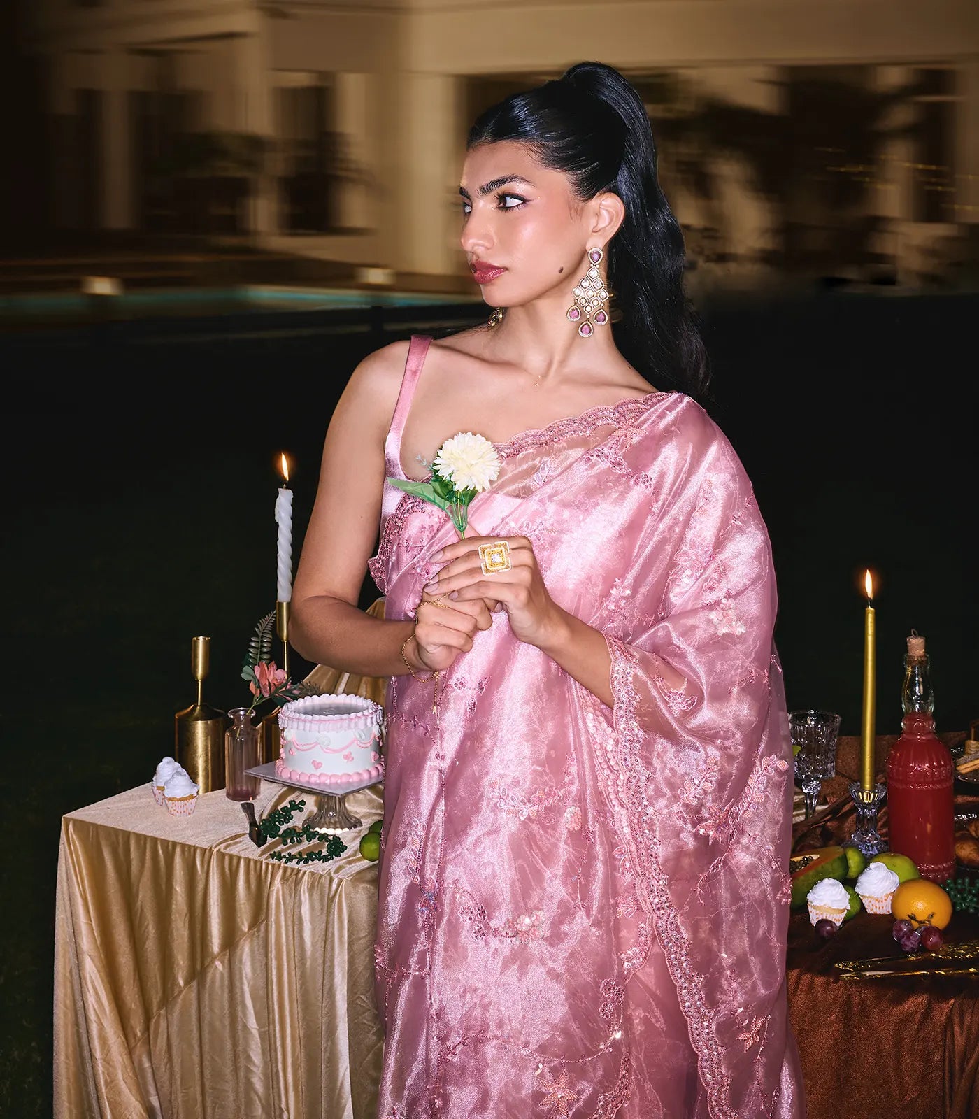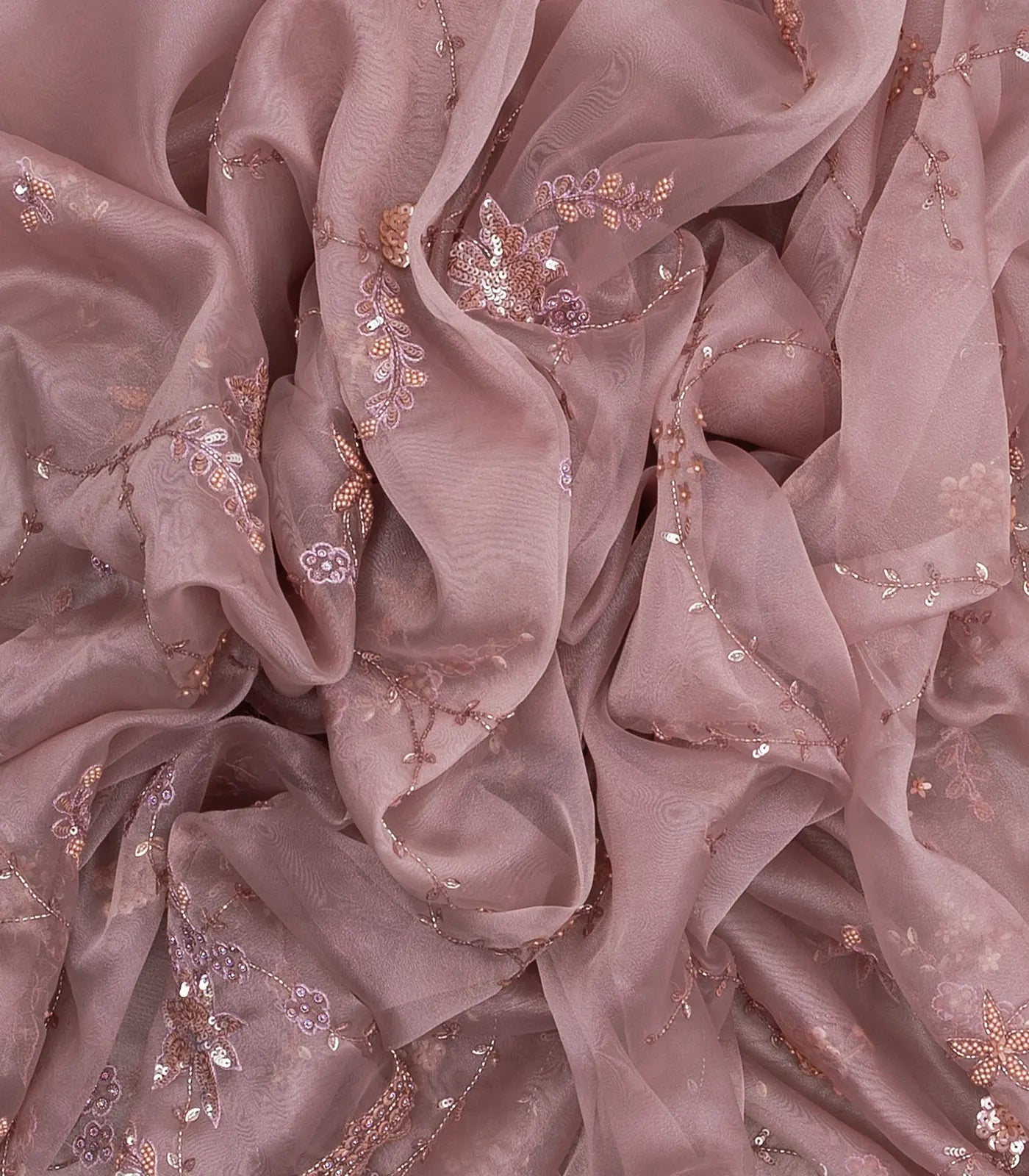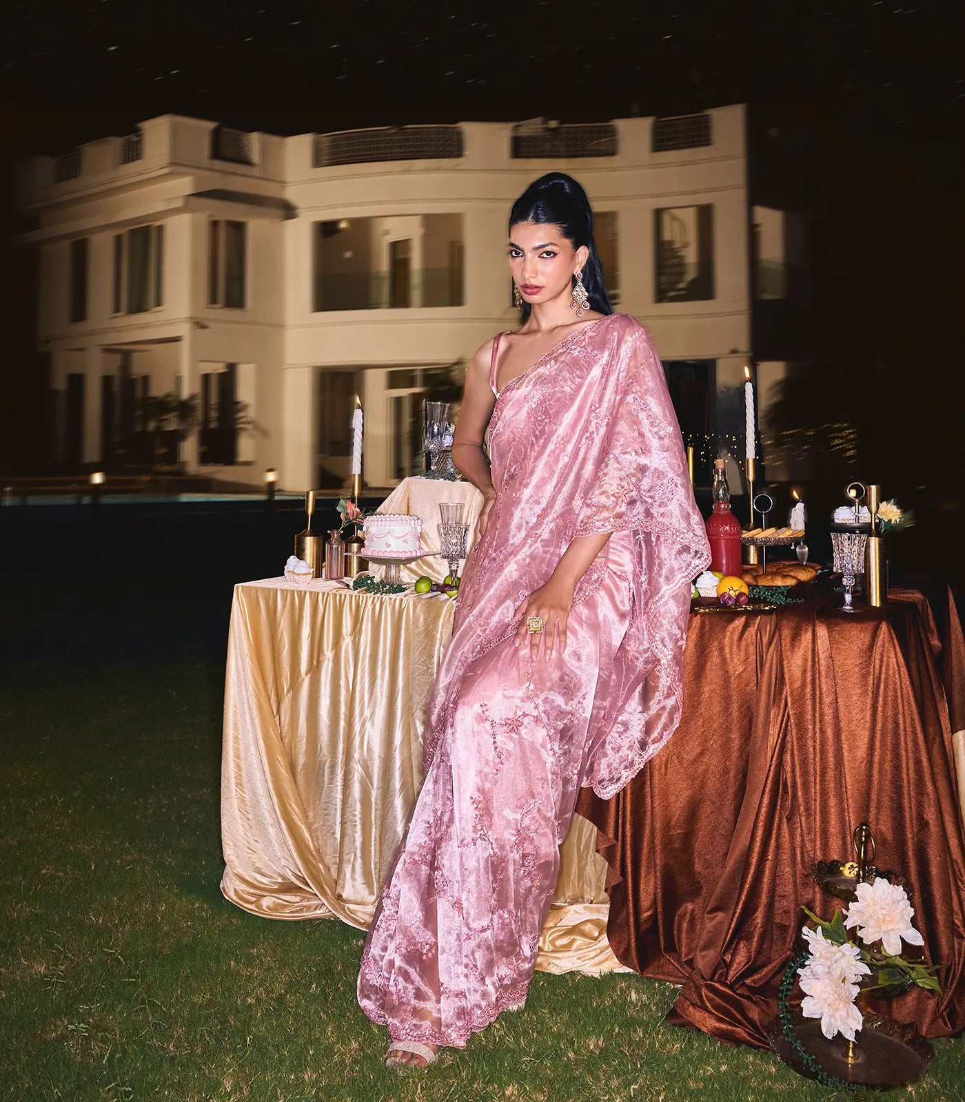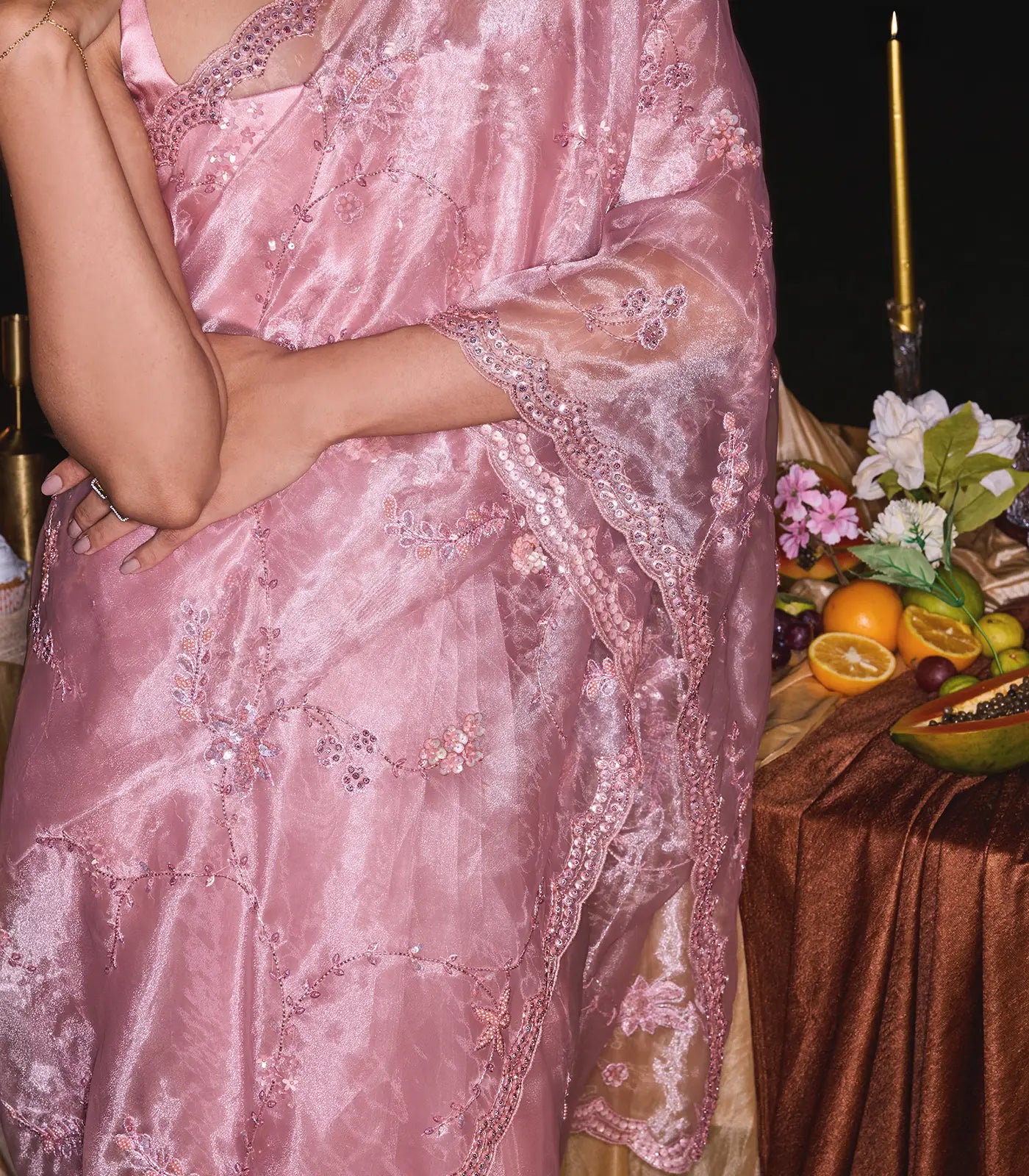 This woven organza saree is filled with embroidered floral motifs in dusty pink body along with border and pallu