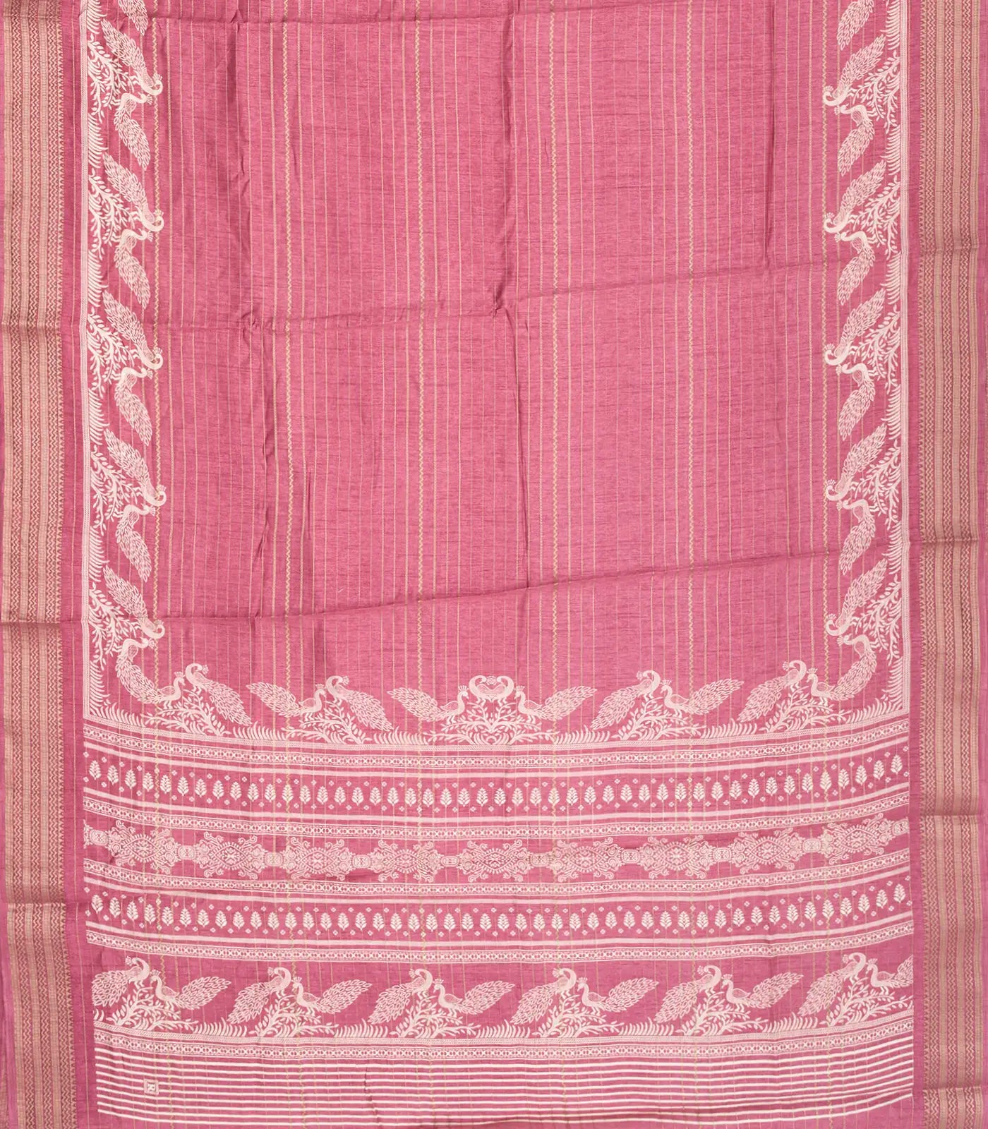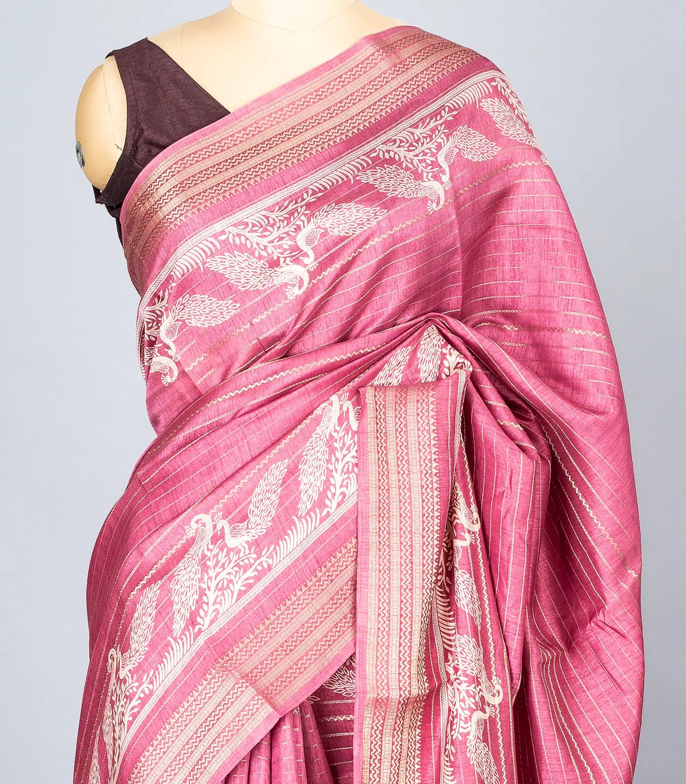 This woven synthetic dola saree is filled with stripes & printed bird motifs in dusty pink body along with border and pallu