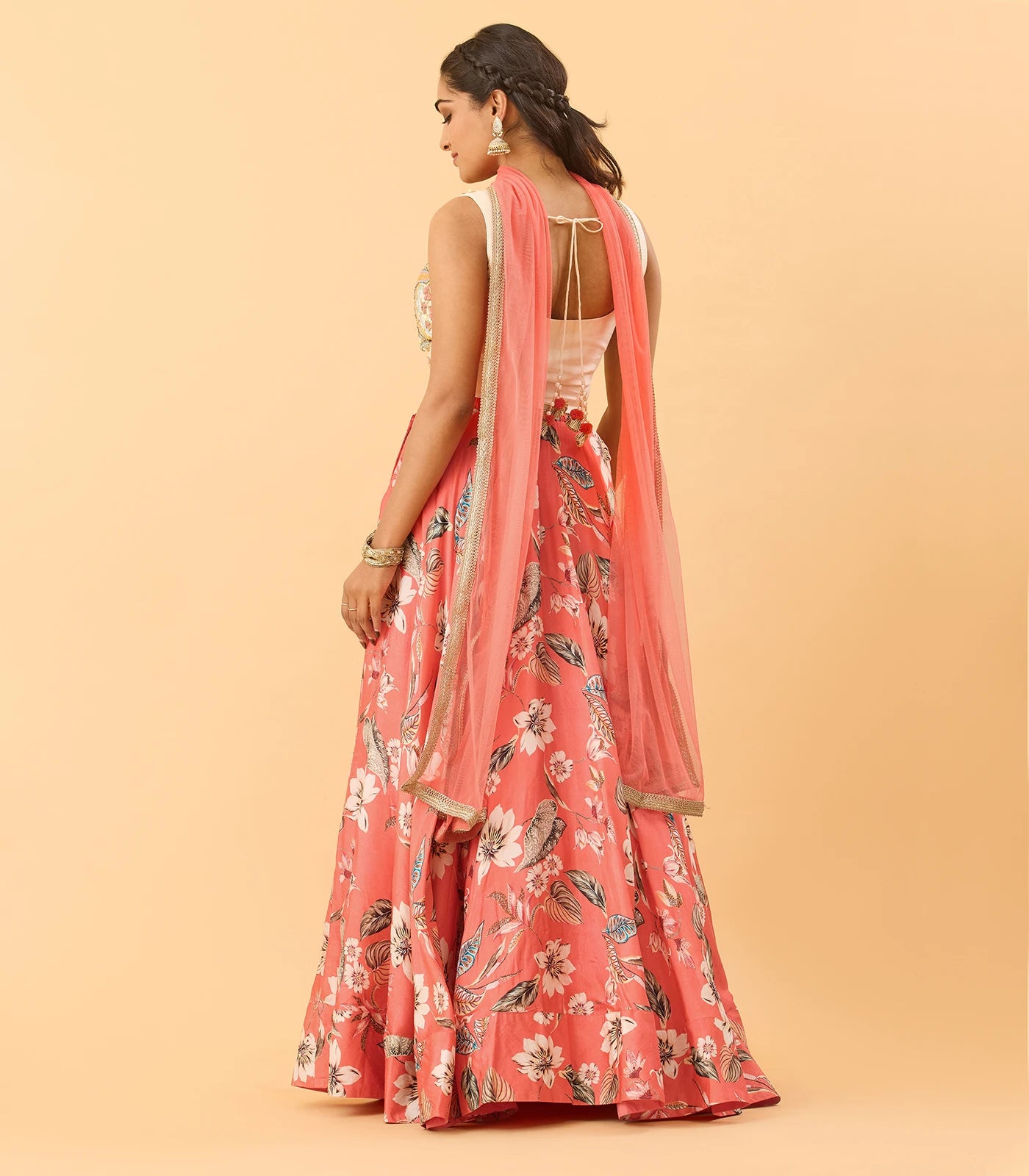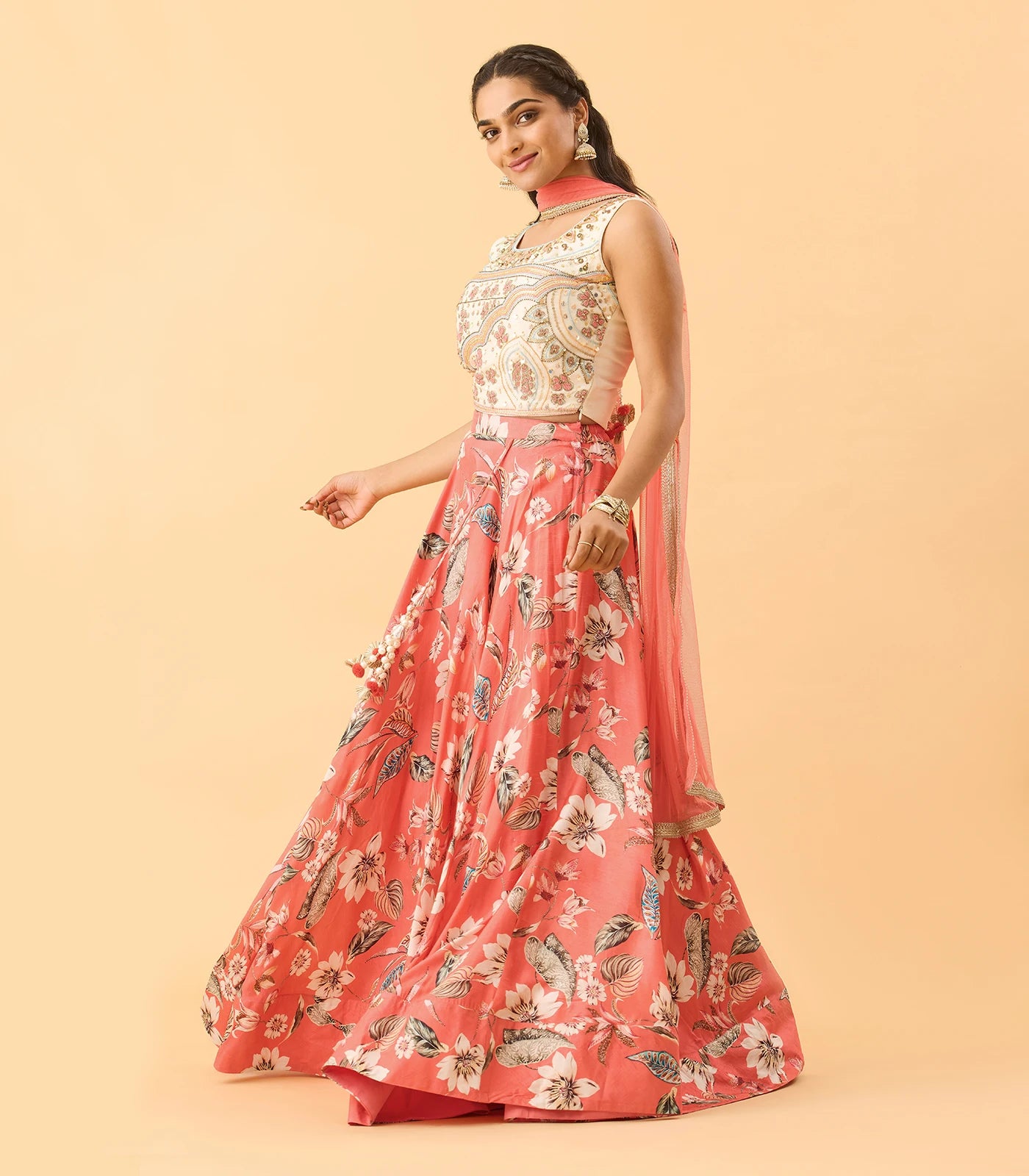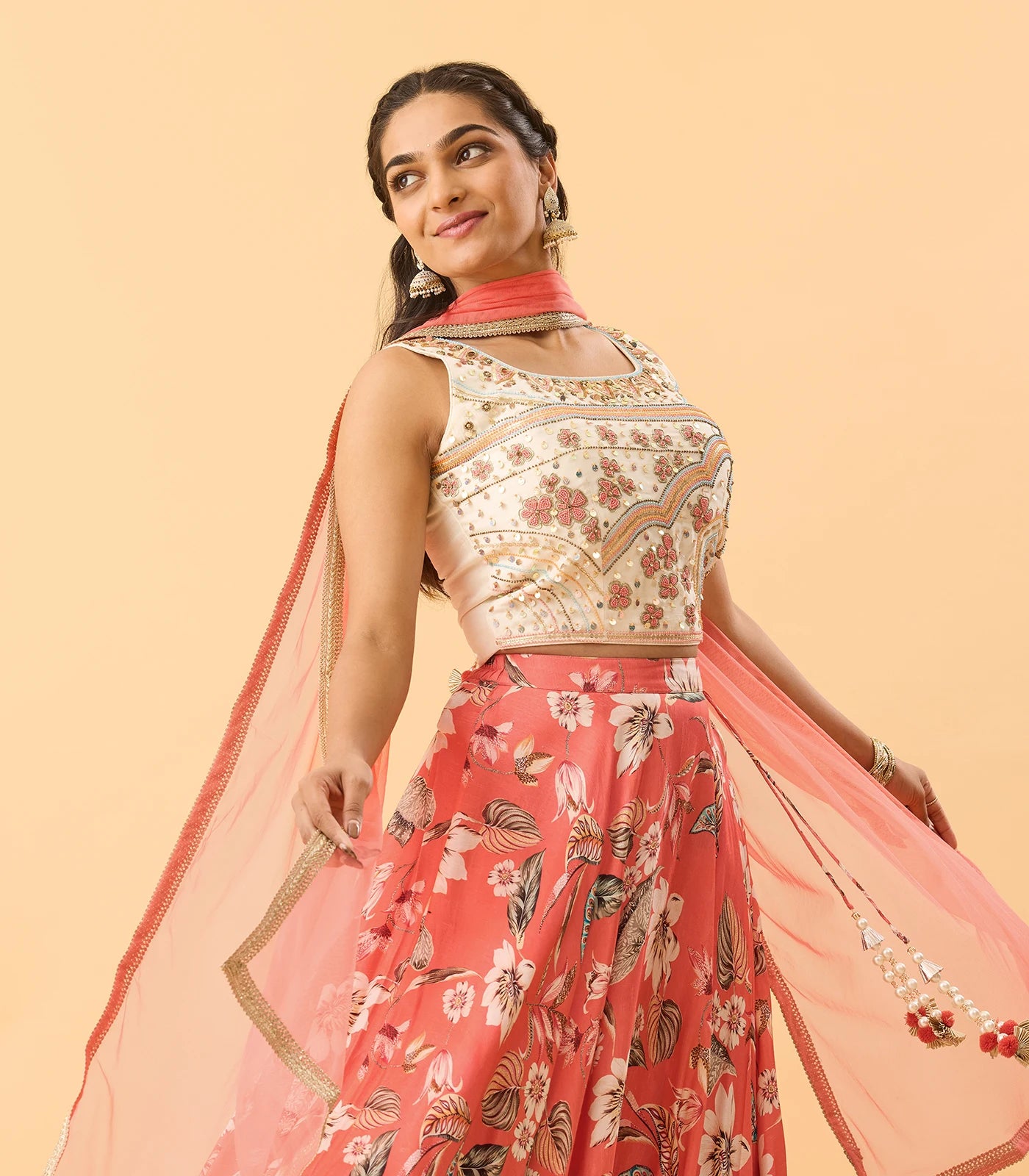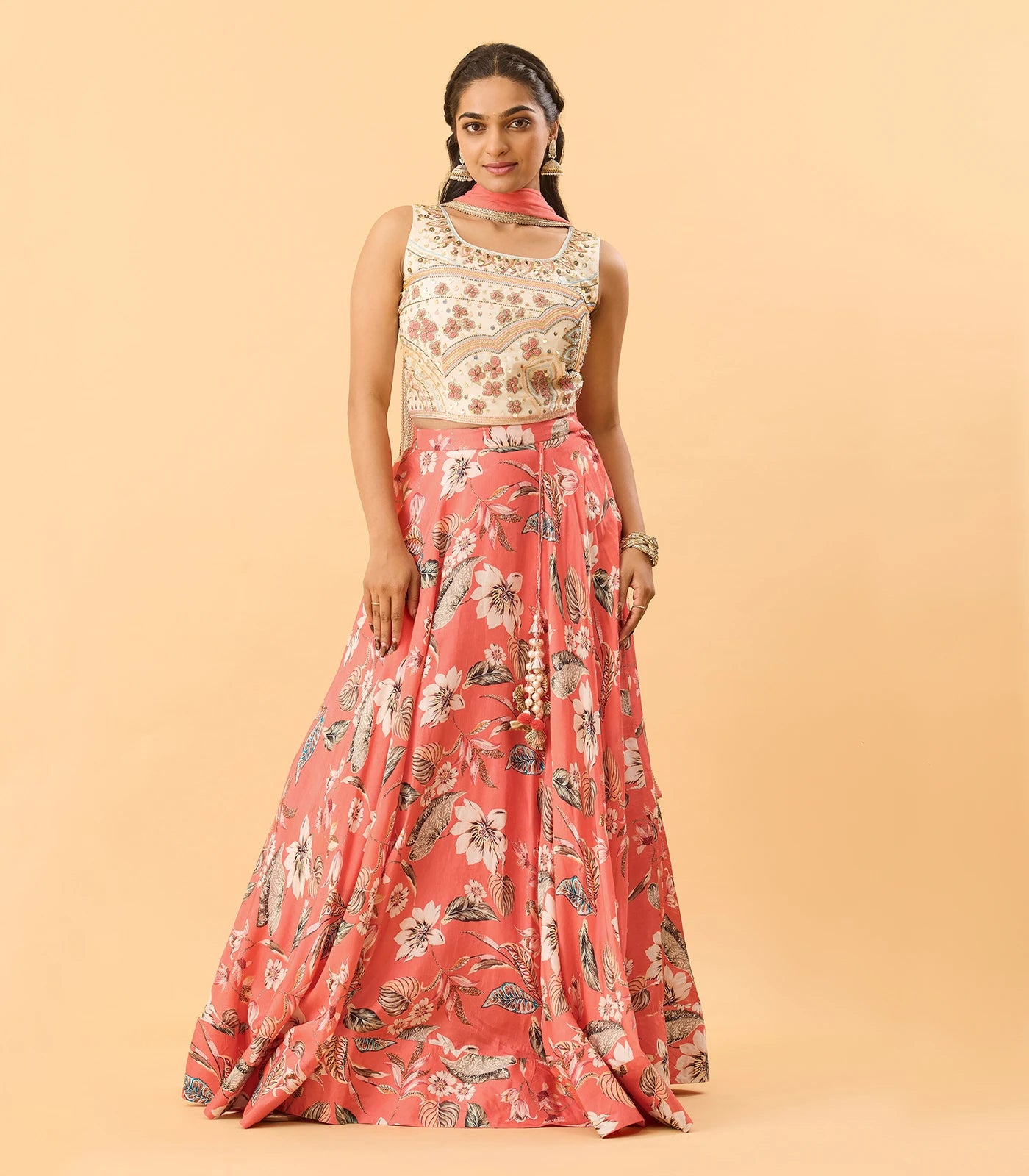 Embroidered Crop Top With Floral Printed Lehenga Skirt