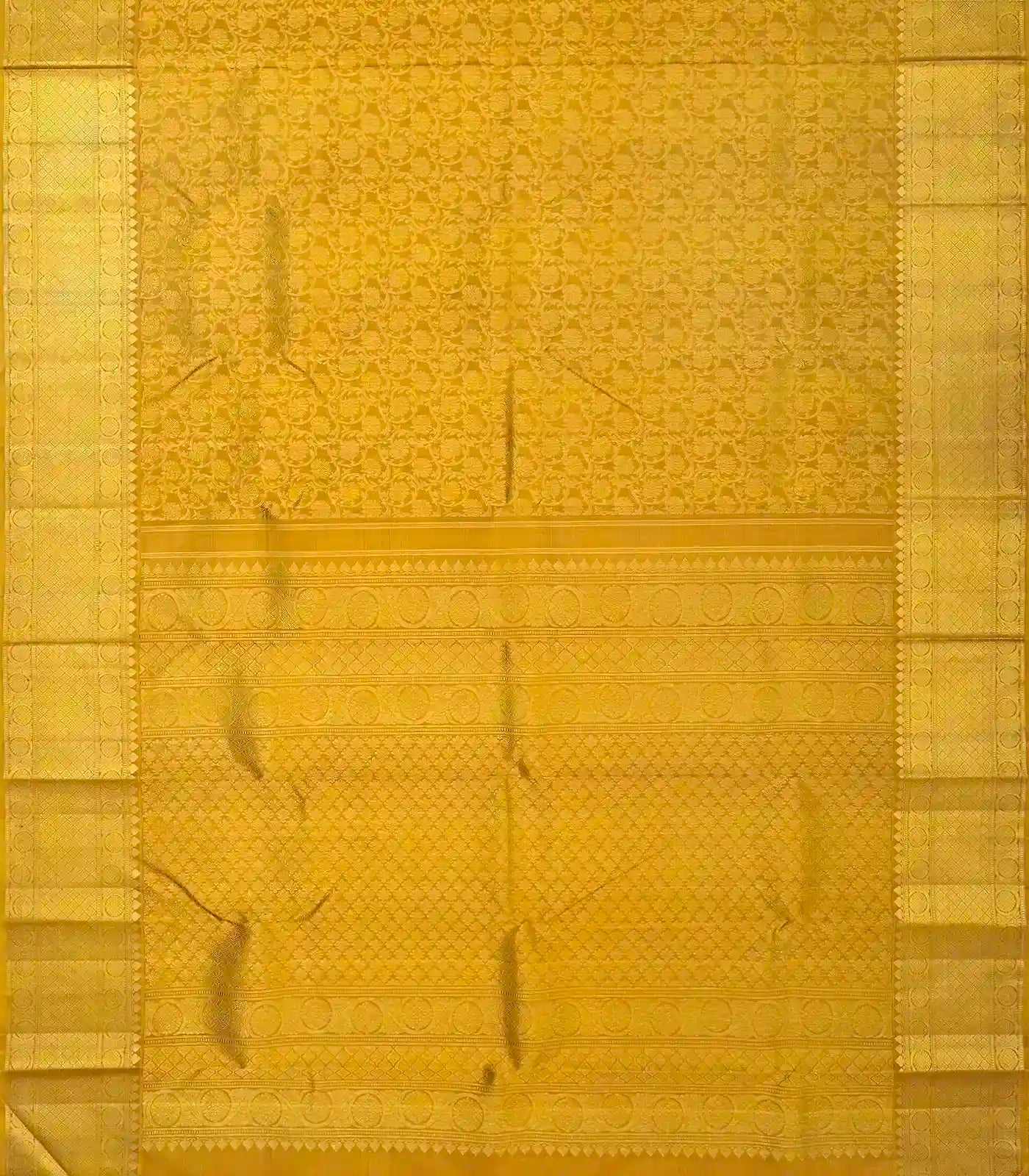 This handwoven kanchipuram silk saree is filled with floral vine motifs in gold body along with zari border and pallu