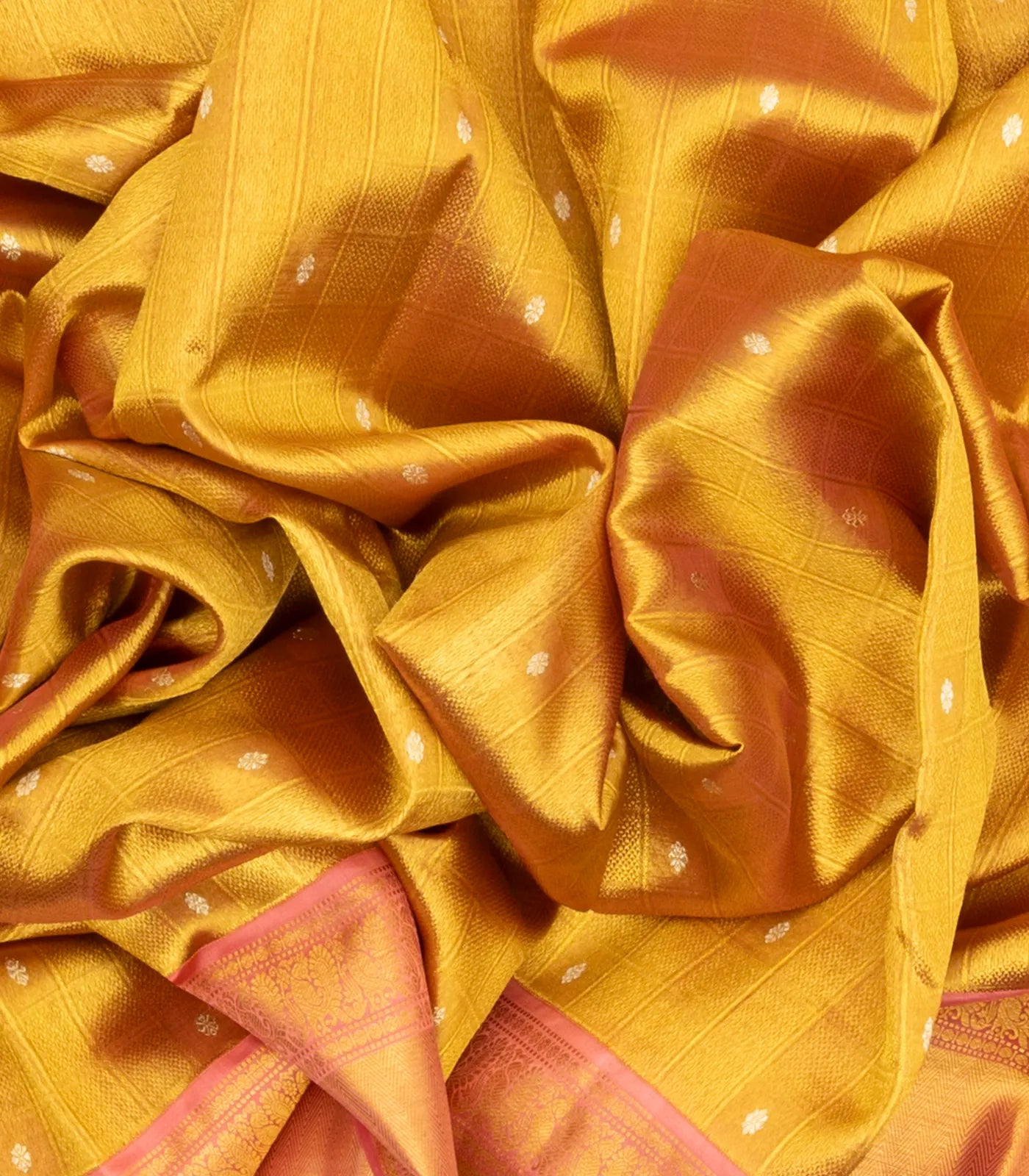 This handwoven korvai tissue kanchipuram silk saree is filled with checks in golden body along with contrast border and pallu