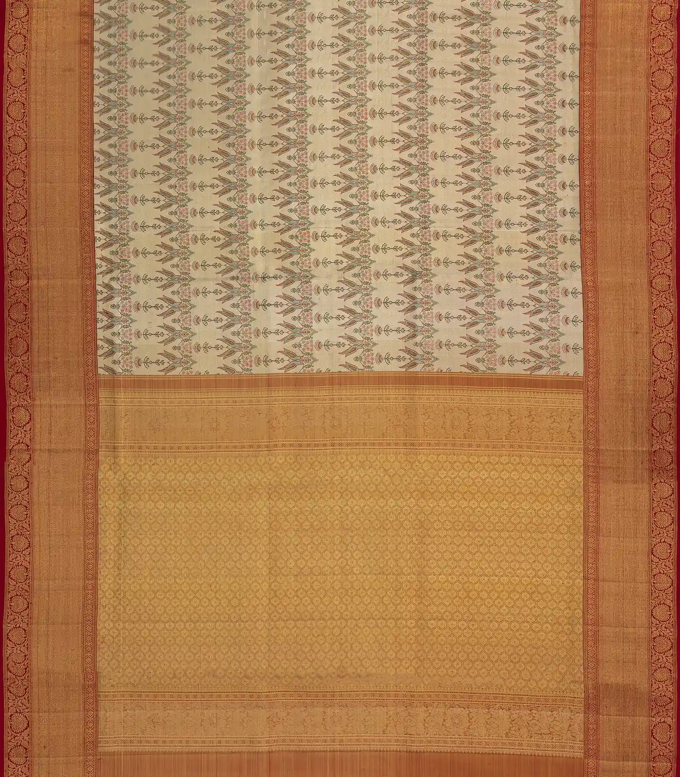 This handwoven tissue kanchipuram silk saree is filled with meena bird motifs in gold body along with contrast border and pallu