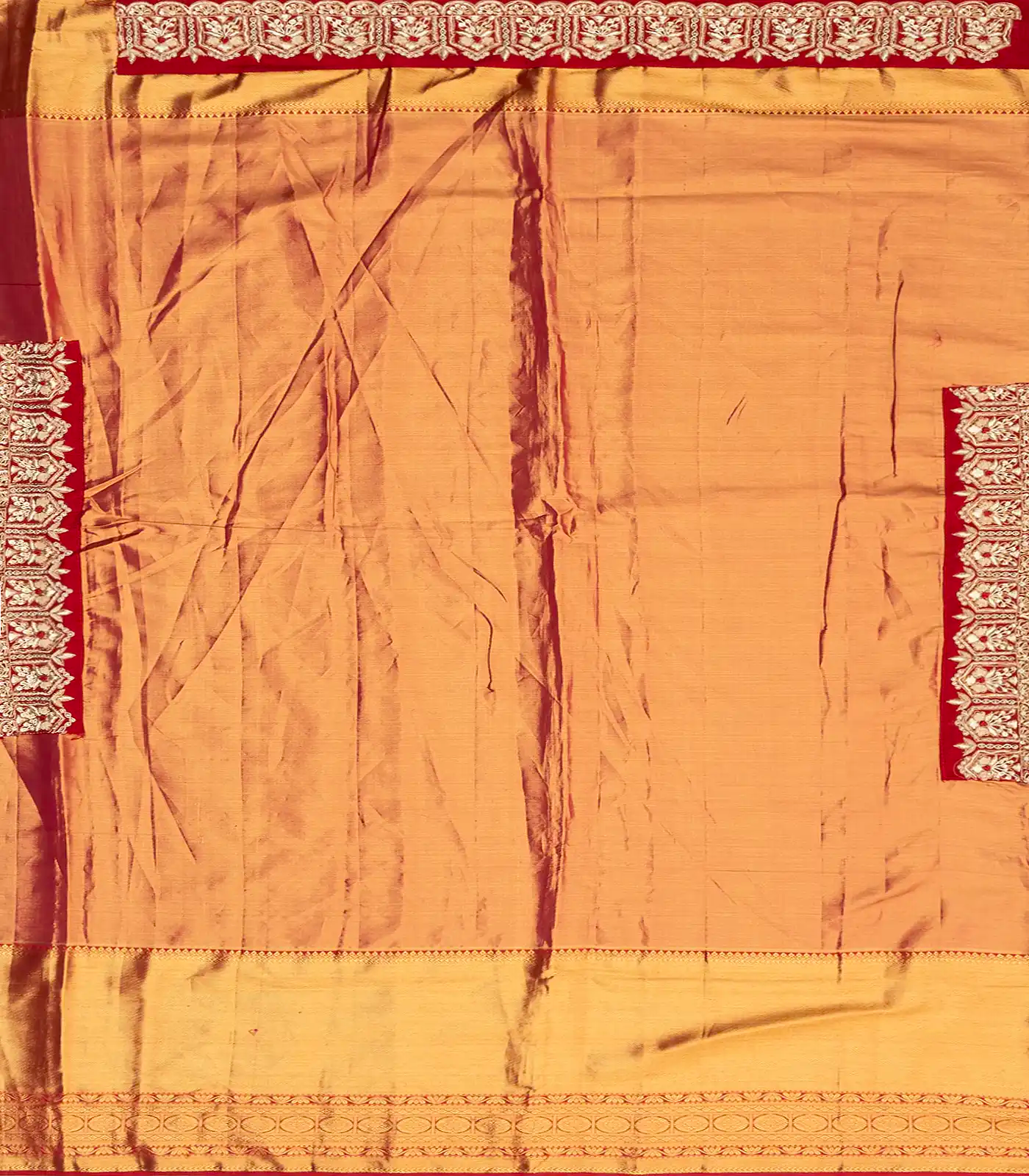 This handwoven tissue silk saree is filled with floral motifs in gold body along with zari border and pallu with hand embroidered selvage