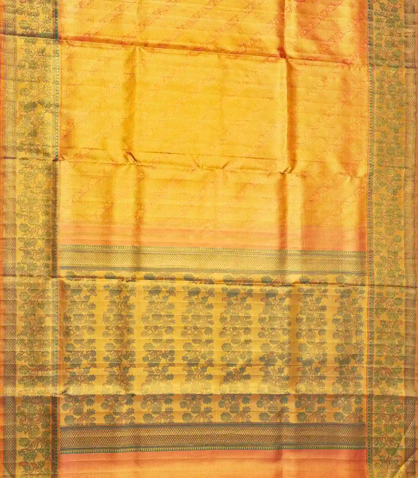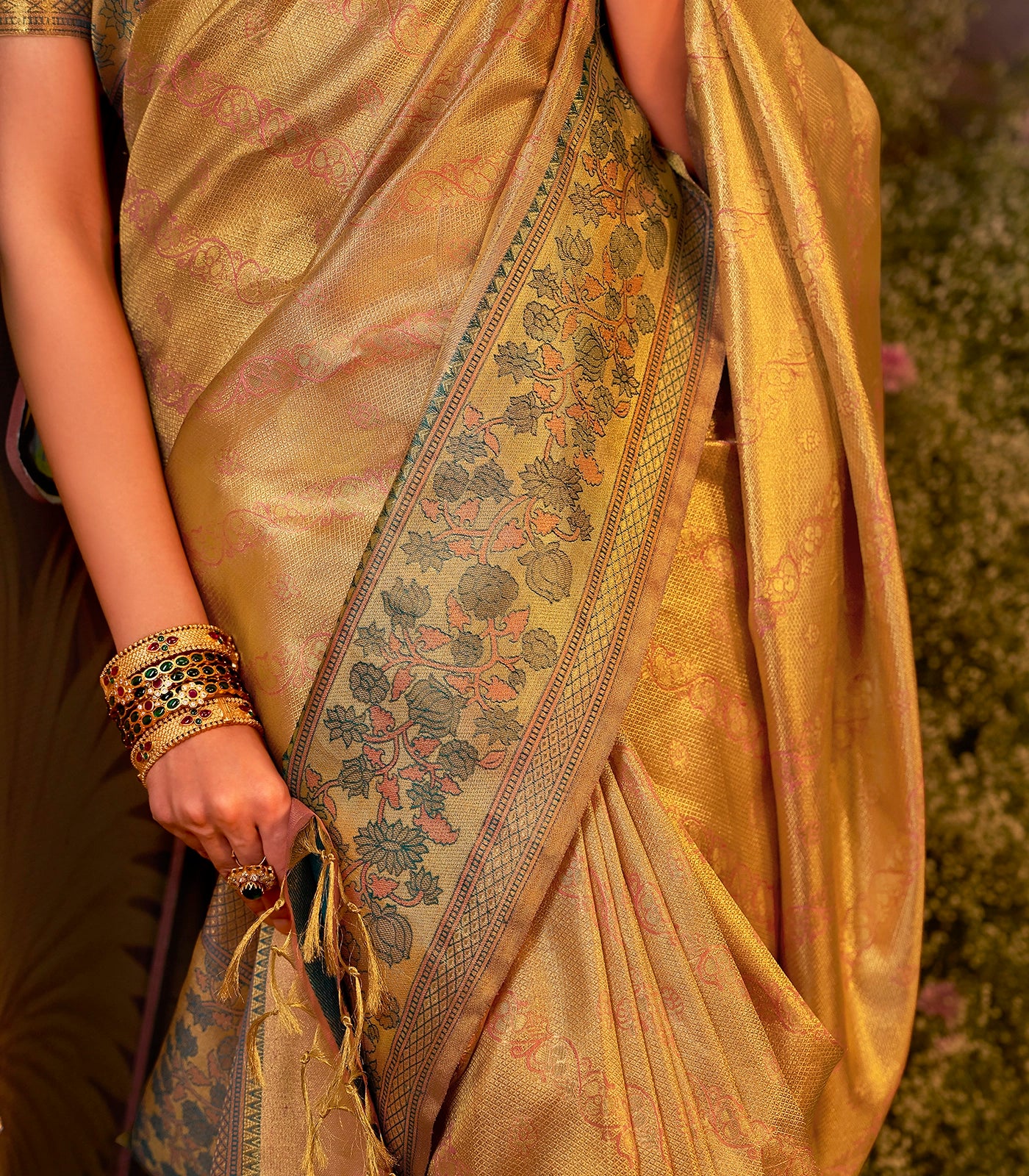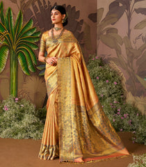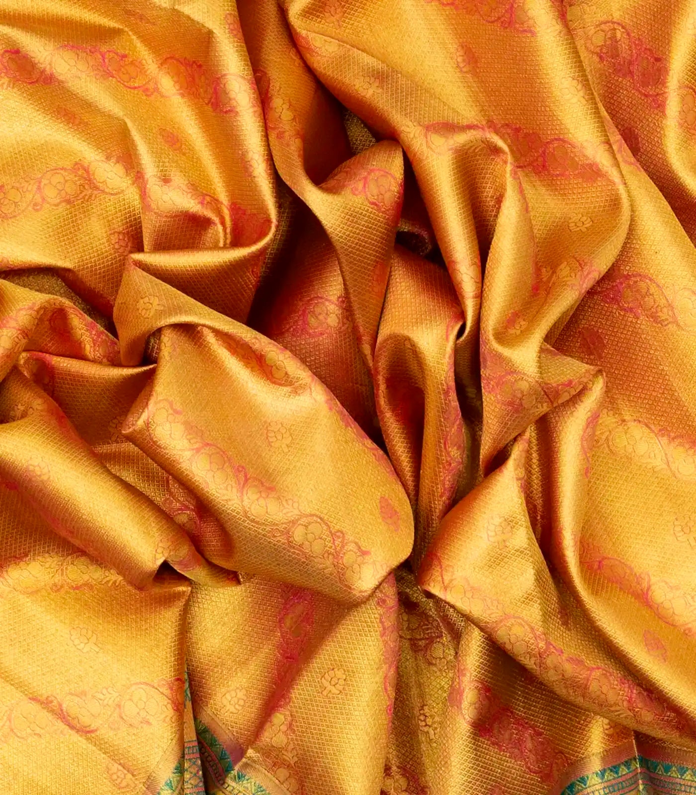A true embodiment of regal elegance, this handwoven tissue saree is a luminous masterpiece crafted using pure golden zari threads. Its mesmerizing Mayil Kan (Peacock Eye) canvas shimmers across the body. The soft radiance of gold is beautifully complemented by delicate floral (Kodi) motifs, meticulously woven using peach-colored silk threads for intricate Meenakari detailing. This artistic interplay of zari and silk lends the saree a rich texture and an ethereal glow, making it a breathtaking choice for a bridal ensemble.