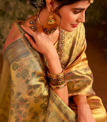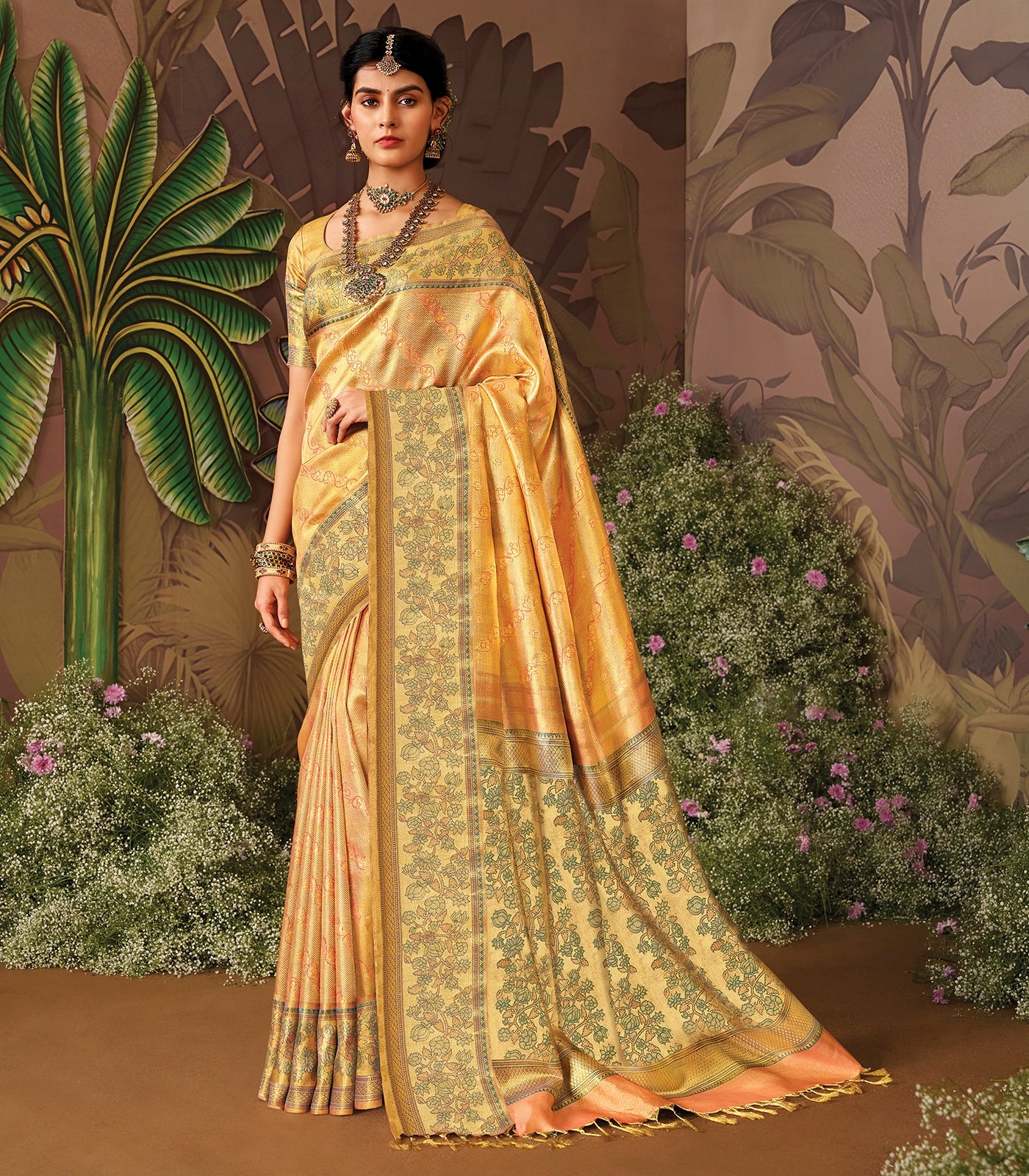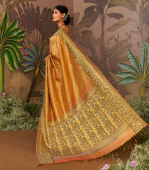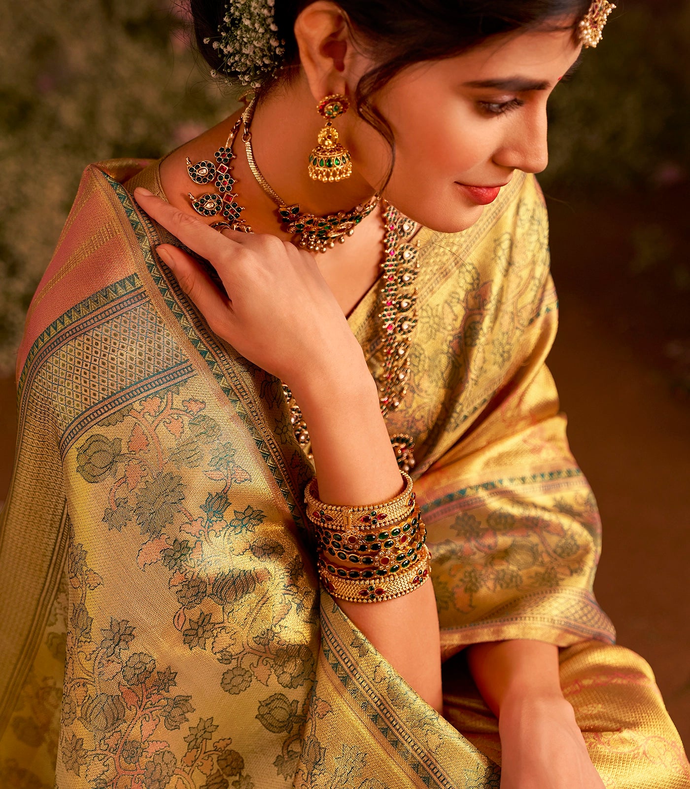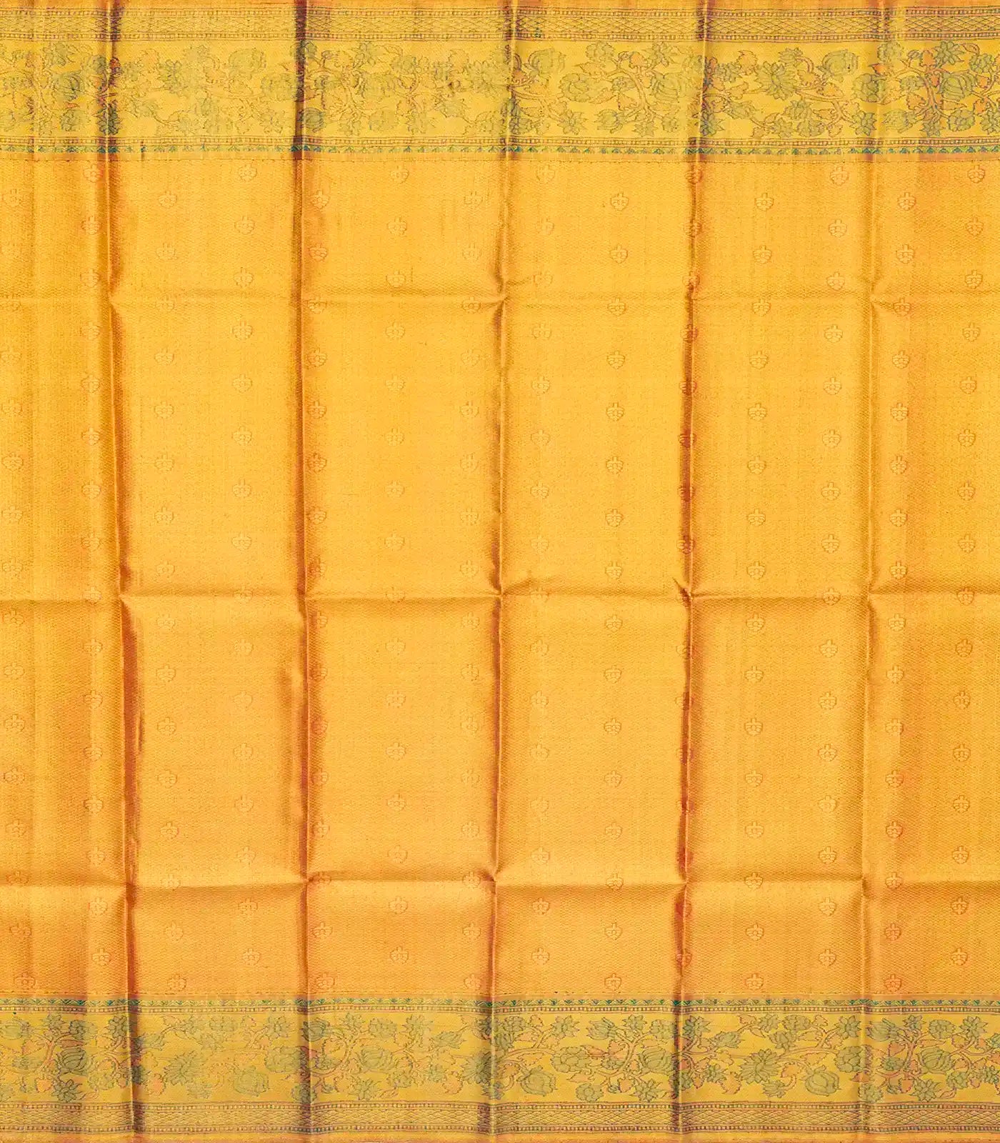 A true embodiment of regal elegance, this handwoven tissue saree is a luminous masterpiece crafted using pure golden zari threads. Its mesmerizing Mayil Kan (Peacock Eye) canvas shimmers across the body. The soft radiance of gold is beautifully complemented by delicate floral (Kodi) motifs, meticulously woven using peach-colored silk threads for intricate Meenakari detailing. This artistic interplay of zari and silk lends the saree a rich texture and an ethereal glow, making it a breathtaking choice for a bridal ensemble.
