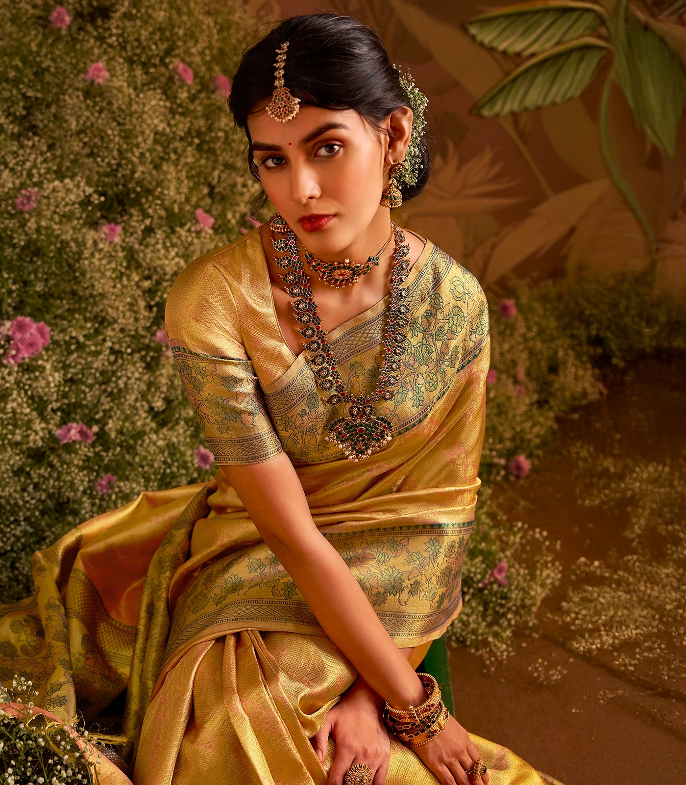 Designed to drape like liquid gold, this saree is a handwoven masterpiece from RmKV Design Studio, where tradition meets impeccable craftsmanship. Its luxurious texture, luminous sheen, and intricate detailing make it a timeless treasure, perfect for the bride who desires a blend of tradition, artistry, and opulence on her special day.