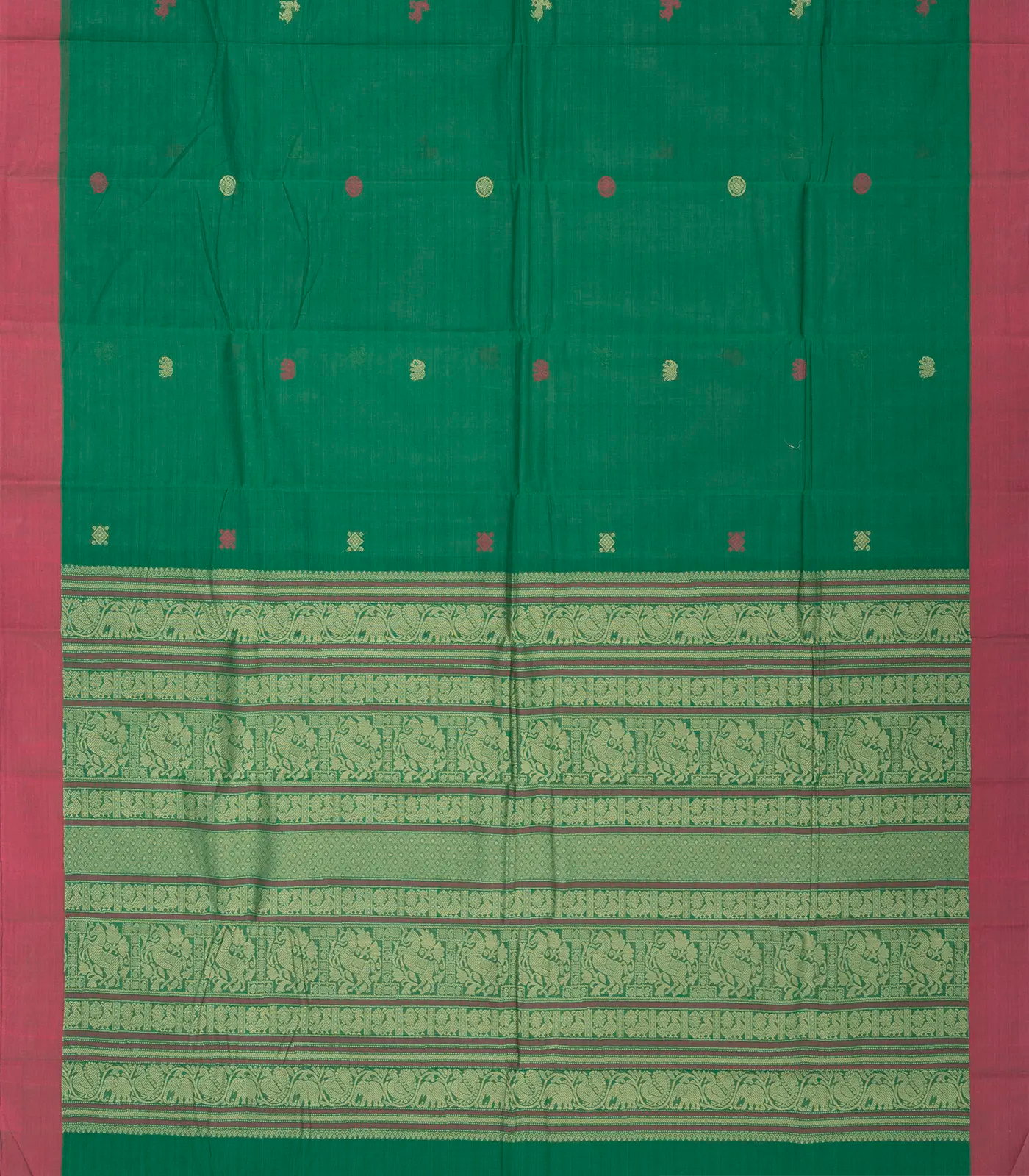 Green Handloom Kanchi Cotton Saree With Elephant Motifs-KC1437