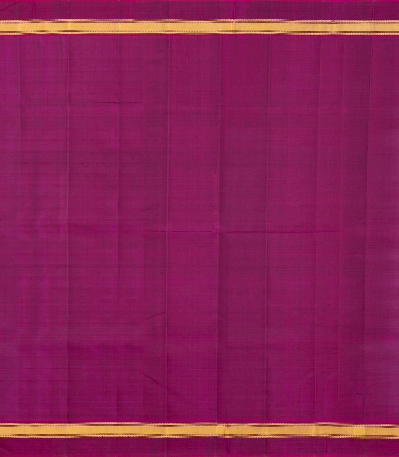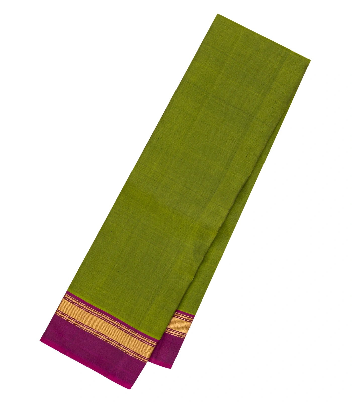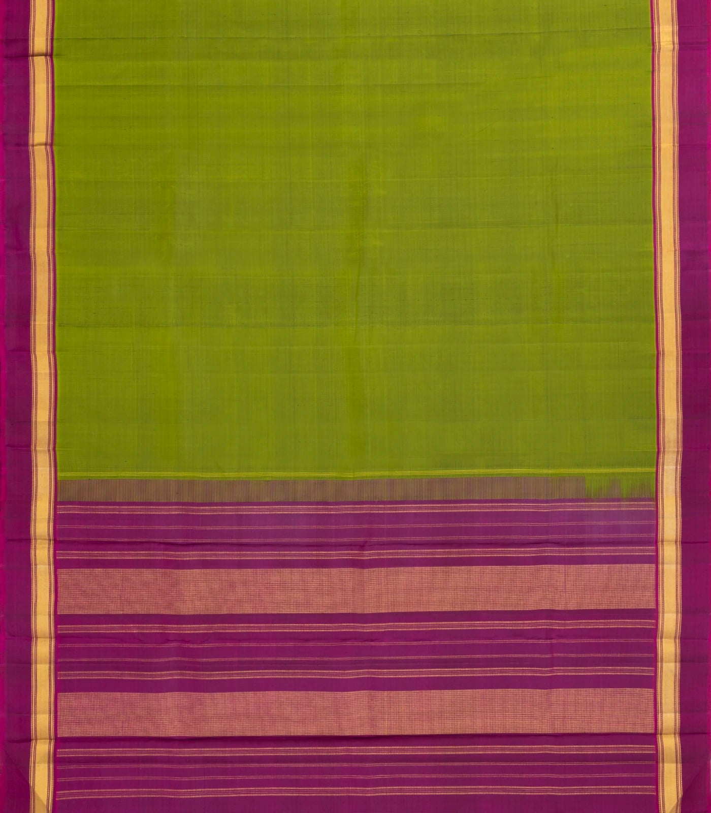 This handwoven kanchipuram silk saree is filled with plain green body along with contrast magenta border and pallu