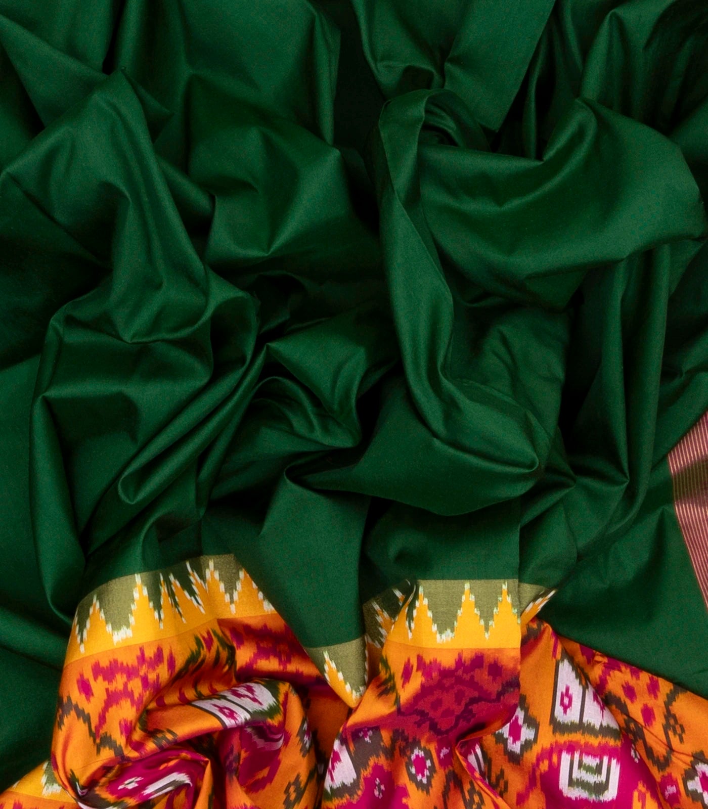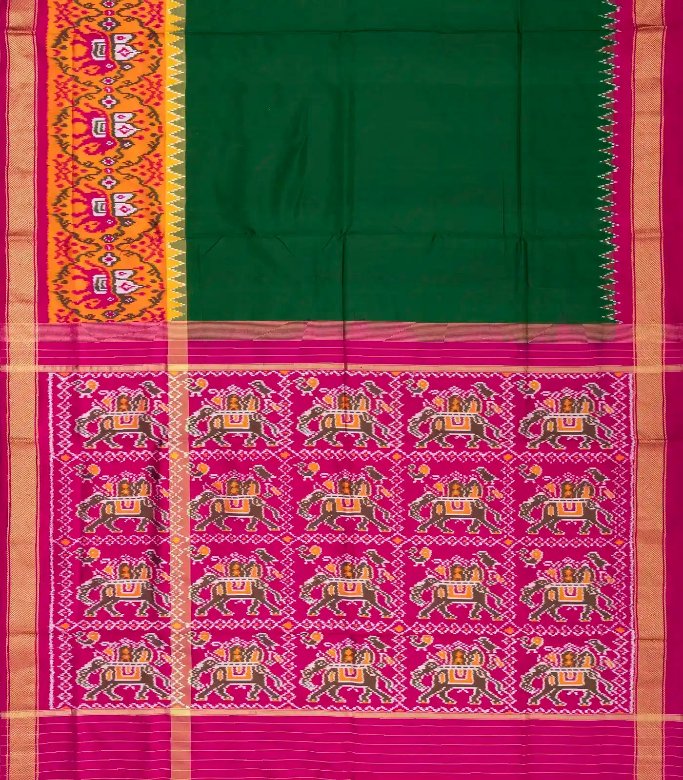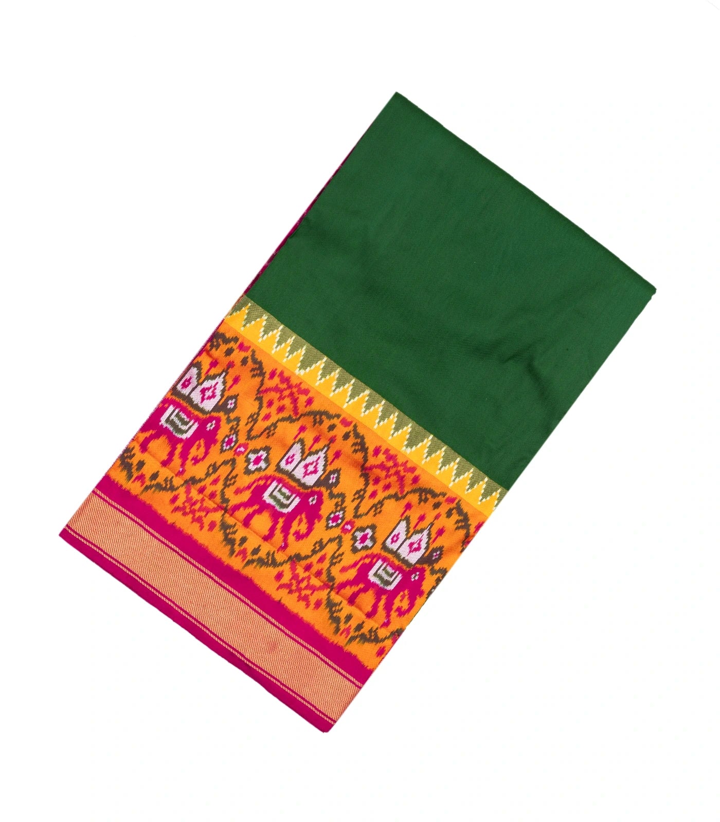 This handwoven pochampally ikat silk saree is filled with plain green body along with tie & dye animal motifs in contrast border and pallu