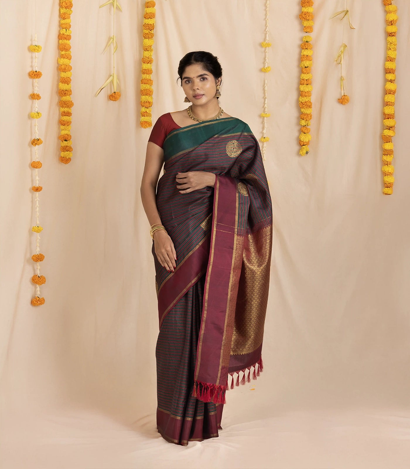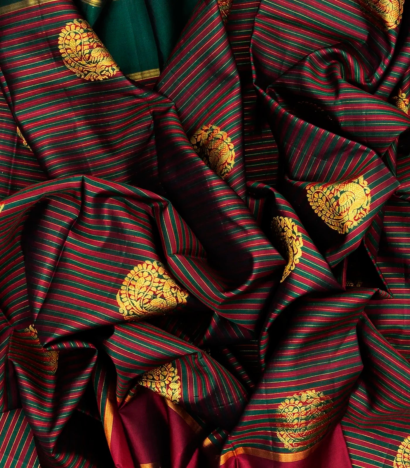 This handwoven kanchipuram silk saree is filled with stripes & buttas in body along with green and maroon border and pallu