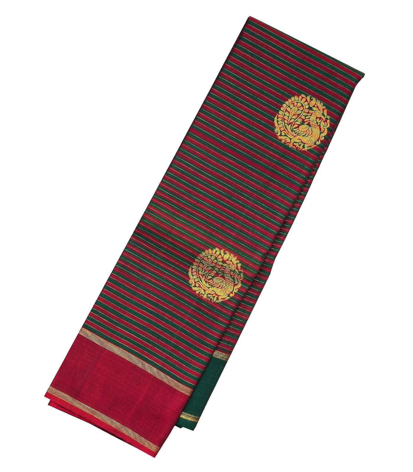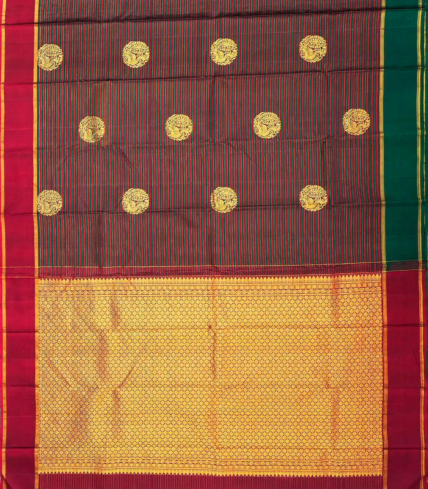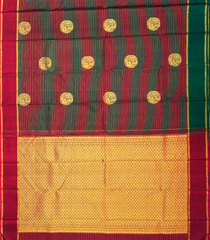 Green & Maroon Handloom Kanchipuram Silk Saree With Stripes & Buttas-KA12089