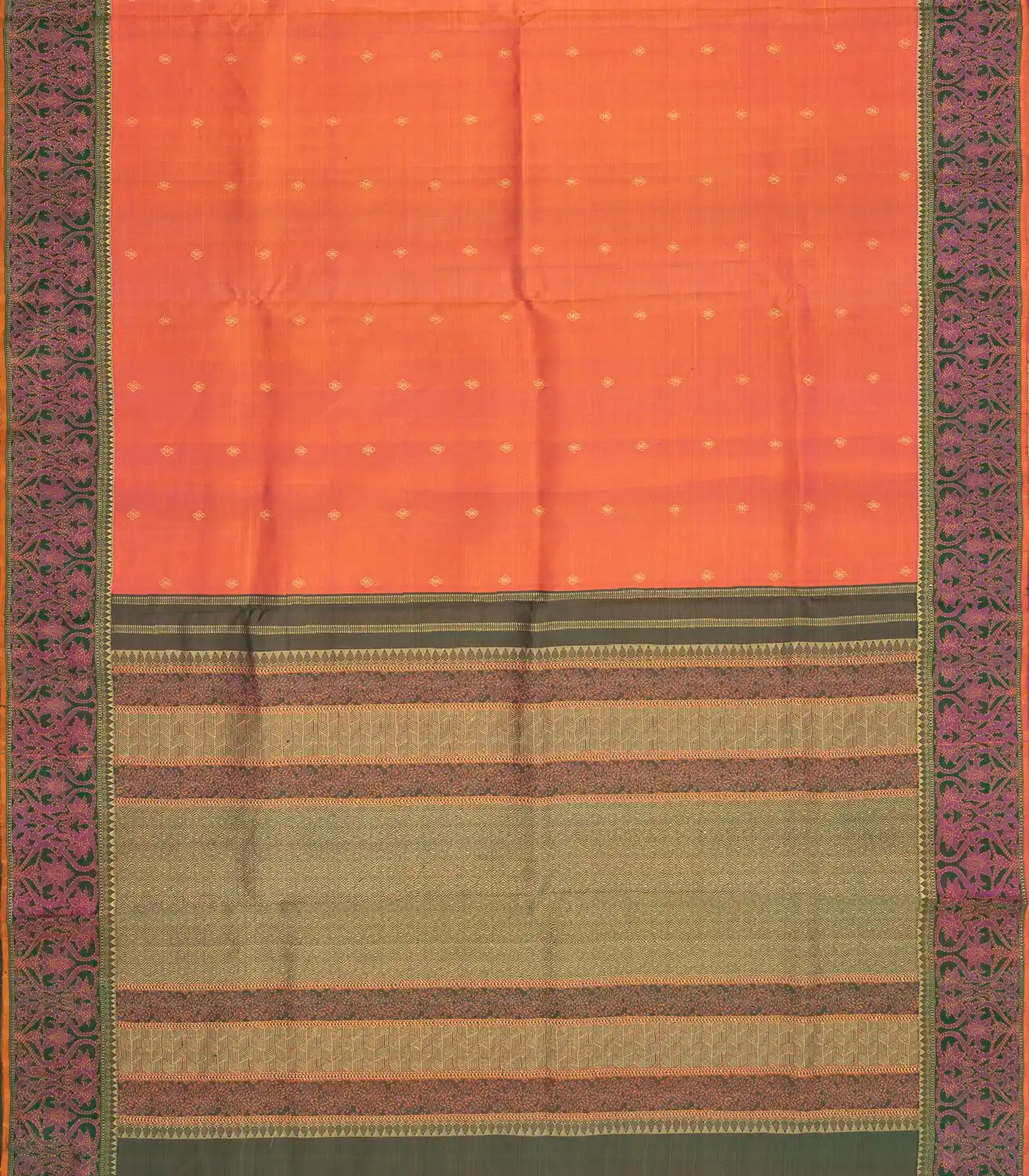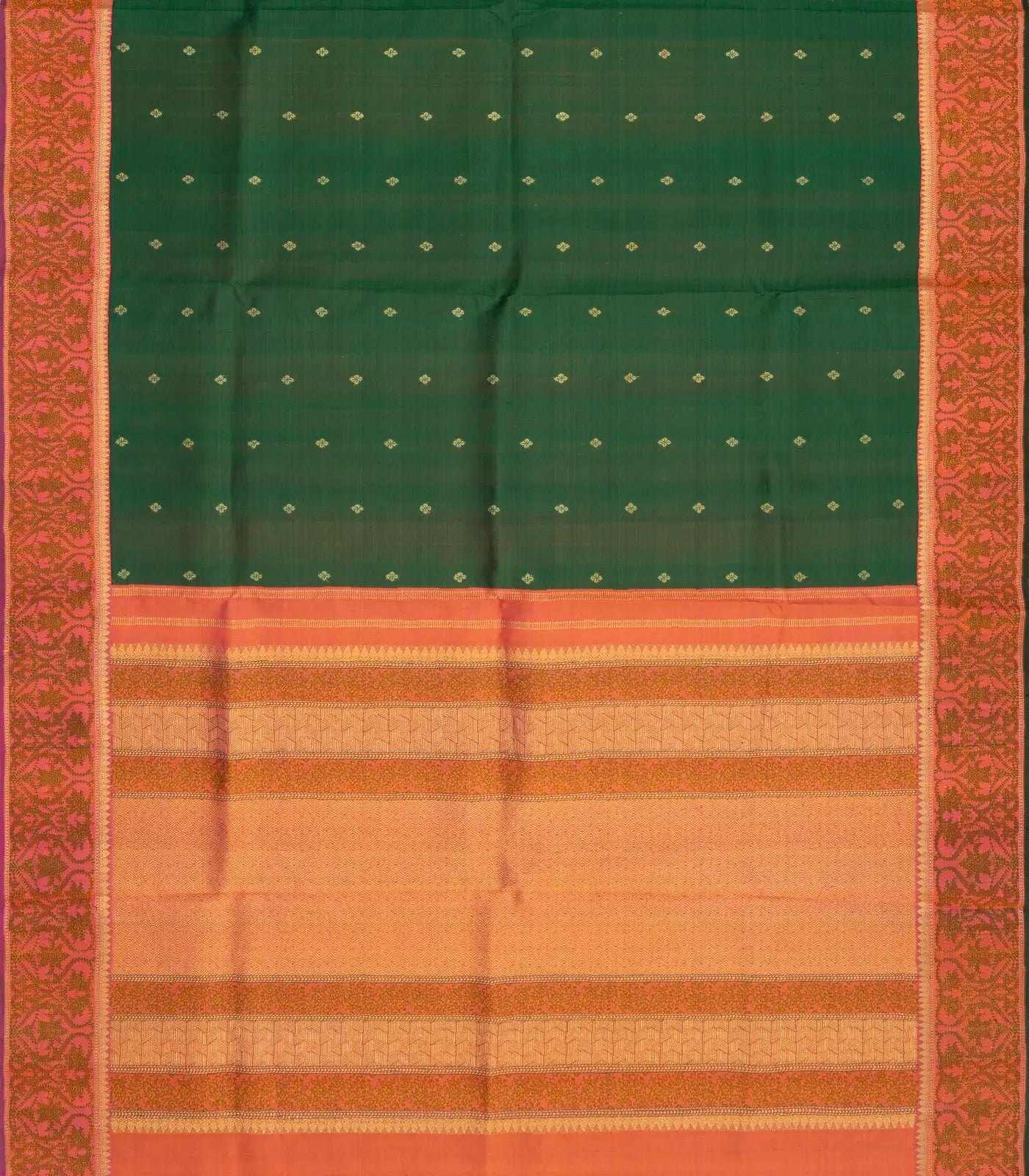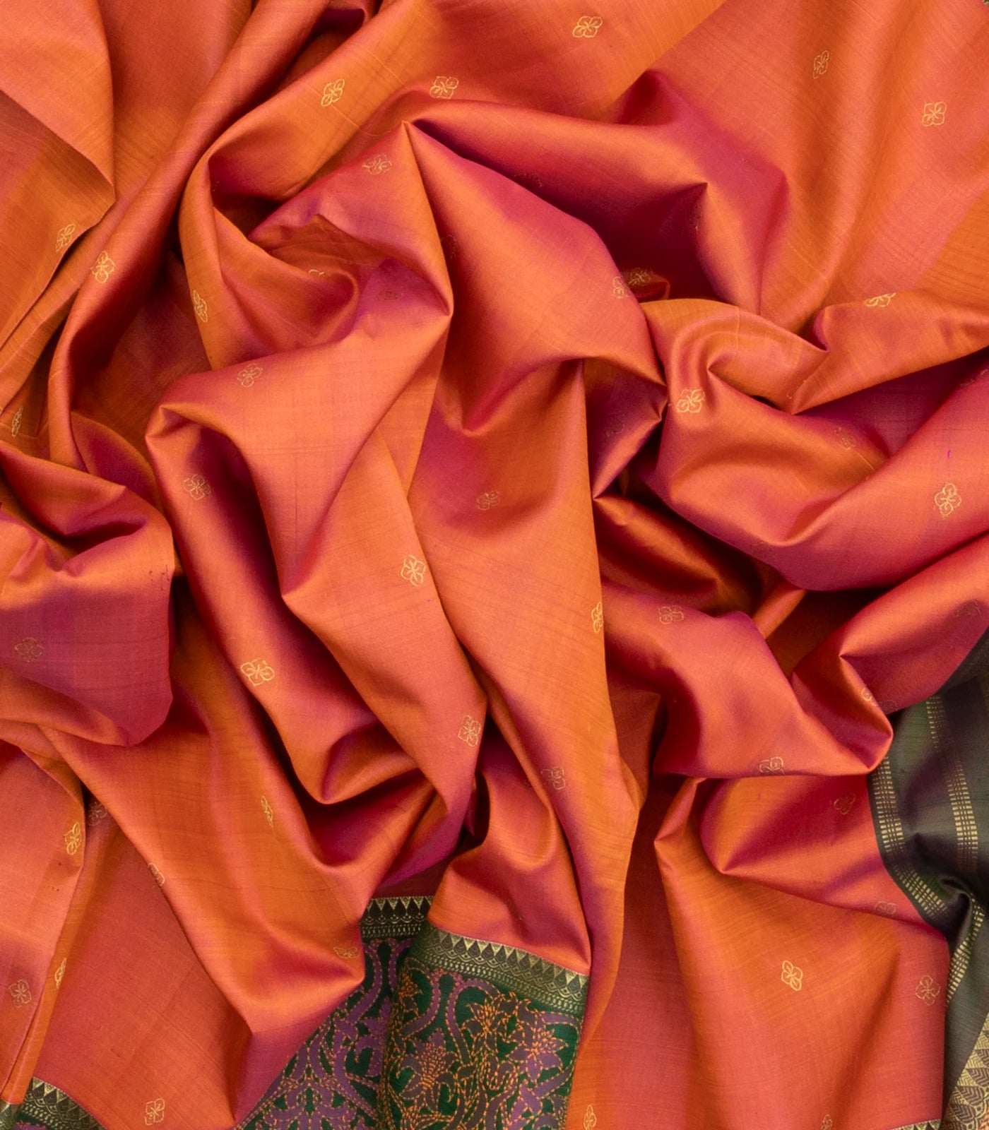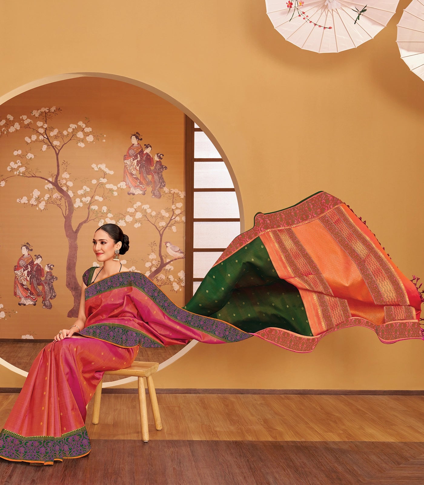 One side reveals a rich, dark green body; the other glows in a sunset orange. Each side is paired with its own contrasting border and pallu, allowing the wearer to shift moods and styles with every drape. Delicate Kikyo (bell flower) zari buttas grace the body, while the borders draw from the intricate beauty of Japanese Sashiko embroidery, floral patterns elegantly rendered in silk threads. The pallu features a harmonious medley of Sakura-inspired florals and geometric motifs, all woven in radiant golden zari for a touch of opulence.