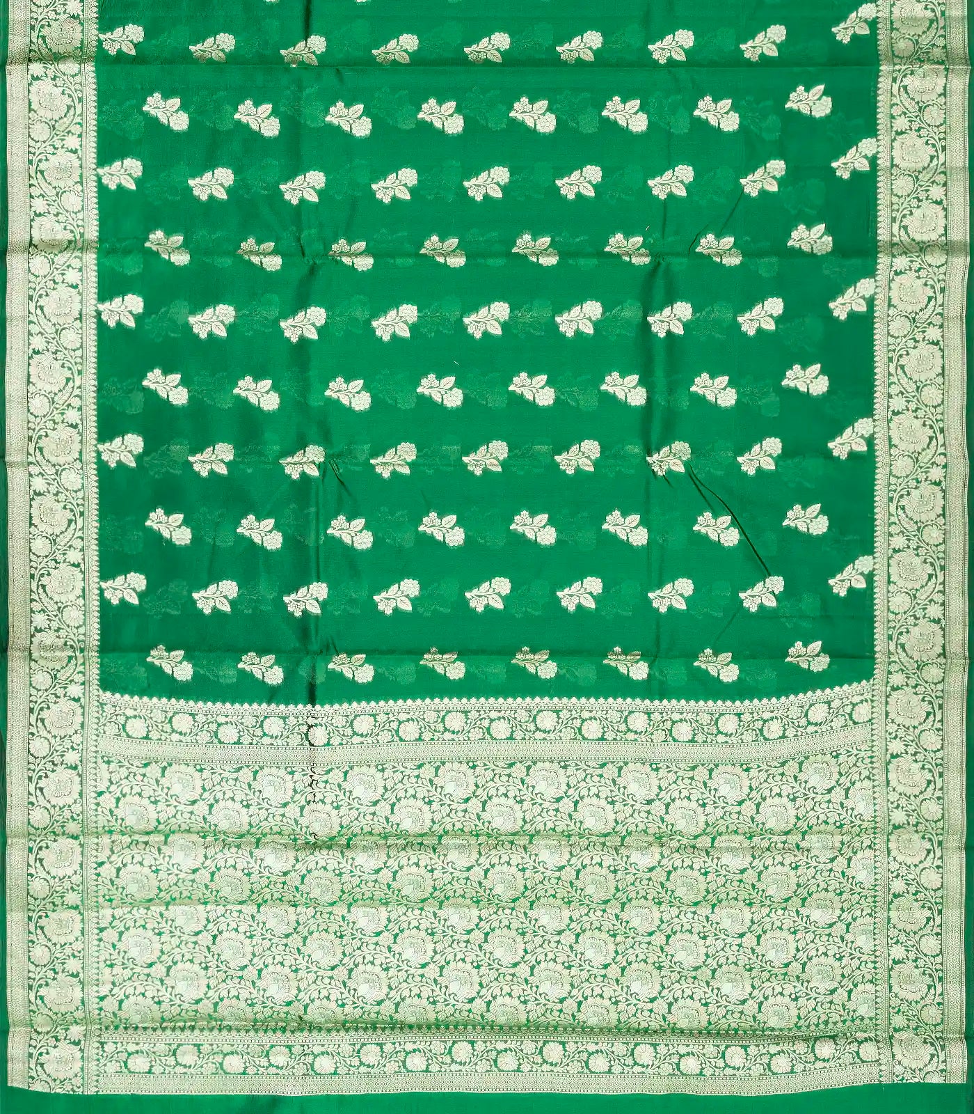 This woven dupion silk saree is filled with floral buttas in dark green body along with floral zari border and pallu