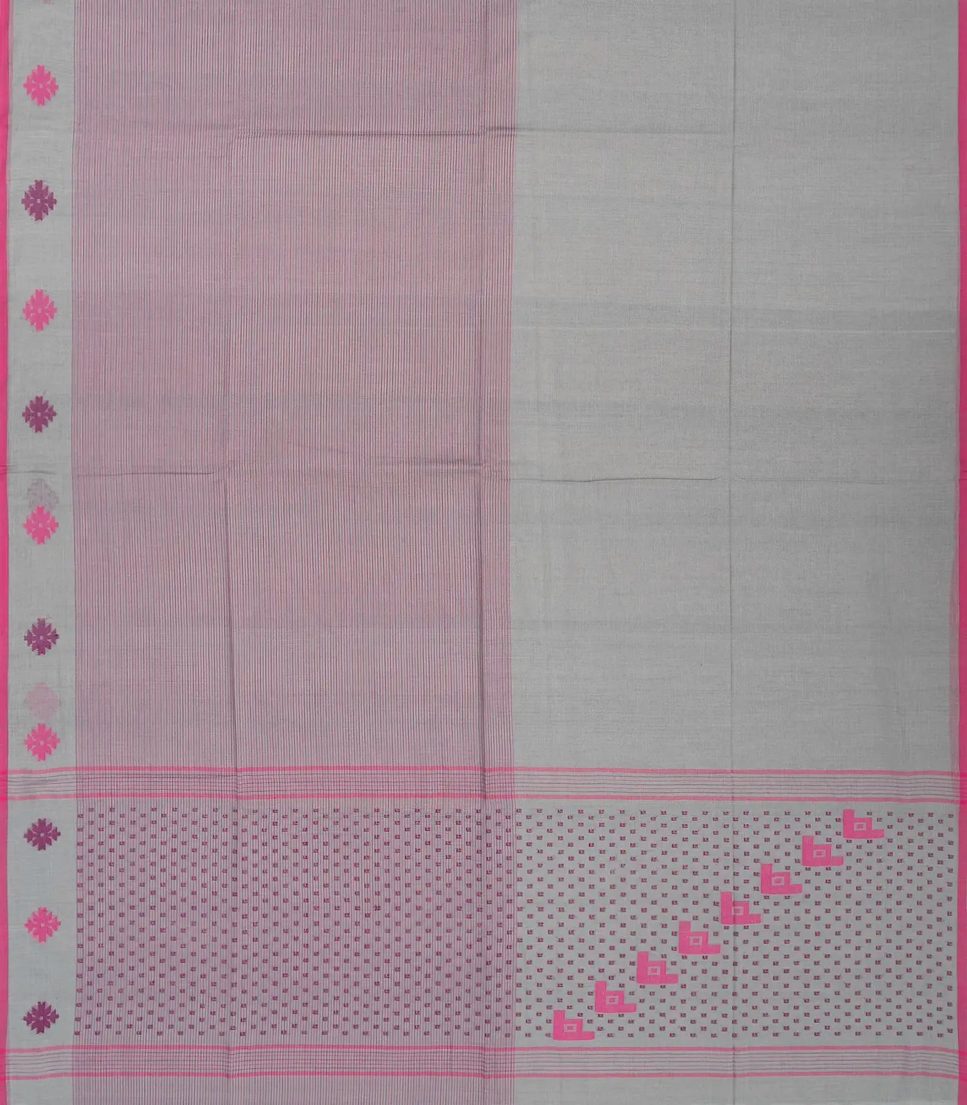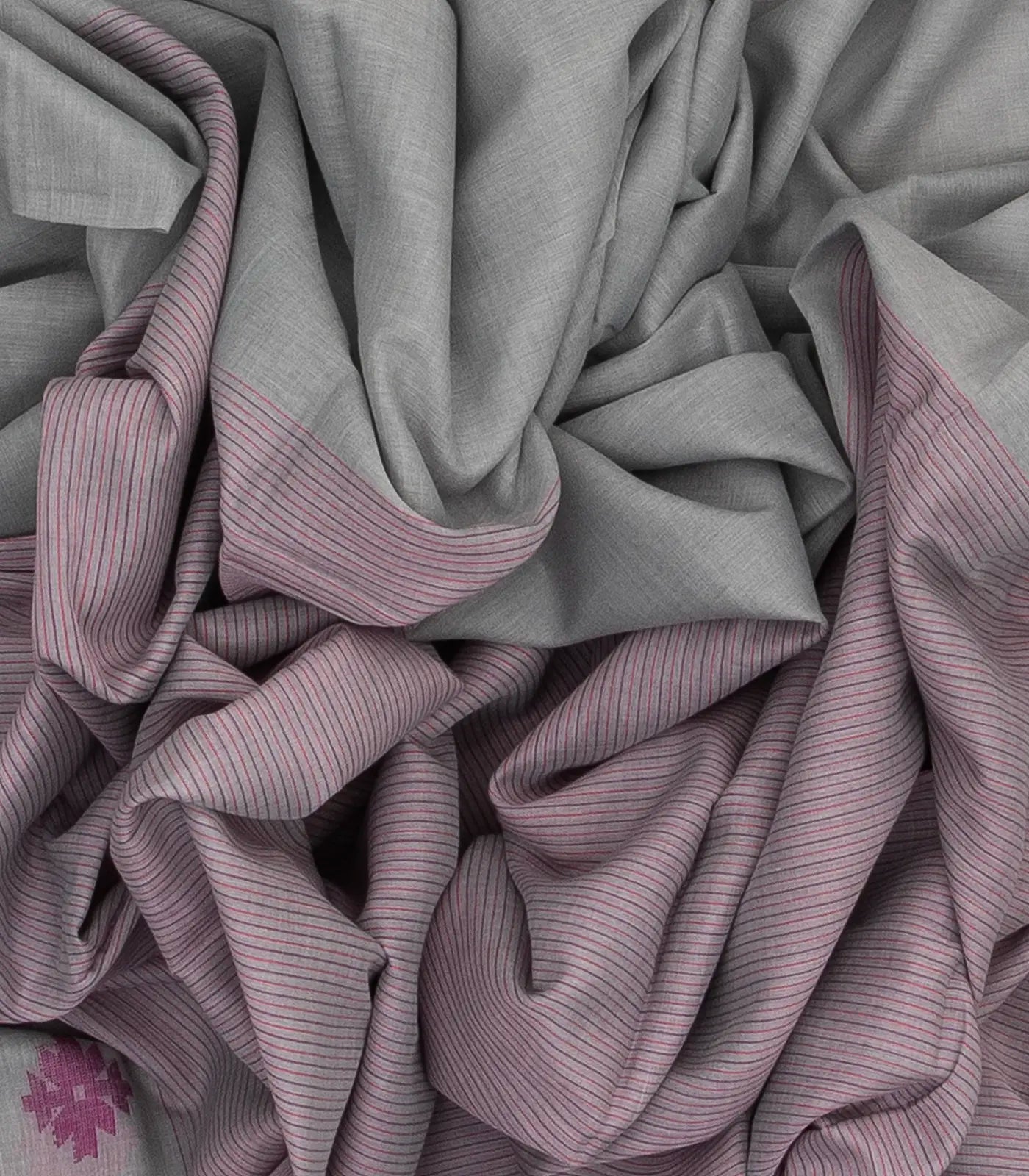 This handwoven bengal cotton saree is filled with stripes in grey body along with contrast border and pallu