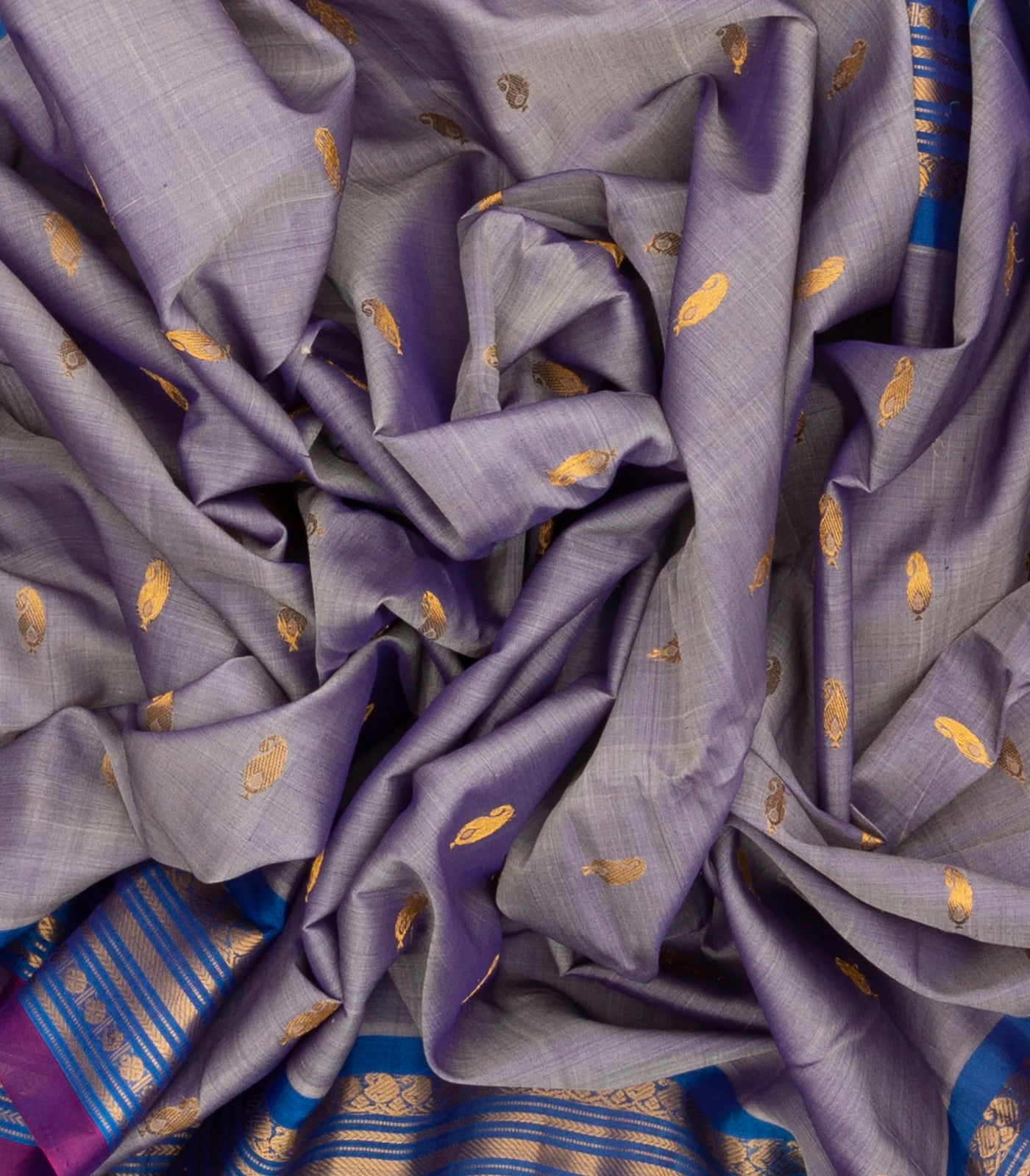 This handwoven gadwal silk cotton saree with buttas in grey body along with contrast border and pallu